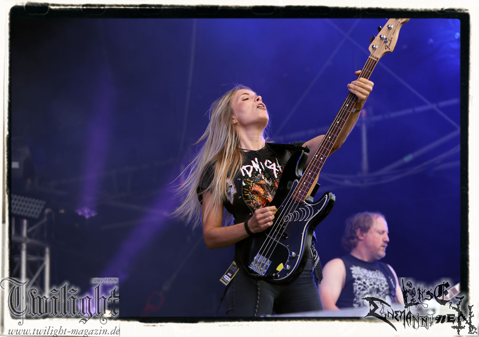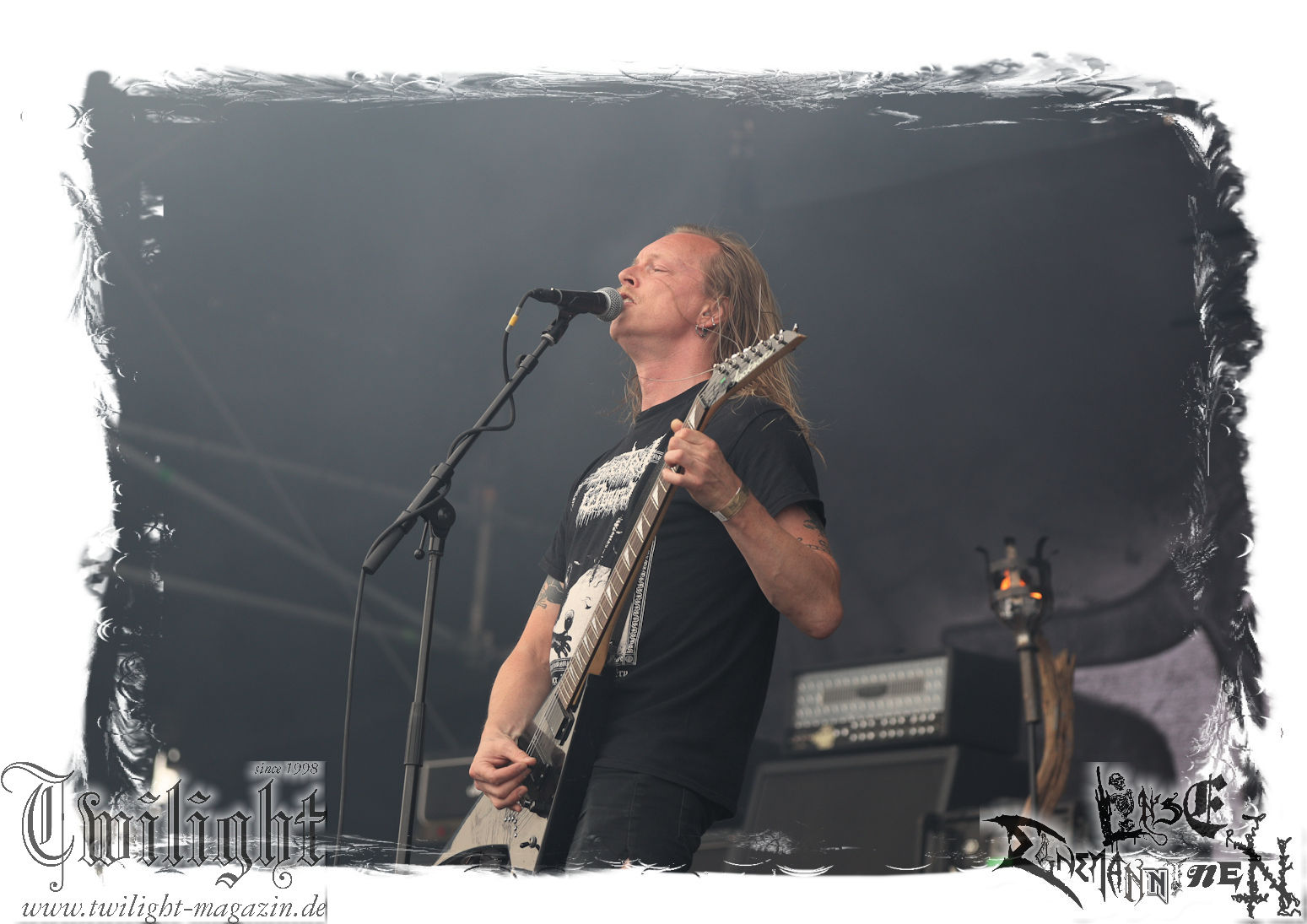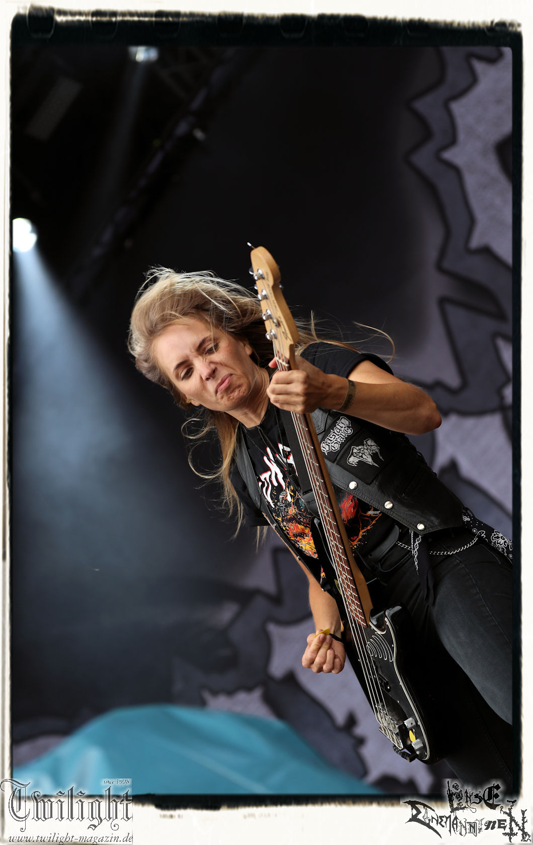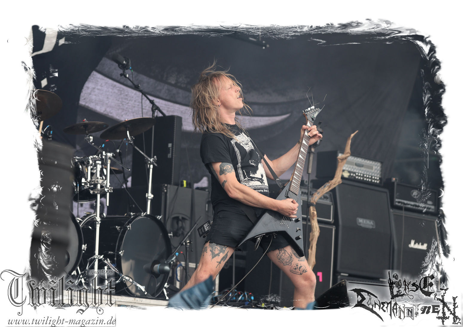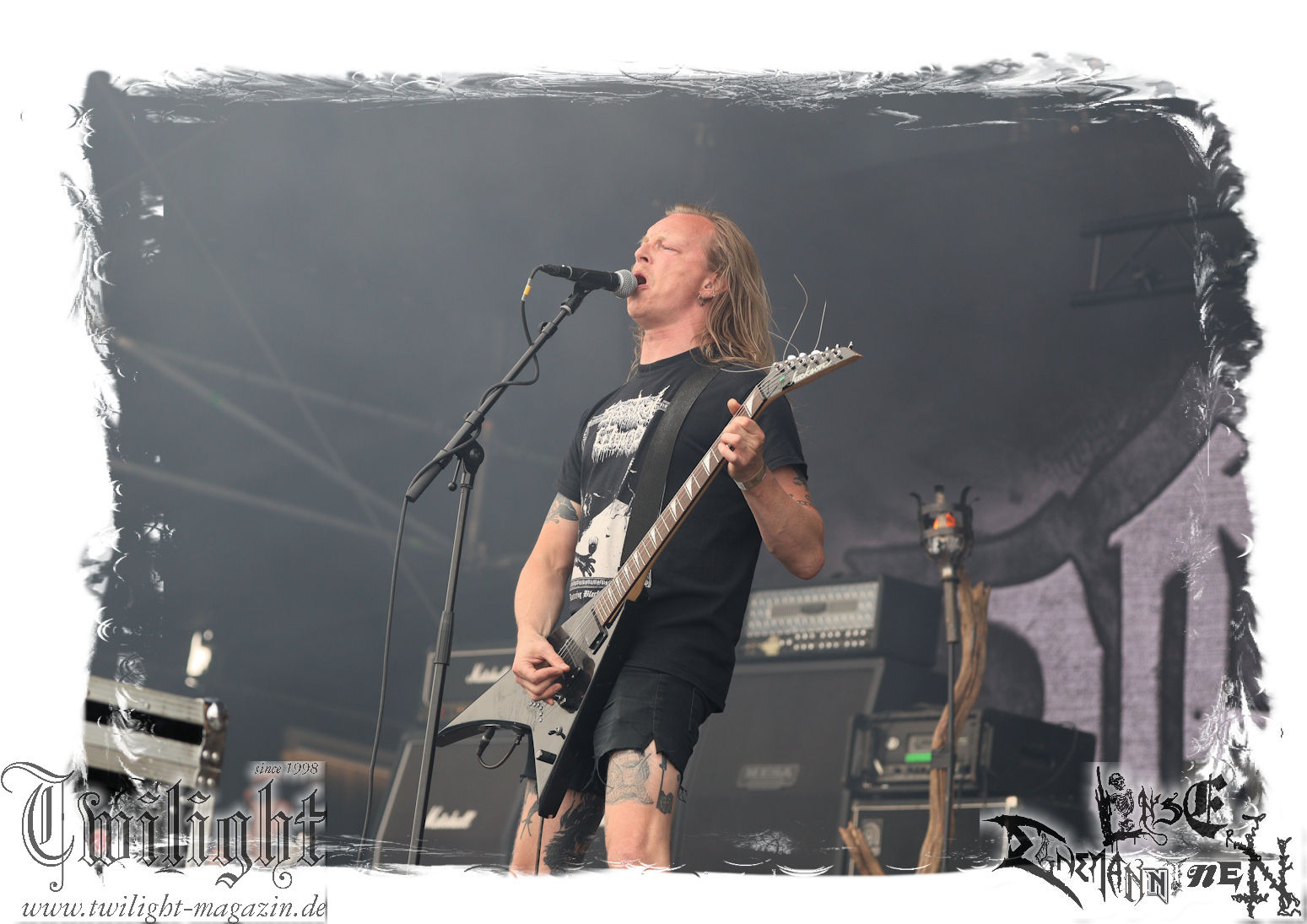 "Napalm In The Morning" kommt auch fett rüber und natürlich darf der Klassiker "Agent Orange" nicht fehlen. Die Band hat, was die Lightshow, die Pyros und Nebel angeht, eh ordentlich aufgefahren, aber bei diesem Song ballern sie echt alles raus und so geben nach und nach die drei Nebelmaschinen den Geist auf. Nebelwand pur, die durch die Beleuchtung, total geil aussieht, während sie auf uns zu wabert und es irgendwann stark nach Silvester riecht. Ich persönlich möchte in dem Moment ja nicht auf der Bühne stehen, denn Sauerstoff ist in dem Moment dort sicherlich ein rares Gut. Kultsongs wie "The Saw Is The Law" und "Blasphemer" stehen auch hoch auf der Liste und gerade "The Saw Is The Law" ist mir eine Freude, da der Song so schon ordentlich walzt, aber hier noch mal ein paar Schaufeln Steinkohle extra ins höllische Feuer geworfen werden. Gleiches gilt für "Nuclear Winter". Herrlich! Apropos Feuer, denn die, wie ich annehme, nächste Runde Bier entpuppt sich als Rauchfackeln und so wird es im Publikum auf einmal etwas nebelig. Wie nicht anders zu erwarten, wollen die Leute auf dem PARTY.SAN METAL OPEN AIR "Partisan" hören, auf den dann "Let's Fight In The Darkness Of Hell" folgt. Mit dem mächtigen Triumvirat "Remember The Fallen", "Ausgebombt" und "Bombenhagel" wird dann leider schon das Ende eines echt geilen Konzerts eingeläutet aber 18 Songs sind ja schon eine Ansage. Ich hätte noch gerne "Book Burning", „Conjuration", "Back To War", "One Step Over The Line", "Unbury The Hatchet", Polytoximaniac", "After The Deluge", "Capture The Flag", "Equinox", "Better Off Dead", "Bullet In The Head", "Sodomized", "That's What An Unknown Killer Diarized" und, und, und gehört, aber das wäre ja schon wieder ein ganzer Gig an sich gewesen, hahaha. Aber auch so ist das hier ein grandioser Moment und so nimmt das PARTY.SAN, was Konzerte angeht, nach dem letzten Song und frenetischem Jubel sein Ende. Wir werden mit dem Steigerlied entlassen. Da werden die Goldkehlchen der Harzer und Braunschweiger vom Twilight Magazin und Hotel666 natürlich nochmal gefordert, wie auch beim anschließenden und absolut passenden Fury In The Slaughterhouse-Hit "Won't Forget These Days", mit dem uns das PARTY.SAN 2024 in die Nacht entlässt. Wer aus Niedersachsen singt da nicht voller Inbrunst mit? Genau, und so zieht es einige von uns noch singend ins Party-Zelt oder Leute wie mich ins eigene Zelt, um irgendwann glücklich einzuschlafen. Bleibt mir noch zum Schluss ein groooooooßes Dankeschön, Küsse und Liebe an das PARTY.SAN, deren ganze Crew und allen, die noch daran mitgewirkt haben, zu schicken, denn es war wieder eine absolut geile, geile, geile Zeit bei euch und ich freue mich jetzt schon mega, nächstes Jahr wieder bei euch sein zu dürfen! (Rudi)