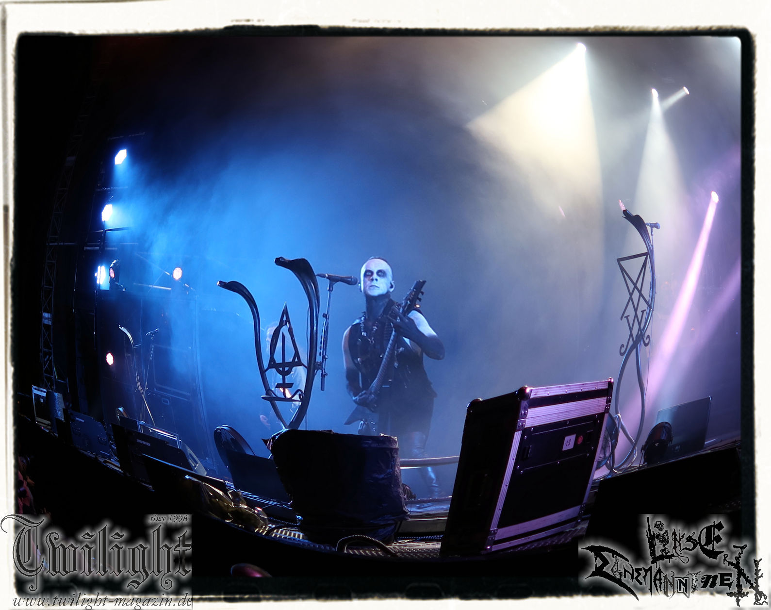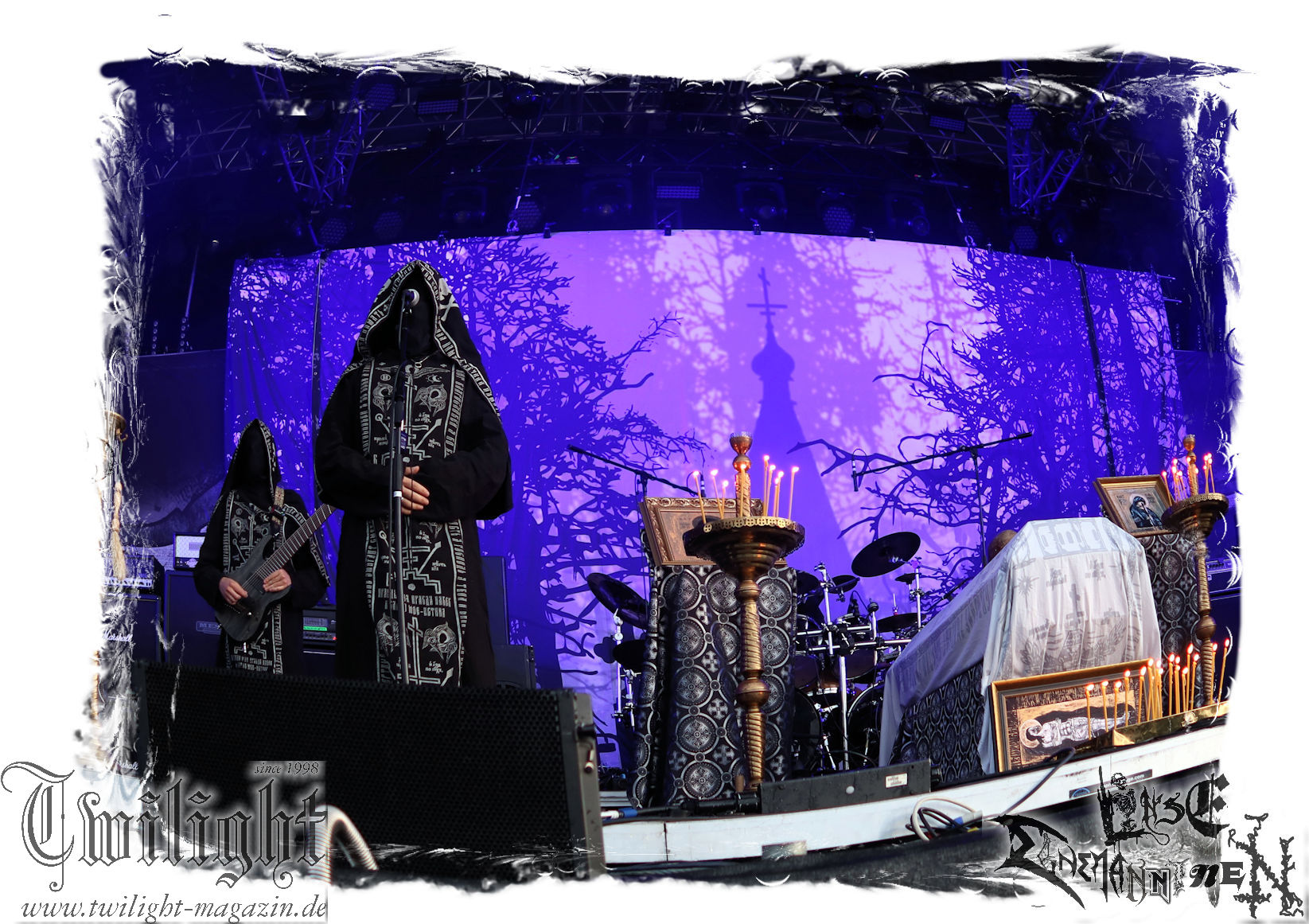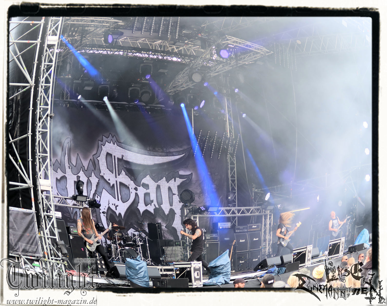 Obwohl ich mir immer wieder Schelte anhören muss, wenn ich ULTHA auslasse aber ich tue mich seit jeher schwer mit den Post Black Metal – Aufsteigern aus deutschen Landen, weil sie einfach irgendwie an mir vorbei musizieren. Und wo ich schon mal bei der gewerkschaftlichen Pause bin. Behemoth´s kleine Brüder HATE zwingen mich auch nicht schnell wieder vor die Bühne und ich weiß, der Stempel wird ihnen vielleicht auch nicht mehr so wirklich gerecht. Martin ist das wiederum näher dran: In der knalligen Mittagshitze dürfen dann die Kölner Ultha (ohne „R“!) ihren Post-Black Metal in die noch recht überschaubare Menge feuern. Wie für das Genre typisch, überlange Songs zieren die Setlist, doch werden diese auch durch das Zusammenspiel gleich zweier Sänger nicht langweilig und man kann sich in den Songstrukturen verlieren. Minutenlange monotone Rhythmen werden durch Schrei-Attacken unterbrochen, um dann in ruhigen Shoegaze-Passagen wieder zusammen zu fallen. Im kleinen Konzertsaal um die Ecke ist das sicher noch mal eindrucksvoller, doch einige Fans wird die Band sicherlich neu überzeugt haben. (MS) Bei PHANTOM WINTER im Zelt möchte ich dann doch mal Augen und Ohren riskieren. Viele Freunde aus meinem privaten Umfeld sind nicht erst seit dem neuen Output "Her Cold Material" begeistert von der Post Metal/Sludge-Formation aus Würzburg. Der Line-Check zieht sich zunächst ziemlich und dann ist es Drummer Christof, der gleich beim ersten Song seine Fußmaschine zertrümmert. Eine Panne, die Stage-Crew und Band beidermaßen souverän meistern. Ich weiß nicht, ob es diese unbeabsichtigten Längen sind oder dann doch die Musik ist, die dazu führen, dass ich mich nicht in den Malstrom aus wahrer LEIDENschaft, dem sich vor allem Sänger Christian und Gitarrist/Sänger Andreas zu ihrem massiven wie intensiven Klangkonstrukt hingeben, mitreißen lassen kann. Beide Sanges-Protagonisten stehen sich seitlich zum Publikum auf der Bühne gegenüber. Allerdings werde ich hier wohl noch einmal auf Tonträger genauer hinhören müssen. Im Zelt holt mich das gerade nicht ab... (JD) Da ich leider niemanden erwärmen konnte mitzukommen (Aber ich war doch vor Dir schon da - JD), stehe ich nun etwas verspätet vor der Zeltbühne, um mich von Phantom Winter durchschütteln zu lassen. Ich habe die Band 2015 mal live in Braunschweig im Nexus zusammen mit Ur gesehen und erinnere mich immer noch gerne an dieses beeindruckende Konzert. Deshalb wollte ich die Truppe auf dem PARTY.SAN auch nicht verpassen und sie mir endlich mal wieder live anschauen. Christian, Andreas, Florian (Gitarre), Kevin (Bass) und Christof (Drums) sind schon ordentlich eingegrooved und brennen auf der Bühne, eingehüllt in Nebel und weißes sowie blaues Licht, ein wahres Inferno der Emotionen ab. Auf den ersten Blick finde ich interessant, dass sich Christian und Andreas mittig leicht schräg gegenüberstehen und sich dadurch gegenseitig im Wechsel oder synchron anschreien, ankeifen, anröhren oder anflüstern. Das hat echt was und baut meiner Meinung nach sehr intensive Momente auf. Die beiden gehen förmlich, genauso wie Florian (linksstehend), Kevin (rechtsstehend) in der Musik auf, verlieren sich in ihr, lassen sich von ihr nicht nur emotional, sondern auch bewegungstechnisch, mitreißen, während Christof, bedingt durch die Drums, zwar in seinem Radius eingeschränkt ist aber still beim Spielen sitzen ist auch nicht seine Welt. Bei dieser alles mitreißenden und intensiven Musik ist es auch wirklich schwierig, von ihr nicht erfasst und mitgerissen zu werden. So geht es auch dem Publikum im gut gefüllten Zelt, welches teilweise schon versunken und verträumt diesen grandiosen Tönen lauscht, die sich von der Bühne aus, wabernden Schallwellen und einer alles durchdringenden Kraft an Gefühlen gleich, unserer bemächtigt. Eine Klänge gewordene Collage aus Wut, Verzweiflung, Entrücktheit, Dunkelheit, zerbrechlicher Schönheit und Tristesse beschreibt ihre Musik, die sich irgendwo zwischen Slugde, Black-, Doom-, Post-Metal/Rock ihre eigene Welt erschafft, sicherlich am besten und durch den echt tollen Bühnensound, die Beleuchtung und das Auftreten der Band an sich in Kombination mit den Songs, ist das Erleben dieses grandiosen Konzerts wie ein betörender, karthartischer Trip in die Abgründe unserer Seelen, der für mich persönlich wirklich angenehm und entspannend ist. Leider geht das Konzert nicht nur durch mein Zuspätkommen viel zu schnell zu Ende, glücklich bin ich aber trotzdem nach diesem Erlebnis und vielleicht dauert es nicht wieder so lange bis ich Phantom Winter mal wieder live sehen werde. (Rudi)