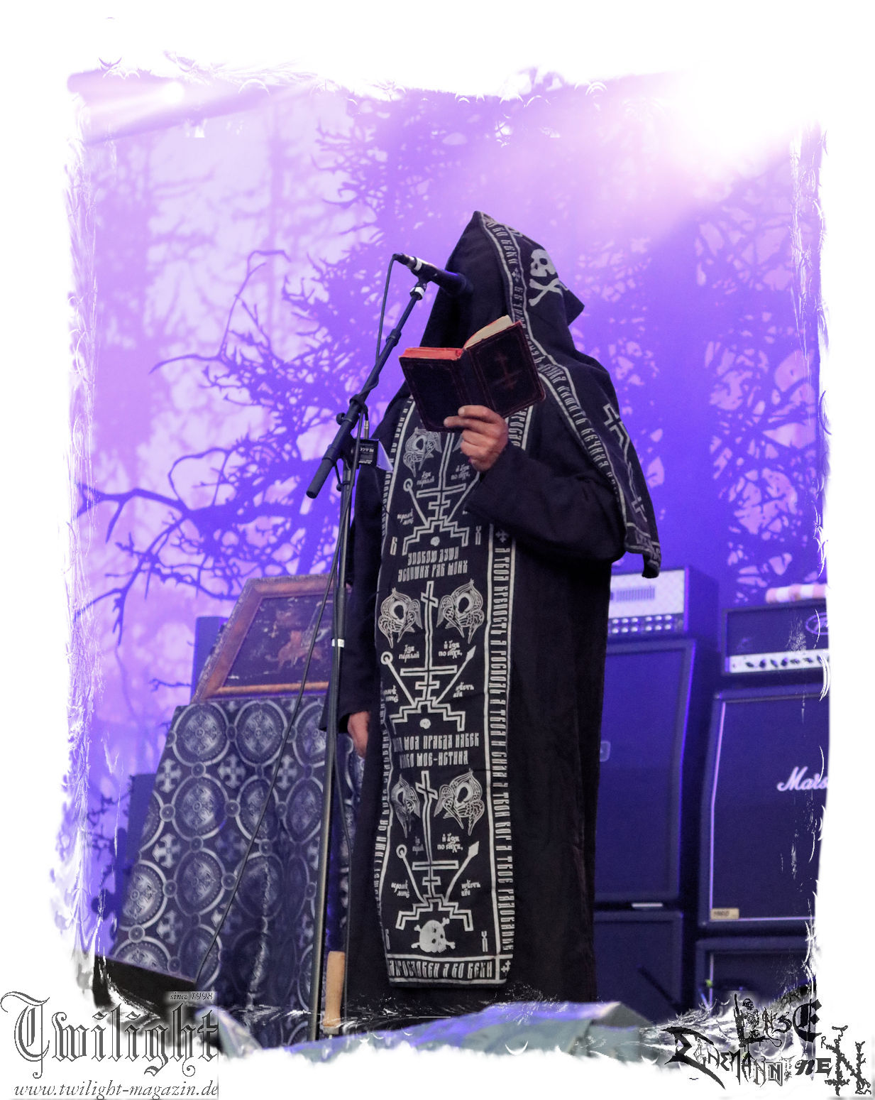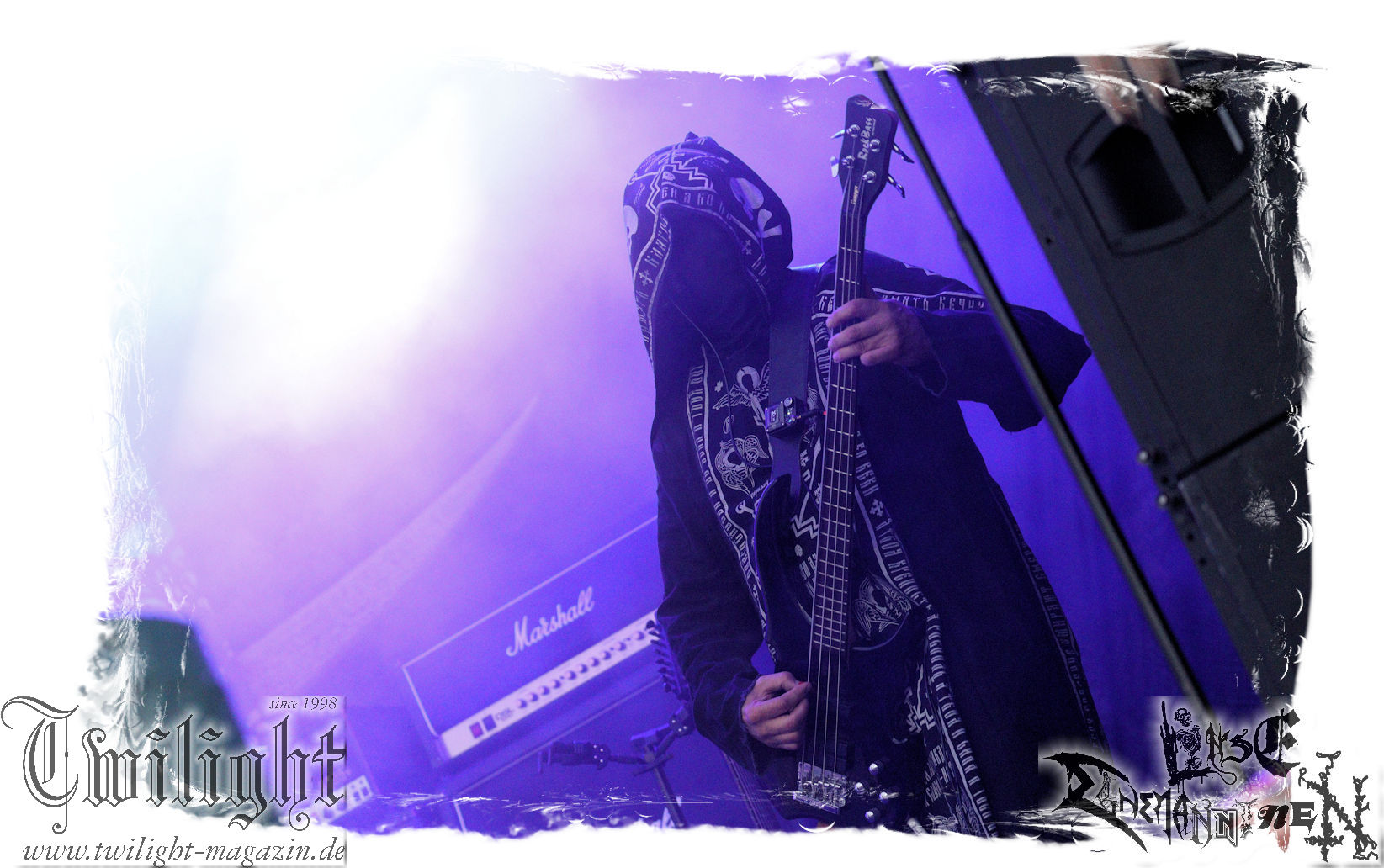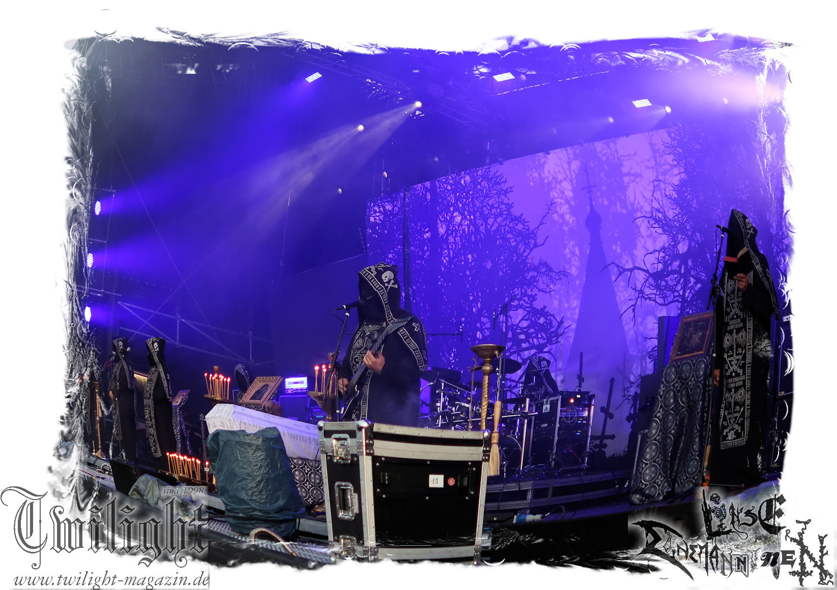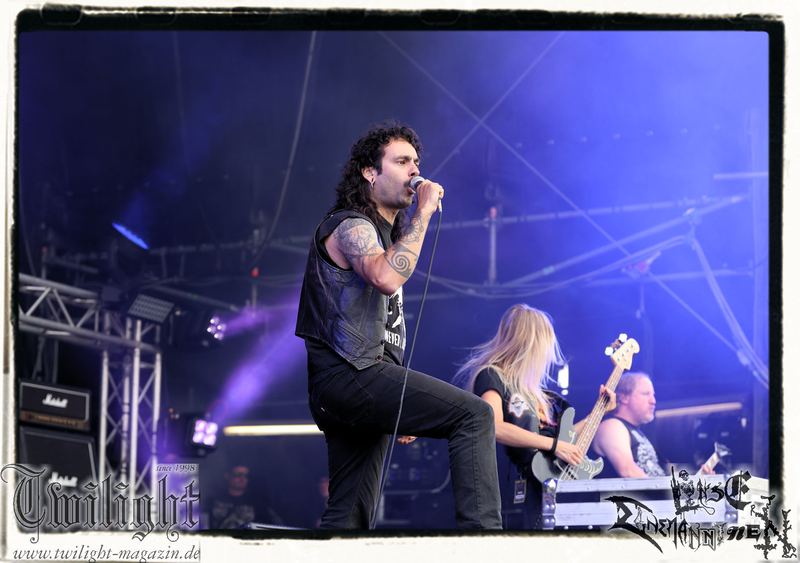 Obwohl ich mir immer wieder Schelte anhören muss, wenn ich ULTHA auslasse aber ich tue mich seit jeher schwer mit den Post Black Metal – Aufsteigern aus deutschen Landen, weil sie einfach irgendwie an mir vorbei musizieren. Und wo ich schon mal bei der gewerkschaftlichen Pause bin. Behemoth´s kleine Brüder HATE zwingen mich auch nicht schnell wieder vor die Bühne und ich weiß, der Stempel wird ihnen vielleicht auch nicht mehr so wirklich gerecht. Martin ist das wiederum näher dran: In der knalligen Mittagshitze dürfen dann die Kölner Ultha (ohne „R“!) ihren Post-Black Metal in die noch recht überschaubare Menge feuern. Wie für das Genre typisch, überlange Songs zieren die Setlist, doch werden diese auch durch das Zusammenspiel gleich zweier Sänger nicht langweilig und man kann sich in den Songstrukturen verlieren. Minutenlange monotone Rhythmen werden durch Schrei-Attacken unterbrochen, um dann in ruhigen Shoegaze-Passagen wieder zusammen zu fallen. Im kleinen Konzertsaal um die Ecke ist das sicher noch mal eindrucksvoller, doch einige Fans wird die Band sicherlich neu überzeugt haben. (MS) Bei PHANTOM WINTER im Zelt möchte ich dann doch mal Augen und Ohren riskieren. Viele Freunde aus meinem privaten Umfeld sind nicht erst seit dem neuen Output "Her Cold Material" begeistert von der Post Metal/Sludge-Formation aus Würzburg. Der Line-Check zieht sich zunächst ziemlich und dann ist es Drummer Christof, der gleich beim ersten Song seine Fußmaschine zertrümmert. Eine Panne, die Stage-Crew und Band beidermaßen souverän meistern. Ich weiß nicht, ob es diese unbeabsichtigten Längen sind oder dann doch die Musik ist, die dazu führen, dass ich mich nicht in den Malstrom aus wahrer LEIDENschaft, dem sich vor allem Sänger Christian und Gitarrist/Sänger Andreas zu ihrem massiven wie intensiven Klangkonstrukt hingeben, mitreißen lassen kann. Beide Sanges-Protagonisten stehen sich seitlich zum Publikum auf der Bühne gegenüber. Allerdings werde ich hier wohl noch einmal auf Tonträger genauer hinhören müssen. Im Zelt holt mich das gerade nicht ab... (JD) Da ich leider niemanden erwärmen konnte mitzukommen (Aber ich war doch vor Dir schon da - JD), stehe ich nun etwas verspätet vor der Zeltbühne, um mich von Phantom Winter durchschütteln zu lassen. Ich habe die Band 2015 mal live in Braunschweig im Nexus zusammen mit Ur gesehen und erinnere mich immer noch gerne an dieses beeindruckende Konzert. Deshalb wollte ich die Truppe auf dem PARTY.SAN auch nicht verpassen und sie mir endlich mal wieder live anschauen. Christian, Andreas, Florian (Gitarre), Kevin (Bass) und Christof (Drums) sind schon ordentlich eingegrooved und brennen auf der Bühne, eingehüllt in Nebel und weißes sowie blaues Licht, ein wahres Inferno der Emotionen ab. Auf den ersten Blick finde ich interessant, dass sich Christian und Andreas mittig leicht schräg gegenüberstehen und sich dadurch gegenseitig im Wechsel oder synchron anschreien, ankeifen, anröhren oder anflüstern. Das hat echt was und baut meiner Meinung nach sehr intensive Momente auf. Die beiden gehen förmlich, genauso wie Florian (linksstehend), Kevin (rechtsstehend) in der Musik auf, verlieren sich in ihr, lassen sich von ihr nicht nur emotional, sondern auch bewegungstechnisch, mitreißen, während Christof, bedingt durch die Drums, zwar in seinem Radius eingeschränkt ist aber still beim Spielen sitzen ist auch nicht seine Welt. Bei dieser alles mitreißenden und intensiven Musik ist es auch wirklich schwierig, von ihr nicht erfasst und mitgerissen zu werden. So geht es auch dem Publikum im gut gefüllten Zelt, welches teilweise schon versunken und verträumt diesen grandiosen Tönen lauscht, die sich von der Bühne aus, wabernden Schallwellen und einer alles durchdringenden Kraft an Gefühlen gleich, unserer bemächtigt. Eine Klänge gewordene Collage aus Wut, Verzweiflung, Entrücktheit, Dunkelheit, zerbrechlicher Schönheit und Tristesse beschreibt ihre Musik, die sich irgendwo zwischen Slugde, Black-, Doom-, Post-Metal/Rock ihre eigene Welt erschafft, sicherlich am besten und durch den echt tollen Bühnensound, die Beleuchtung und das Auftreten der Band an sich in Kombination mit den Songs, ist das Erleben dieses grandiosen Konzerts wie ein betörender, karthartischer Trip in die Abgründe unserer Seelen, der für mich persönlich wirklich angenehm und entspannend ist. Leider geht das Konzert nicht nur durch mein Zuspätkommen viel zu schnell zu Ende, glücklich bin ich aber trotzdem nach diesem Erlebnis und vielleicht dauert es nicht wieder so lange bis ich Phantom Winter mal wieder live sehen werde. (Rudi)