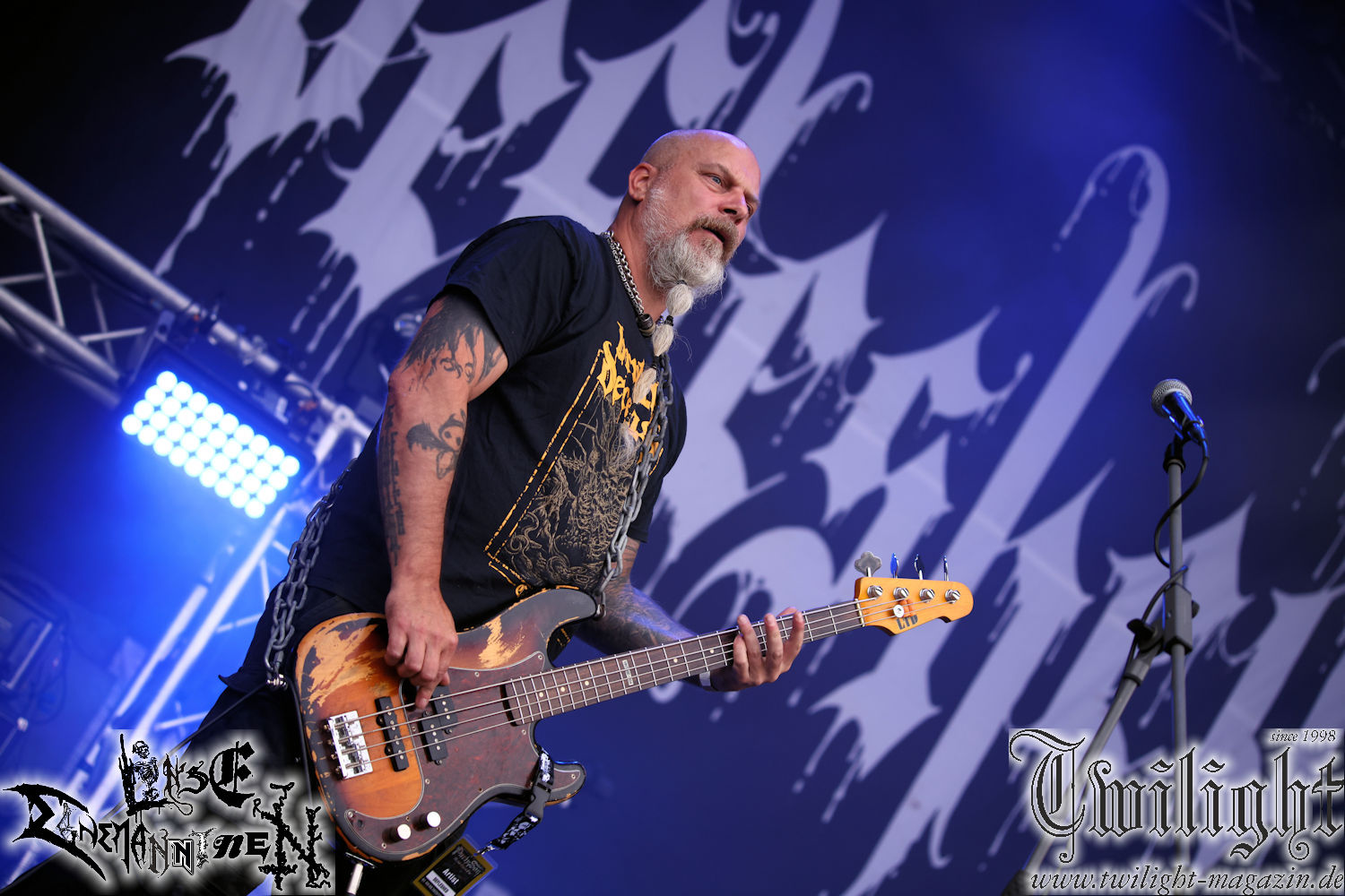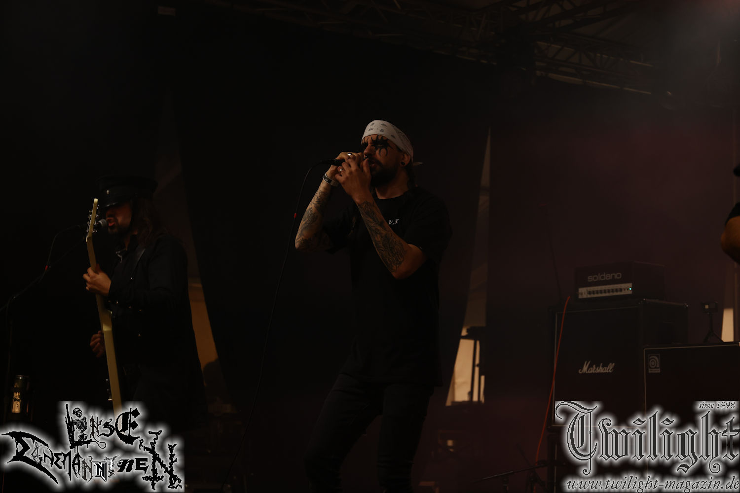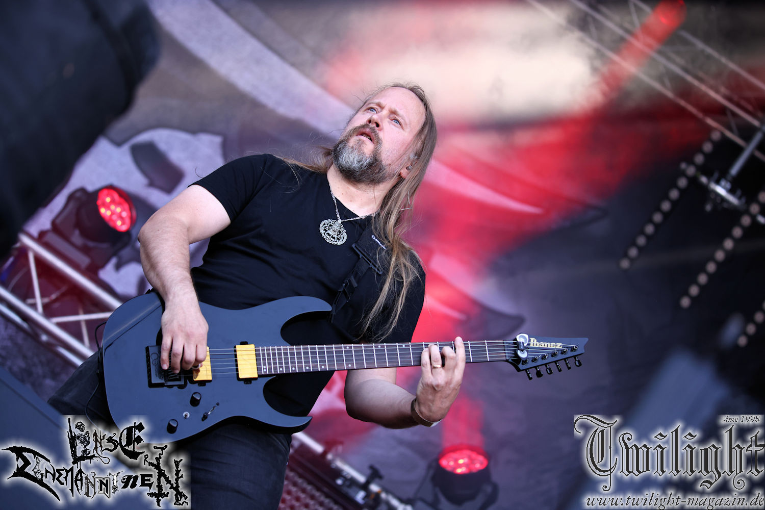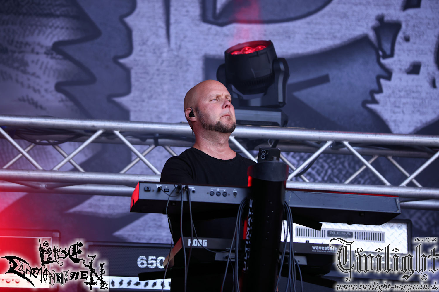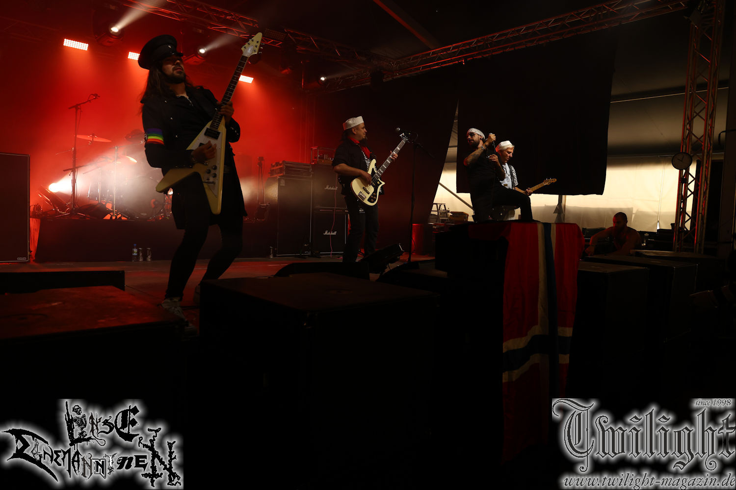 Nachdem ich mich schon die ganze Zeit tierisch darauf gefreut habe, ist es jetzt nun endlich soweit, denn die umwerfenden Night In Gales werden gleich im Zelt loslegen. Ich finde diese Melodic Death Metal - Institution ja wirklich einfach nur genial und ihr Sound ist für mich wunderbar, weshalb ich mich auch erneut mit frischem Bier in der ersten Reihe positioniert habe. Da muss ich einfach ganz vorne mit dabei sein und ich bin echt gespannt, welche Songs sie aus ihrem reichen Fundus wohl spielen werden, immerhin stehen ihnen nur 30 Minuten zur Verfügung. Mein Plan nicht ganz so betrunken zu sein, wie bei ihrem Gig zum 30. Geburtstag von Final Cry in Hannover, ist nicht so ganz aufgegangen, aber immer noch besser als das In Blackest Velvet, Night In Gales, Dew-Scented-Konzert 2001 in Salzgitter im Forellenhof, denn da kann ich mich nur noch teilweise an Dew-Scented erinnern. Egal, denn es geht endlich los und Christian (Gesang), Tobias (Bass), Adriano (Drums) und die Brüder Frank und Jens (beide Gitarre) betreten zu einem schönen Intro sichtlich motiviert die in blaues Licht und Nebel gehüllte sowie jeweils links und rechts von sehr cool aussehenden Sidedrops eingegrenzte Bühne mit dem grandiosen Bandlogo im Hintergrund und legen los. Und zwar mit „Dawnlight Garden“, dem Titelsongs ihres Albums von 2020. Knaller! Gepackt in einen wirklich sehr geilen und fetten Livesound macht sich schon beim ersten Song die große Stärke dieser Band sofort bemerkbar: Umwerfende, packende und emotional sehr mitreißende Melodien gepaart mit bestem Death Metal. Also die ursprüngliche Melo-Death-Schule, so wie ich sie liebe. Anfang der 2000er hatte sich die Band vom Sound her zwar etwas geöffnet, aber für sich festgestellt, dass nur die alte Lehre für sie Sinn macht (nachzulesen im famosen Mørkeskye – Anm. d. Verf.). Das stellen sie mit dem nun folgenden „The Spears Within“ von 2018 mächtig unter Beweis. Wie bereits erwähnt, hat die Band echt Bock, ist bewegungsfreudig und ordentlich am Bangen und Posen, dass es eine wahre Augenfreude ist. Hier wird nicht nur runtergezockt, sondern der eigene Sound erlebt und ausgelebt. Bei solch einer umwerfenden Musik, kann auch keiner unberührt bleiben und um mich herum sehe ich nur strahlende Gesichter und das Zelt ist auch so richtig gut gefüllt. Klasse, das freut mich für die Jungs wirklich sehr. Weiter geht es mit der Hymne „Into The Evergrey“ vom aktuellen Killeralbum „Shadowreaper“. Der Song ist echt sowas von geil, Leute. Als ich das erste Mal das Video sah und hörte, fühlte ich mich sofort in die 90er zurück versetzt, als ich als Teenager vor meiner Anlage saß und mich ergriffen dem Göteborg-Sound hingab. Das ist jetzt nicht anders und ich komme vor Freude gar nicht mehr aus dem Strahlen heraus. Danke dafür Jungs! Kollege Dunemann ist jetzt auch wieder mit dem Fotografieren fertig, hat sich zu mir nach vorne gesellt und mein Vornamensvetter ist ebenfalls anwesend und so feiern wir die Band jetzt gemeinsam ab. „Transition To Doom“ ist dafür auch wie gemacht. Im Rausch der Freude fordern Dunemann und ich den Klassiker „Razor“ und wir haben tatsächlich Glück und nicht nur wir sind entzückt, dass der Song jetzt kommt. Die Stimmung im Zelt kocht und das nicht nur wegen der Hitze. Und dem nicht genug, denn der nächste Klassiker wird uns um unsere Ohren gezimmert, nämlich „Autumn Water“ von „Towards The Twilight“. Wie schön und wenn Night In Gales schon in der alten Schatzkiste kramen, servieren sie uns dann auch noch „Sylphlike“! Ganz grooooßes Kino! Was für ein herrlich intensives und mitreißendes Konzert. Aber auch dieses geht leider irgendwann zu Ende und wird mit einem Klassiker beendet. Aber kein eigener, denn es gibt Iron Maiden ,mit ihrem gleichnamigen Song auf die Ohren und so gehen alle nochmal ordentlich ab und verlassen mehr als zufrieden das Zelt. Danke für dieses tolle Konzert Night In Gales! Ich bin zutiefst zufrieden. Und falls Night In Gales bei euch bisher unter dem Radar liefen und ihr Fans von mitreißenden feurigen, intensiven und von Herzblut angetriebenen Melodic Death Metal der alten Schule seid, ist diese Band für euch Pflicht!