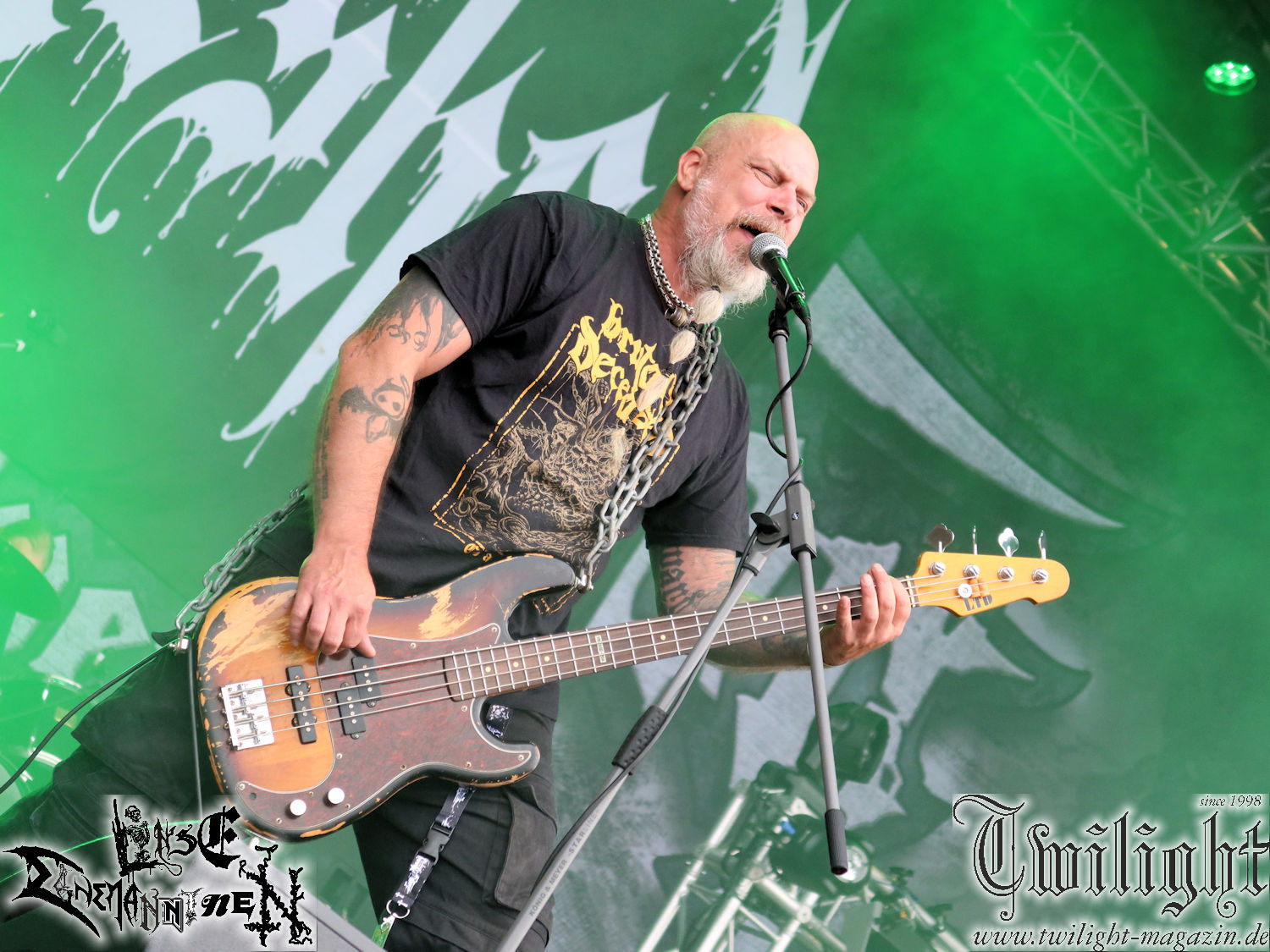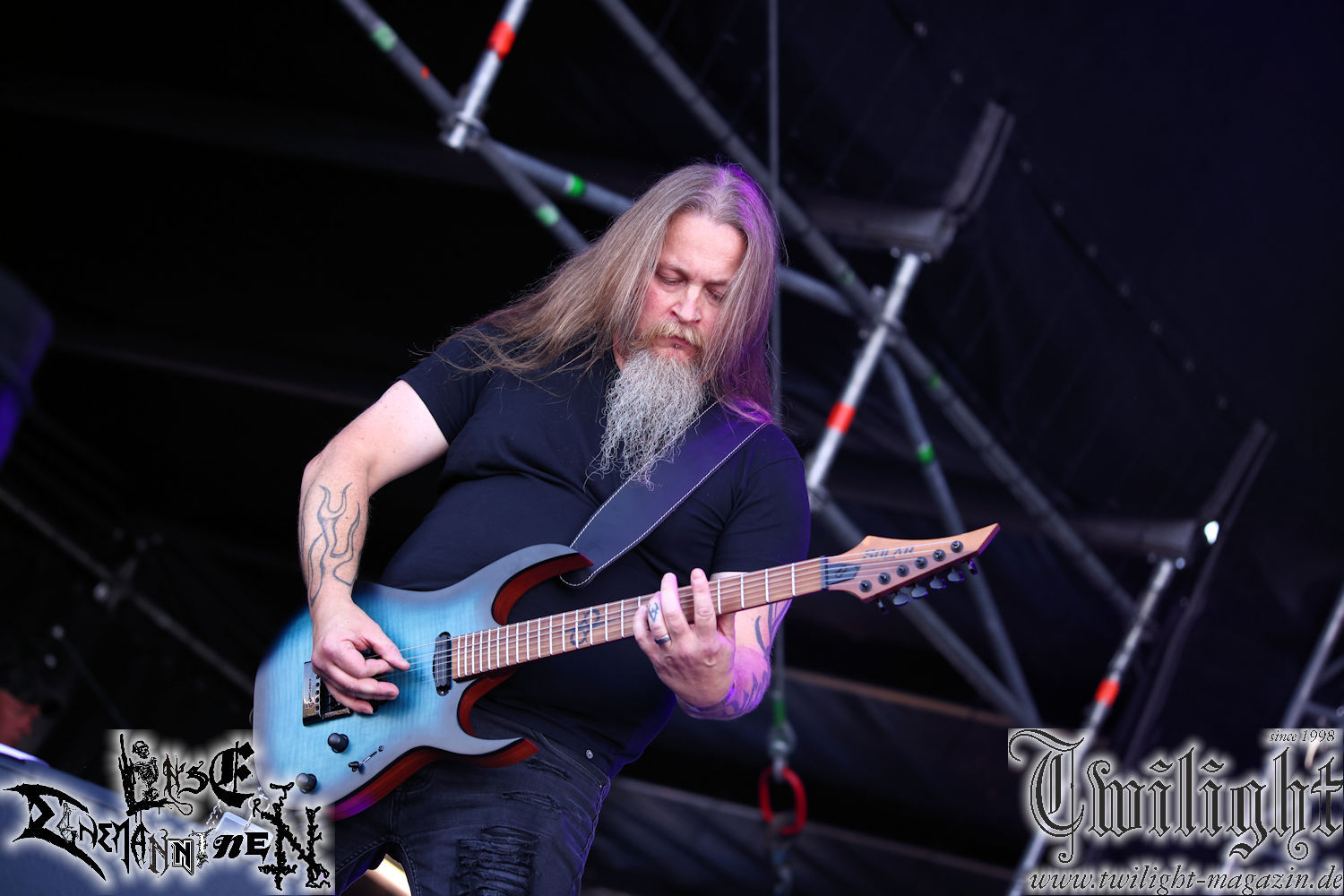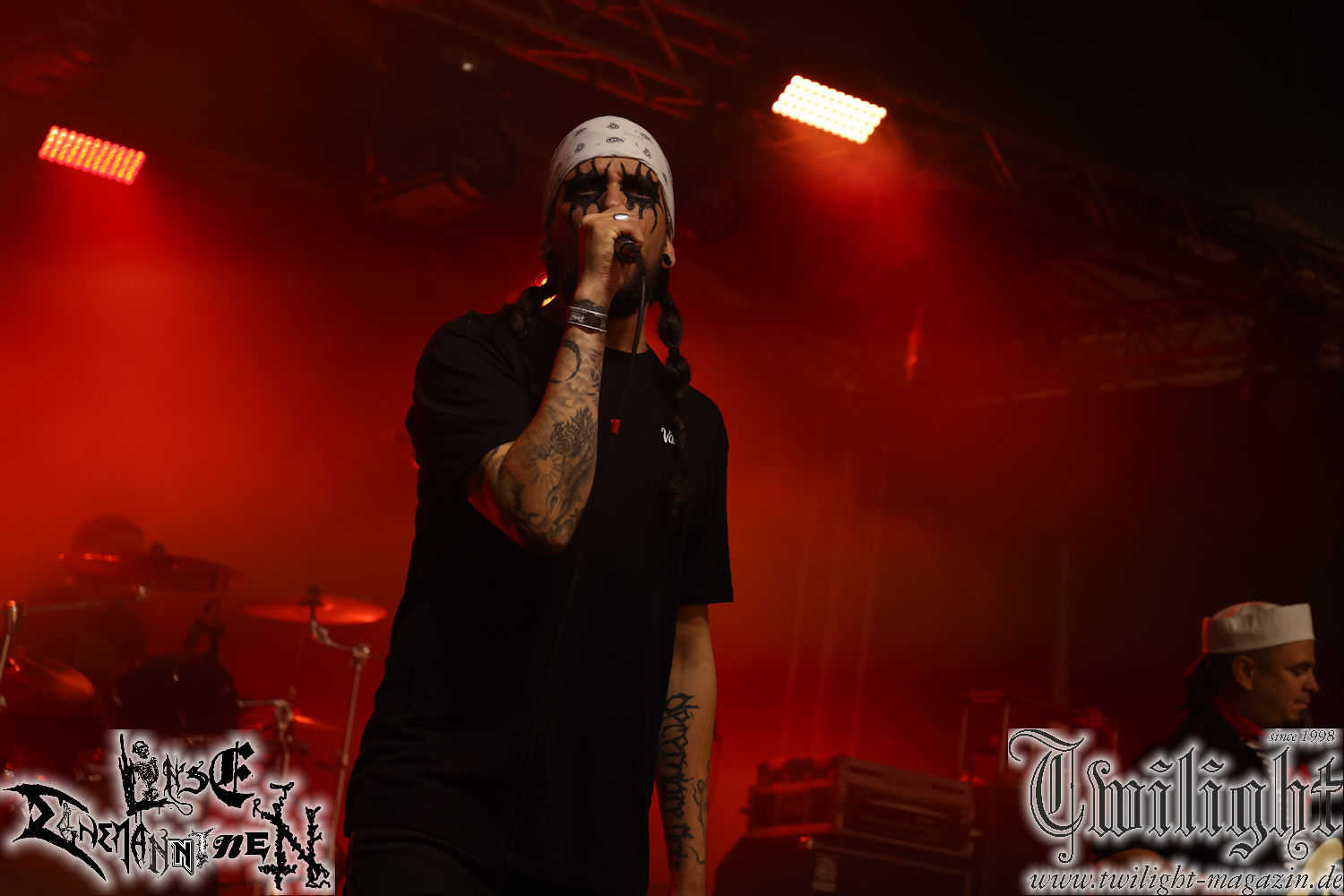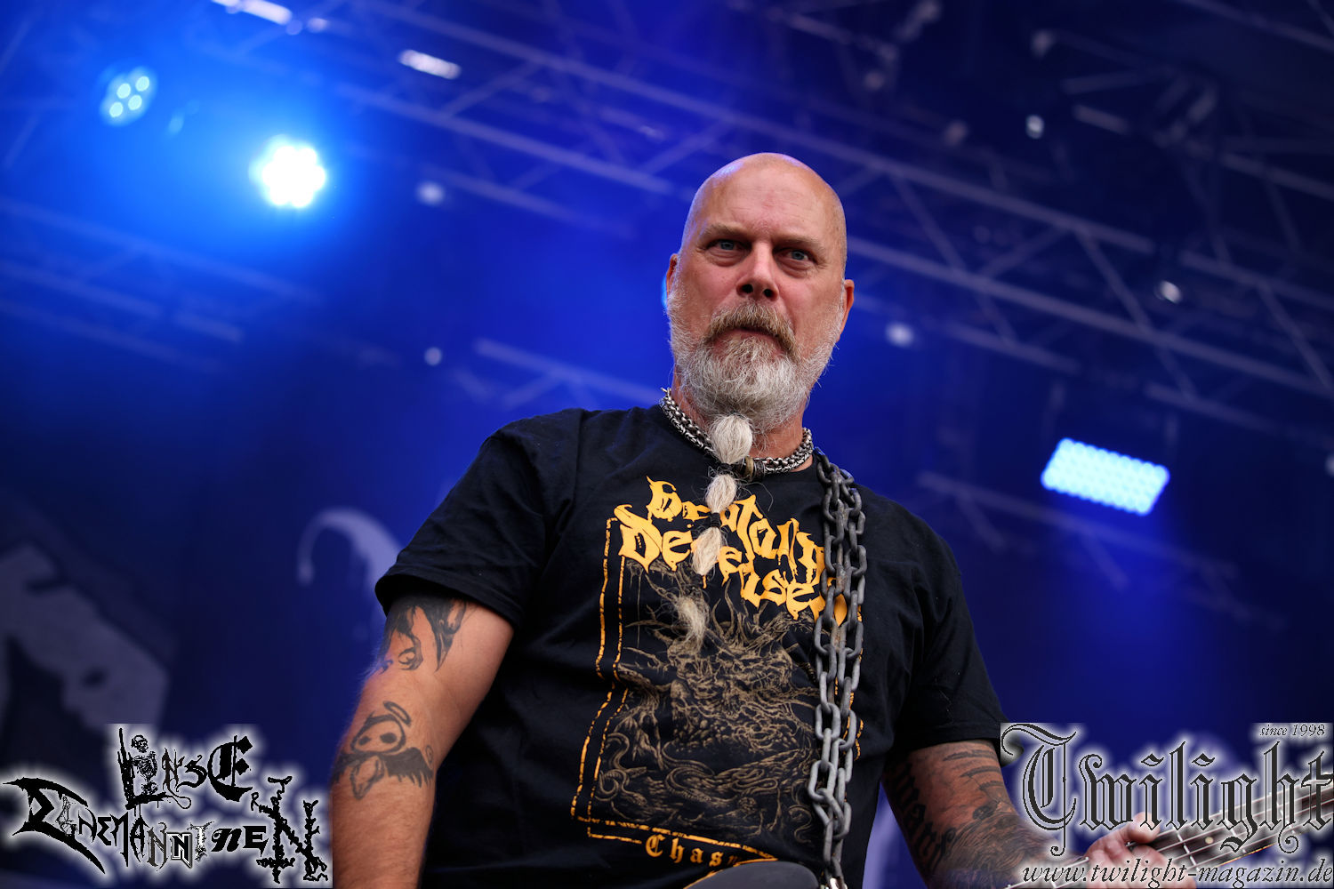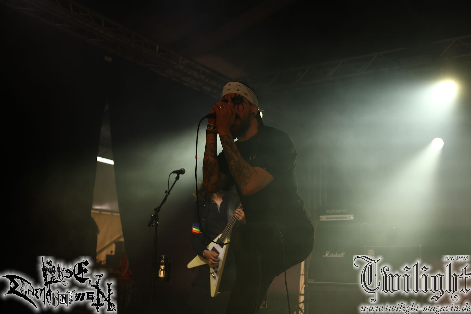 Nachdem ich mich schon die ganze Zeit tierisch darauf gefreut habe, ist es jetzt nun endlich soweit, denn die umwerfenden Night In Gales werden gleich im Zelt loslegen. Ich finde diese Melodic Death Metal - Institution ja wirklich einfach nur genial und ihr Sound ist für mich wunderbar, weshalb ich mich auch erneut mit frischem Bier in der ersten Reihe positioniert habe. Da muss ich einfach ganz vorne mit dabei sein und ich bin echt gespannt, welche Songs sie aus ihrem reichen Fundus wohl spielen werden, immerhin stehen ihnen nur 30 Minuten zur Verfügung. Mein Plan nicht ganz so betrunken zu sein, wie bei ihrem Gig zum 30. Geburtstag von Final Cry in Hannover, ist nicht so ganz aufgegangen, aber immer noch besser als das In Blackest Velvet, Night In Gales, Dew-Scented-Konzert 2001 in Salzgitter im Forellenhof, denn da kann ich mich nur noch teilweise an Dew-Scented erinnern. Egal, denn es geht endlich los und Christian (Gesang), Tobias (Bass), Adriano (Drums) und die Brüder Frank und Jens (beide Gitarre) betreten zu einem schönen Intro sichtlich motiviert die in blaues Licht und Nebel gehüllte sowie jeweils links und rechts von sehr cool aussehenden Sidedrops eingegrenzte Bühne mit dem grandiosen Bandlogo im Hintergrund und legen los. Und zwar mit „Dawnlight Garden“, dem Titelsongs ihres Albums von 2020. Knaller! Gepackt in einen wirklich sehr geilen und fetten Livesound macht sich schon beim ersten Song die große Stärke dieser Band sofort bemerkbar: Umwerfende, packende und emotional sehr mitreißende Melodien gepaart mit bestem Death Metal. Also die ursprüngliche Melo-Death-Schule, so wie ich sie liebe. Anfang der 2000er hatte sich die Band vom Sound her zwar etwas geöffnet, aber für sich festgestellt, dass nur die alte Lehre für sie Sinn macht (nachzulesen im famosen Mørkeskye – Anm. d. Verf.). Das stellen sie mit dem nun folgenden „The Spears Within“ von 2018 mächtig unter Beweis. Wie bereits erwähnt, hat die Band echt Bock, ist bewegungsfreudig und ordentlich am Bangen und Posen, dass es eine wahre Augenfreude ist. Hier wird nicht nur runtergezockt, sondern der eigene Sound erlebt und ausgelebt. Bei solch einer umwerfenden Musik, kann auch keiner unberührt bleiben und um mich herum sehe ich nur strahlende Gesichter und das Zelt ist auch so richtig gut gefüllt. Klasse, das freut mich für die Jungs wirklich sehr. Weiter geht es mit der Hymne „Into The Evergrey“ vom aktuellen Killeralbum „Shadowreaper“. Der Song ist echt sowas von geil, Leute. Als ich das erste Mal das Video sah und hörte, fühlte ich mich sofort in die 90er zurück versetzt, als ich als Teenager vor meiner Anlage saß und mich ergriffen dem Göteborg-Sound hingab. Das ist jetzt nicht anders und ich komme vor Freude gar nicht mehr aus dem Strahlen heraus. Danke dafür Jungs! Kollege Dunemann ist jetzt auch wieder mit dem Fotografieren fertig, hat sich zu mir nach vorne gesellt und mein Vornamensvetter ist ebenfalls anwesend und so feiern wir die Band jetzt gemeinsam ab. „Transition To Doom“ ist dafür auch wie gemacht. Im Rausch der Freude fordern Dunemann und ich den Klassiker „Razor“ und wir haben tatsächlich Glück und nicht nur wir sind entzückt, dass der Song jetzt kommt. Die Stimmung im Zelt kocht und das nicht nur wegen der Hitze. Und dem nicht genug, denn der nächste Klassiker wird uns um unsere Ohren gezimmert, nämlich „Autumn Water“ von „Towards The Twilight“. Wie schön und wenn Night In Gales schon in der alten Schatzkiste kramen, servieren sie uns dann auch noch „Sylphlike“! Ganz grooooßes Kino! Was für ein herrlich intensives und mitreißendes Konzert. Aber auch dieses geht leider irgendwann zu Ende und wird mit einem Klassiker beendet. Aber kein eigener, denn es gibt Iron Maiden ,mit ihrem gleichnamigen Song auf die Ohren und so gehen alle nochmal ordentlich ab und verlassen mehr als zufrieden das Zelt. Danke für dieses tolle Konzert Night In Gales! Ich bin zutiefst zufrieden. Und falls Night In Gales bei euch bisher unter dem Radar liefen und ihr Fans von mitreißenden feurigen, intensiven und von Herzblut angetriebenen Melodic Death Metal der alten Schule seid, ist diese Band für euch Pflicht!