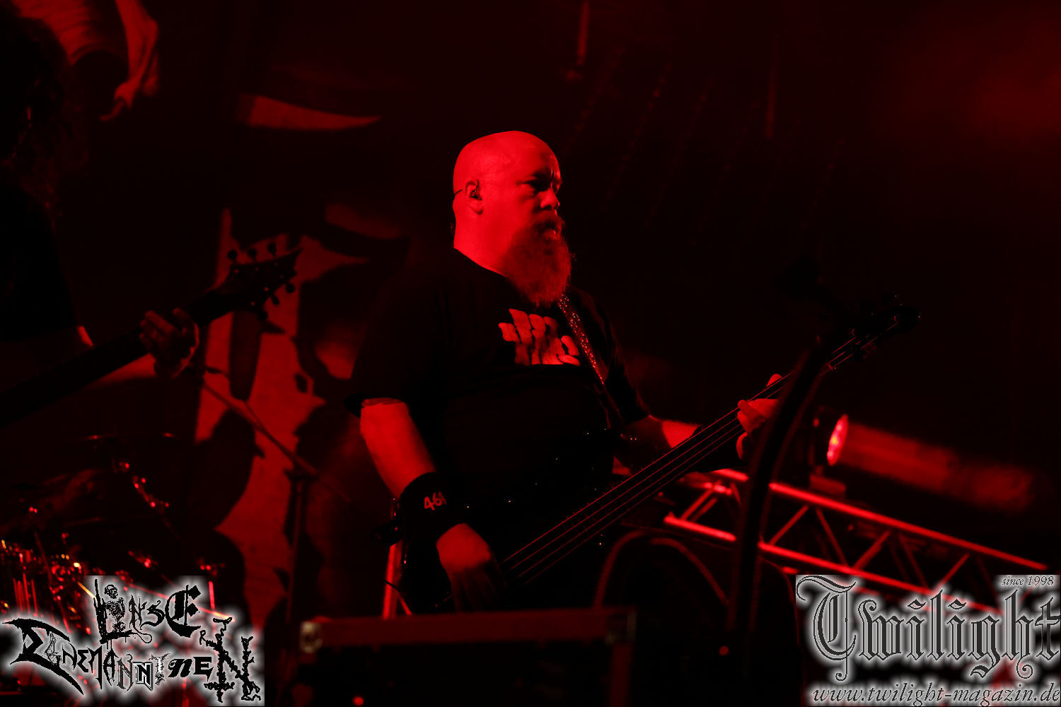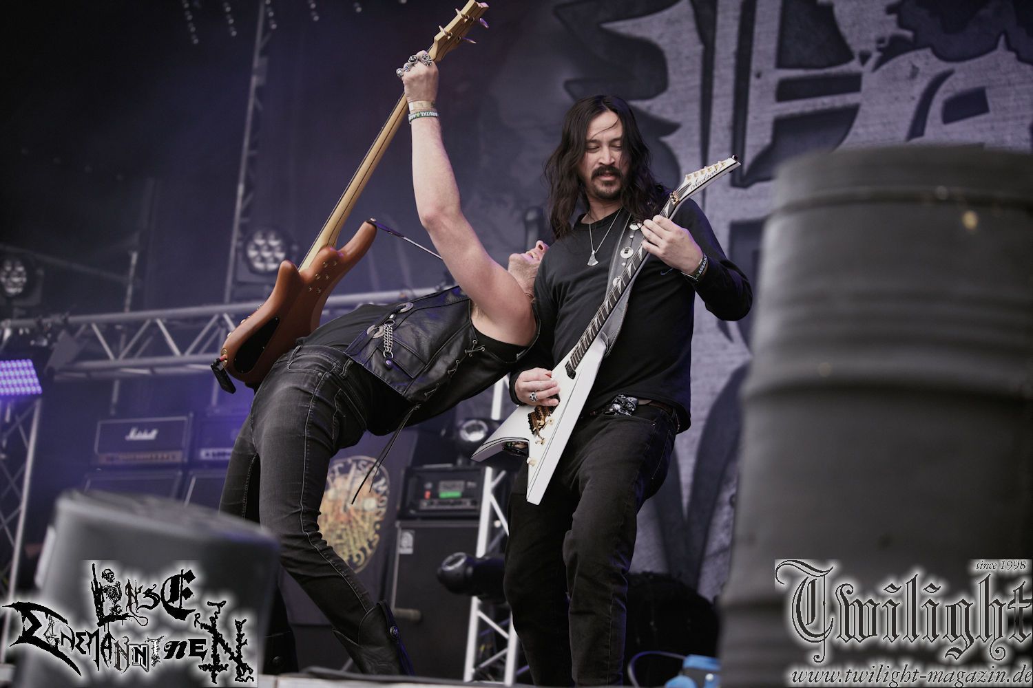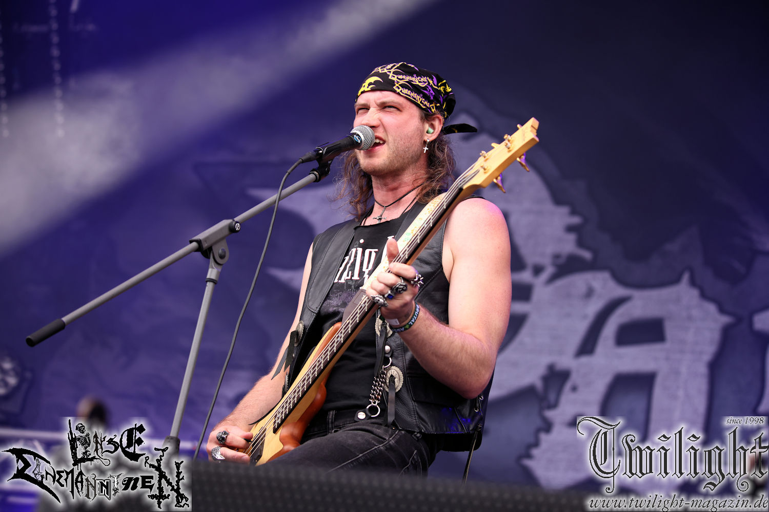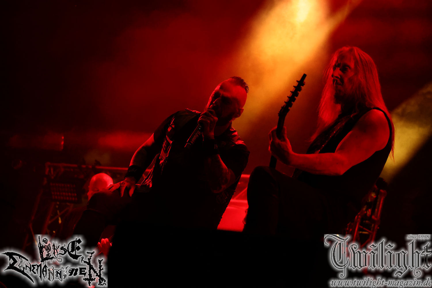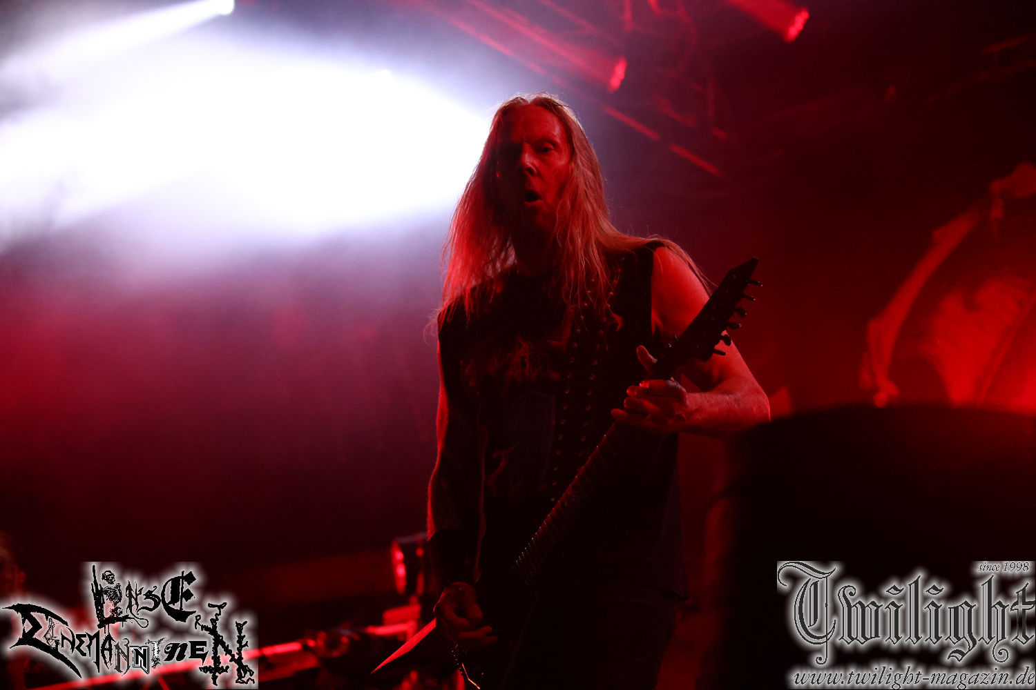 Nachdem ich mich schon die ganze Zeit tierisch darauf gefreut habe, ist es jetzt nun endlich soweit, denn die umwerfenden Night In Gales werden gleich im Zelt loslegen. Ich finde diese Melodic Death Metal - Institution ja wirklich einfach nur genial und ihr Sound ist für mich wunderbar, weshalb ich mich auch erneut mit frischem Bier in der ersten Reihe positioniert habe. Da muss ich einfach ganz vorne mit dabei sein und ich bin echt gespannt, welche Songs sie aus ihrem reichen Fundus wohl spielen werden, immerhin stehen ihnen nur 30 Minuten zur Verfügung. Mein Plan nicht ganz so betrunken zu sein, wie bei ihrem Gig zum 30. Geburtstag von Final Cry in Hannover, ist nicht so ganz aufgegangen, aber immer noch besser als das In Blackest Velvet, Night In Gales, Dew-Scented-Konzert 2001 in Salzgitter im Forellenhof, denn da kann ich mich nur noch teilweise an Dew-Scented erinnern. Egal, denn es geht endlich los und Christian (Gesang), Tobias (Bass), Adriano (Drums) und die Brüder Frank und Jens (beide Gitarre) betreten zu einem schönen Intro sichtlich motiviert die in blaues Licht und Nebel gehüllte sowie jeweils links und rechts von sehr cool aussehenden Sidedrops eingegrenzte Bühne mit dem grandiosen Bandlogo im Hintergrund und legen los. Und zwar mit „Dawnlight Garden“, dem Titelsongs ihres Albums von 2020. Knaller! Gepackt in einen wirklich sehr geilen und fetten Livesound macht sich schon beim ersten Song die große Stärke dieser Band sofort bemerkbar: Umwerfende, packende und emotional sehr mitreißende Melodien gepaart mit bestem Death Metal. Also die ursprüngliche Melo-Death-Schule, so wie ich sie liebe. Anfang der 2000er hatte sich die Band vom Sound her zwar etwas geöffnet, aber für sich festgestellt, dass nur die alte Lehre für sie Sinn macht (nachzulesen im famosen Mørkeskye – Anm. d. Verf.). Das stellen sie mit dem nun folgenden „The Spears Within“ von 2018 mächtig unter Beweis. Wie bereits erwähnt, hat die Band echt Bock, ist bewegungsfreudig und ordentlich am Bangen und Posen, dass es eine wahre Augenfreude ist. Hier wird nicht nur runtergezockt, sondern der eigene Sound erlebt und ausgelebt. Bei solch einer umwerfenden Musik, kann auch keiner unberührt bleiben und um mich herum sehe ich nur strahlende Gesichter und das Zelt ist auch so richtig gut gefüllt. Klasse, das freut mich für die Jungs wirklich sehr. Weiter geht es mit der Hymne „Into The Evergrey“ vom aktuellen Killeralbum „Shadowreaper“. Der Song ist echt sowas von geil, Leute. Als ich das erste Mal das Video sah und hörte, fühlte ich mich sofort in die 90er zurück versetzt, als ich als Teenager vor meiner Anlage saß und mich ergriffen dem Göteborg-Sound hingab. Das ist jetzt nicht anders und ich komme vor Freude gar nicht mehr aus dem Strahlen heraus. Danke dafür Jungs! Kollege Dunemann ist jetzt auch wieder mit dem Fotografieren fertig, hat sich zu mir nach vorne gesellt und mein Vornamensvetter ist ebenfalls anwesend und so feiern wir die Band jetzt gemeinsam ab. „Transition To Doom“ ist dafür auch wie gemacht. Im Rausch der Freude fordern Dunemann und ich den Klassiker „Razor“ und wir haben tatsächlich Glück und nicht nur wir sind entzückt, dass der Song jetzt kommt. Die Stimmung im Zelt kocht und das nicht nur wegen der Hitze. Und dem nicht genug, denn der nächste Klassiker wird uns um unsere Ohren gezimmert, nämlich „Autumn Water“ von „Towards The Twilight“. Wie schön und wenn Night In Gales schon in der alten Schatzkiste kramen, servieren sie uns dann auch noch „Sylphlike“! Ganz grooooßes Kino! Was für ein herrlich intensives und mitreißendes Konzert. Aber auch dieses geht leider irgendwann zu Ende und wird mit einem Klassiker beendet. Aber kein eigener, denn es gibt Iron Maiden ,mit ihrem gleichnamigen Song auf die Ohren und so gehen alle nochmal ordentlich ab und verlassen mehr als zufrieden das Zelt. Danke für dieses tolle Konzert Night In Gales! Ich bin zutiefst zufrieden. Und falls Night In Gales bei euch bisher unter dem Radar liefen und ihr Fans von mitreißenden feurigen, intensiven und von Herzblut angetriebenen Melodic Death Metal der alten Schule seid, ist diese Band für euch Pflicht!