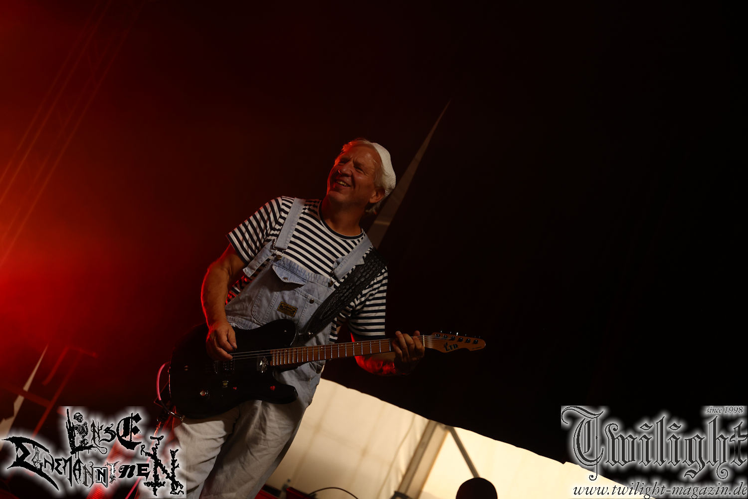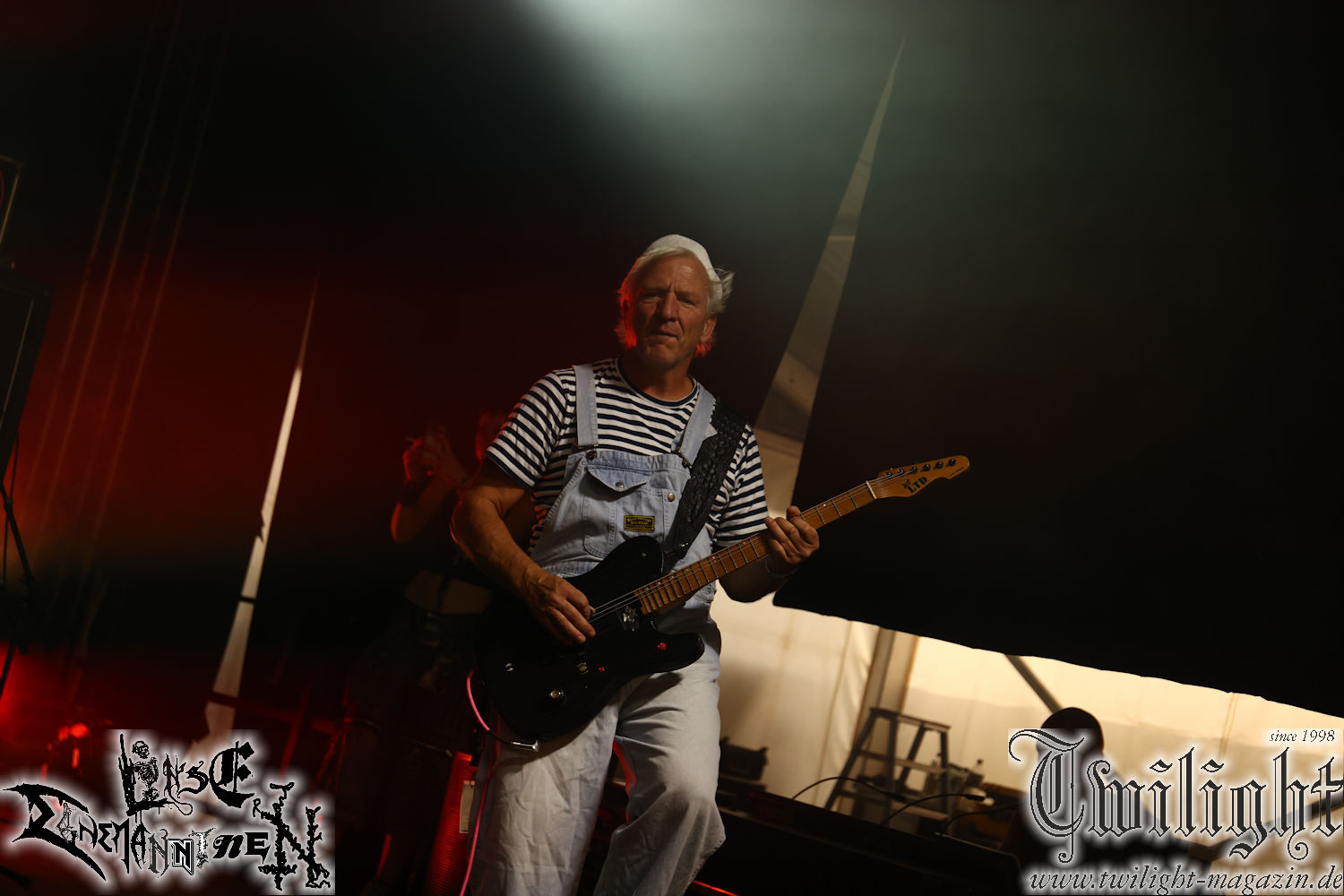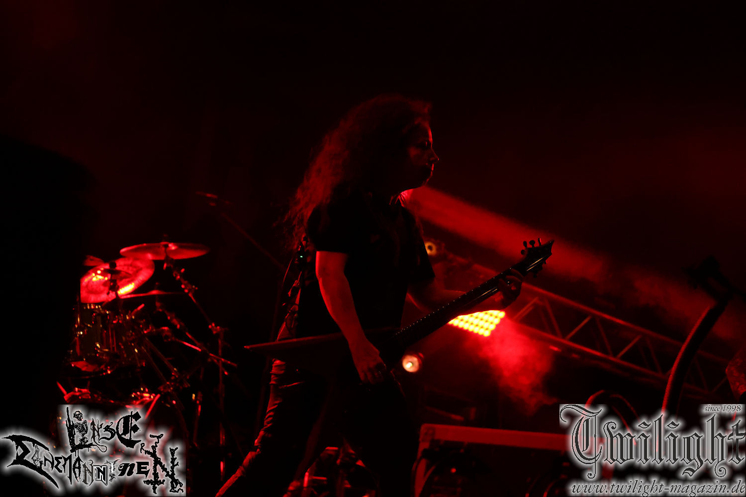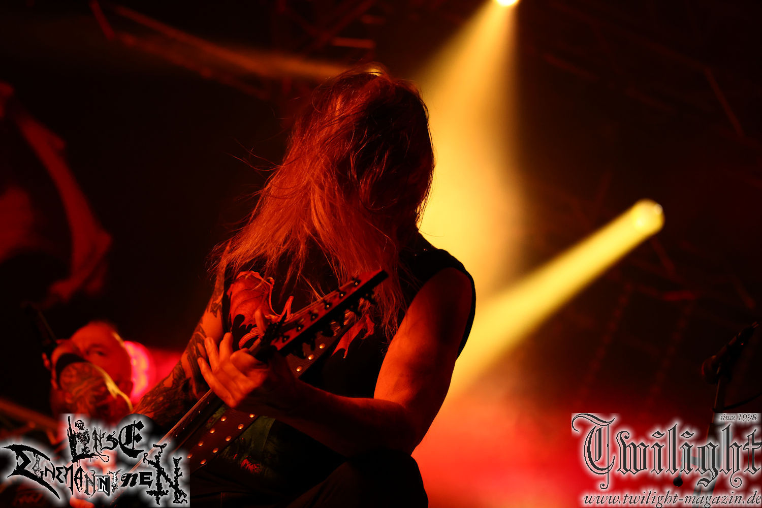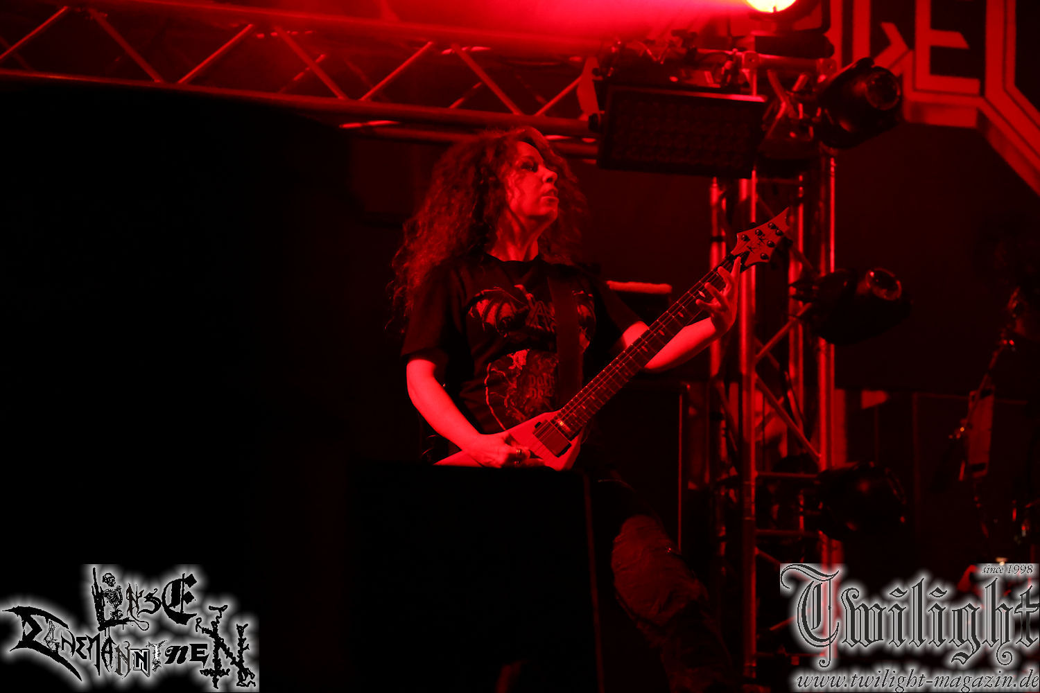 Nachdem ich mich schon die ganze Zeit tierisch darauf gefreut habe, ist es jetzt nun endlich soweit, denn die umwerfenden Night In Gales werden gleich im Zelt loslegen. Ich finde diese Melodic Death Metal - Institution ja wirklich einfach nur genial und ihr Sound ist für mich wunderbar, weshalb ich mich auch erneut mit frischem Bier in der ersten Reihe positioniert habe. Da muss ich einfach ganz vorne mit dabei sein und ich bin echt gespannt, welche Songs sie aus ihrem reichen Fundus wohl spielen werden, immerhin stehen ihnen nur 30 Minuten zur Verfügung. Mein Plan nicht ganz so betrunken zu sein, wie bei ihrem Gig zum 30. Geburtstag von Final Cry in Hannover, ist nicht so ganz aufgegangen, aber immer noch besser als das In Blackest Velvet, Night In Gales, Dew-Scented-Konzert 2001 in Salzgitter im Forellenhof, denn da kann ich mich nur noch teilweise an Dew-Scented erinnern. Egal, denn es geht endlich los und Christian (Gesang), Tobias (Bass), Adriano (Drums) und die Brüder Frank und Jens (beide Gitarre) betreten zu einem schönen Intro sichtlich motiviert die in blaues Licht und Nebel gehüllte sowie jeweils links und rechts von sehr cool aussehenden Sidedrops eingegrenzte Bühne mit dem grandiosen Bandlogo im Hintergrund und legen los. Und zwar mit „Dawnlight Garden“, dem Titelsongs ihres Albums von 2020. Knaller! Gepackt in einen wirklich sehr geilen und fetten Livesound macht sich schon beim ersten Song die große Stärke dieser Band sofort bemerkbar: Umwerfende, packende und emotional sehr mitreißende Melodien gepaart mit bestem Death Metal. Also die ursprüngliche Melo-Death-Schule, so wie ich sie liebe. Anfang der 2000er hatte sich die Band vom Sound her zwar etwas geöffnet, aber für sich festgestellt, dass nur die alte Lehre für sie Sinn macht (nachzulesen im famosen Mørkeskye – Anm. d. Verf.). Das stellen sie mit dem nun folgenden „The Spears Within“ von 2018 mächtig unter Beweis. Wie bereits erwähnt, hat die Band echt Bock, ist bewegungsfreudig und ordentlich am Bangen und Posen, dass es eine wahre Augenfreude ist. Hier wird nicht nur runtergezockt, sondern der eigene Sound erlebt und ausgelebt. Bei solch einer umwerfenden Musik, kann auch keiner unberührt bleiben und um mich herum sehe ich nur strahlende Gesichter und das Zelt ist auch so richtig gut gefüllt. Klasse, das freut mich für die Jungs wirklich sehr. Weiter geht es mit der Hymne „Into The Evergrey“ vom aktuellen Killeralbum „Shadowreaper“. Der Song ist echt sowas von geil, Leute. Als ich das erste Mal das Video sah und hörte, fühlte ich mich sofort in die 90er zurück versetzt, als ich als Teenager vor meiner Anlage saß und mich ergriffen dem Göteborg-Sound hingab. Das ist jetzt nicht anders und ich komme vor Freude gar nicht mehr aus dem Strahlen heraus. Danke dafür Jungs! Kollege Dunemann ist jetzt auch wieder mit dem Fotografieren fertig, hat sich zu mir nach vorne gesellt und mein Vornamensvetter ist ebenfalls anwesend und so feiern wir die Band jetzt gemeinsam ab. „Transition To Doom“ ist dafür auch wie gemacht. Im Rausch der Freude fordern Dunemann und ich den Klassiker „Razor“ und wir haben tatsächlich Glück und nicht nur wir sind entzückt, dass der Song jetzt kommt. Die Stimmung im Zelt kocht und das nicht nur wegen der Hitze. Und dem nicht genug, denn der nächste Klassiker wird uns um unsere Ohren gezimmert, nämlich „Autumn Water“ von „Towards The Twilight“. Wie schön und wenn Night In Gales schon in der alten Schatzkiste kramen, servieren sie uns dann auch noch „Sylphlike“! Ganz grooooßes Kino! Was für ein herrlich intensives und mitreißendes Konzert. Aber auch dieses geht leider irgendwann zu Ende und wird mit einem Klassiker beendet. Aber kein eigener, denn es gibt Iron Maiden ,mit ihrem gleichnamigen Song auf die Ohren und so gehen alle nochmal ordentlich ab und verlassen mehr als zufrieden das Zelt. Danke für dieses tolle Konzert Night In Gales! Ich bin zutiefst zufrieden. Und falls Night In Gales bei euch bisher unter dem Radar liefen und ihr Fans von mitreißenden feurigen, intensiven und von Herzblut angetriebenen Melodic Death Metal der alten Schule seid, ist diese Band für euch Pflicht!