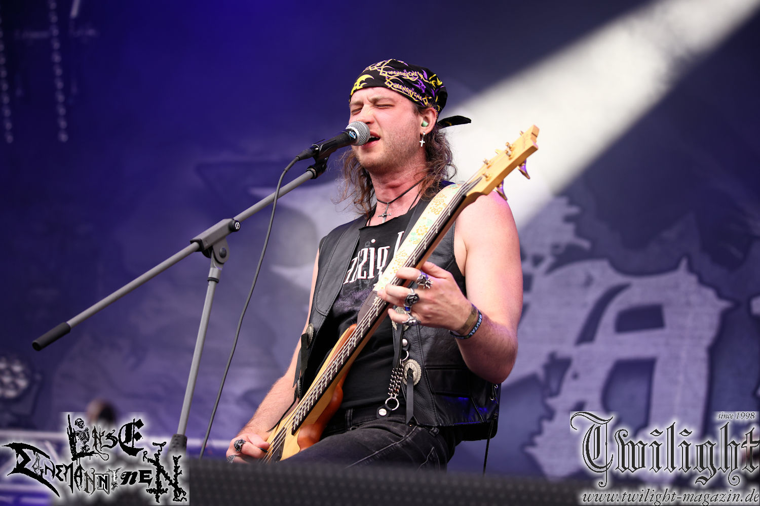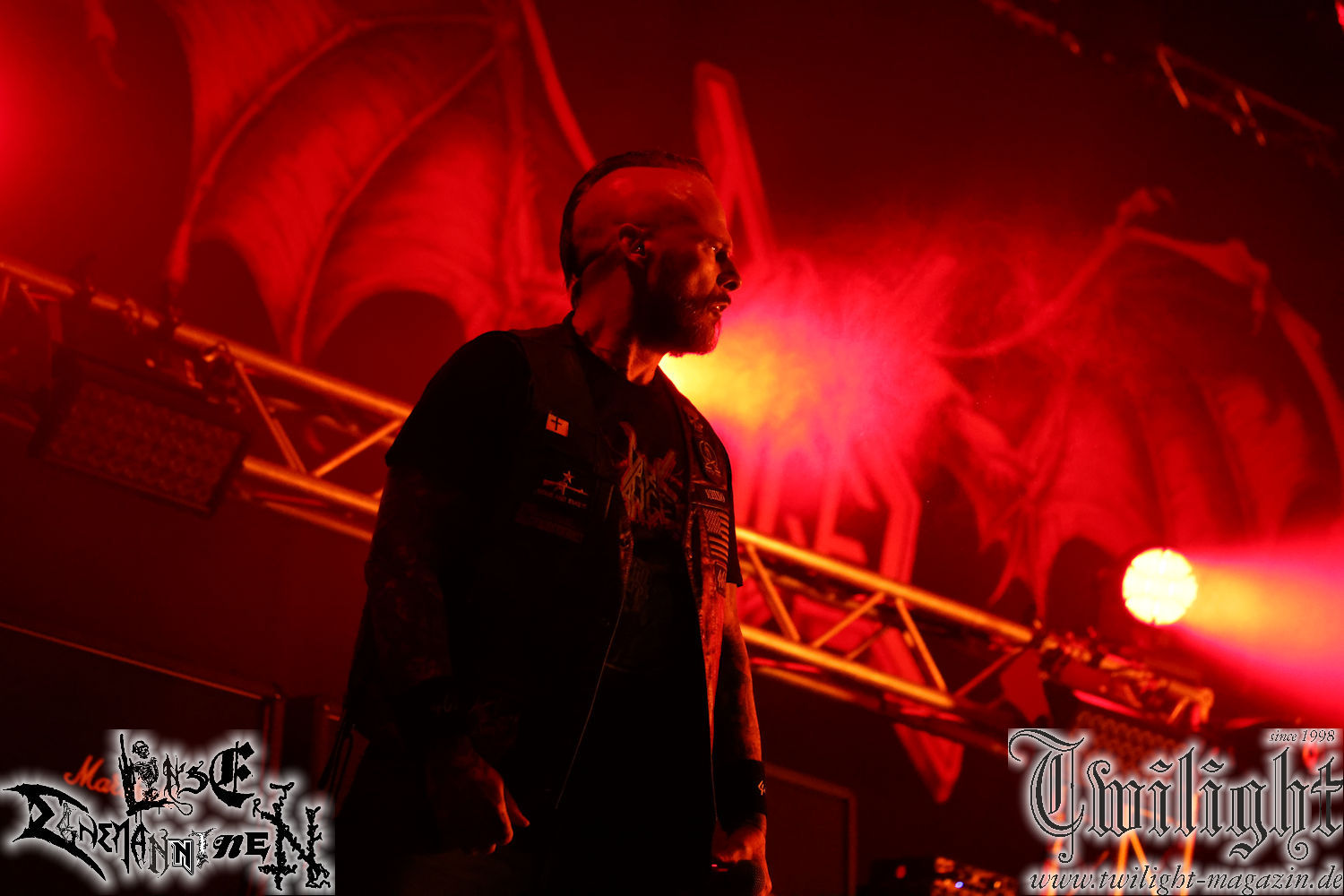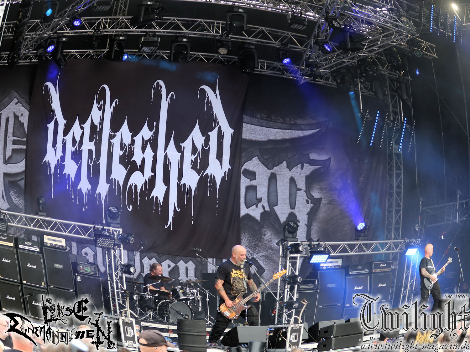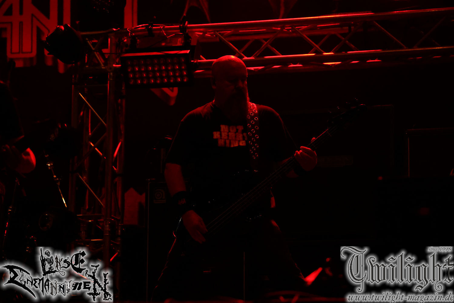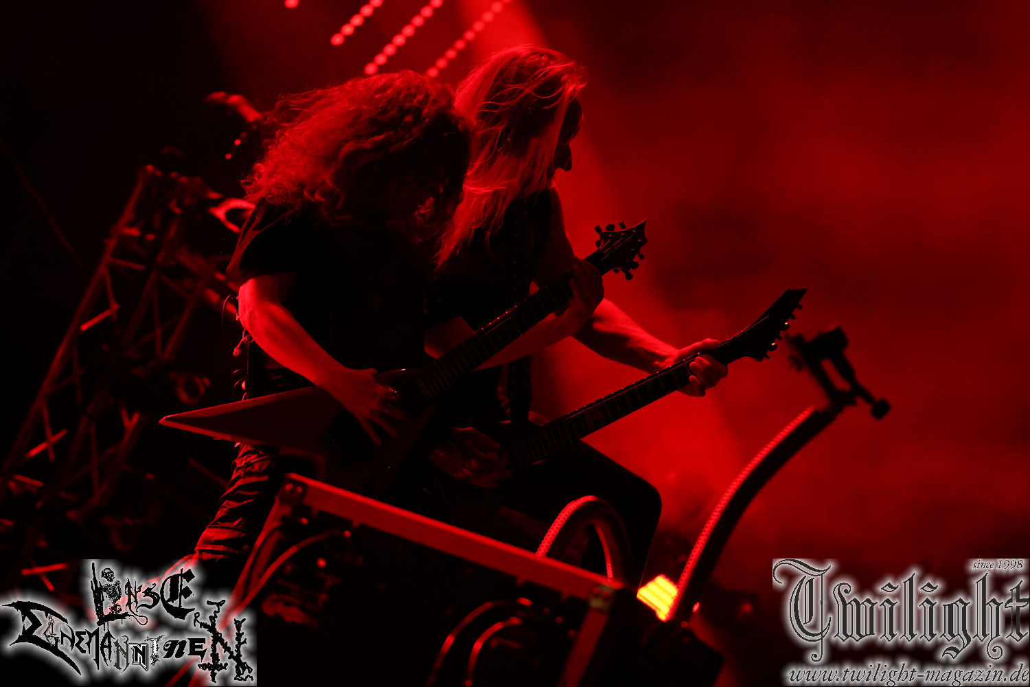 Nachdem ich mich schon die ganze Zeit tierisch darauf gefreut habe, ist es jetzt nun endlich soweit, denn die umwerfenden Night In Gales werden gleich im Zelt loslegen. Ich finde diese Melodic Death Metal - Institution ja wirklich einfach nur genial und ihr Sound ist für mich wunderbar, weshalb ich mich auch erneut mit frischem Bier in der ersten Reihe positioniert habe. Da muss ich einfach ganz vorne mit dabei sein und ich bin echt gespannt, welche Songs sie aus ihrem reichen Fundus wohl spielen werden, immerhin stehen ihnen nur 30 Minuten zur Verfügung. Mein Plan nicht ganz so betrunken zu sein, wie bei ihrem Gig zum 30. Geburtstag von Final Cry in Hannover, ist nicht so ganz aufgegangen, aber immer noch besser als das In Blackest Velvet, Night In Gales, Dew-Scented-Konzert 2001 in Salzgitter im Forellenhof, denn da kann ich mich nur noch teilweise an Dew-Scented erinnern. Egal, denn es geht endlich los und Christian (Gesang), Tobias (Bass), Adriano (Drums) und die Brüder Frank und Jens (beide Gitarre) betreten zu einem schönen Intro sichtlich motiviert die in blaues Licht und Nebel gehüllte sowie jeweils links und rechts von sehr cool aussehenden Sidedrops eingegrenzte Bühne mit dem grandiosen Bandlogo im Hintergrund und legen los. Und zwar mit „Dawnlight Garden“, dem Titelsongs ihres Albums von 2020. Knaller! Gepackt in einen wirklich sehr geilen und fetten Livesound macht sich schon beim ersten Song die große Stärke dieser Band sofort bemerkbar: Umwerfende, packende und emotional sehr mitreißende Melodien gepaart mit bestem Death Metal. Also die ursprüngliche Melo-Death-Schule, so wie ich sie liebe. Anfang der 2000er hatte sich die Band vom Sound her zwar etwas geöffnet, aber für sich festgestellt, dass nur die alte Lehre für sie Sinn macht (nachzulesen im famosen Mørkeskye – Anm. d. Verf.). Das stellen sie mit dem nun folgenden „The Spears Within“ von 2018 mächtig unter Beweis. Wie bereits erwähnt, hat die Band echt Bock, ist bewegungsfreudig und ordentlich am Bangen und Posen, dass es eine wahre Augenfreude ist. Hier wird nicht nur runtergezockt, sondern der eigene Sound erlebt und ausgelebt. Bei solch einer umwerfenden Musik, kann auch keiner unberührt bleiben und um mich herum sehe ich nur strahlende Gesichter und das Zelt ist auch so richtig gut gefüllt. Klasse, das freut mich für die Jungs wirklich sehr. Weiter geht es mit der Hymne „Into The Evergrey“ vom aktuellen Killeralbum „Shadowreaper“. Der Song ist echt sowas von geil, Leute. Als ich das erste Mal das Video sah und hörte, fühlte ich mich sofort in die 90er zurück versetzt, als ich als Teenager vor meiner Anlage saß und mich ergriffen dem Göteborg-Sound hingab. Das ist jetzt nicht anders und ich komme vor Freude gar nicht mehr aus dem Strahlen heraus. Danke dafür Jungs! Kollege Dunemann ist jetzt auch wieder mit dem Fotografieren fertig, hat sich zu mir nach vorne gesellt und mein Vornamensvetter ist ebenfalls anwesend und so feiern wir die Band jetzt gemeinsam ab. „Transition To Doom“ ist dafür auch wie gemacht. Im Rausch der Freude fordern Dunemann und ich den Klassiker „Razor“ und wir haben tatsächlich Glück und nicht nur wir sind entzückt, dass der Song jetzt kommt. Die Stimmung im Zelt kocht und das nicht nur wegen der Hitze. Und dem nicht genug, denn der nächste Klassiker wird uns um unsere Ohren gezimmert, nämlich „Autumn Water“ von „Towards The Twilight“. Wie schön und wenn Night In Gales schon in der alten Schatzkiste kramen, servieren sie uns dann auch noch „Sylphlike“! Ganz grooooßes Kino! Was für ein herrlich intensives und mitreißendes Konzert. Aber auch dieses geht leider irgendwann zu Ende und wird mit einem Klassiker beendet. Aber kein eigener, denn es gibt Iron Maiden ,mit ihrem gleichnamigen Song auf die Ohren und so gehen alle nochmal ordentlich ab und verlassen mehr als zufrieden das Zelt. Danke für dieses tolle Konzert Night In Gales! Ich bin zutiefst zufrieden. Und falls Night In Gales bei euch bisher unter dem Radar liefen und ihr Fans von mitreißenden feurigen, intensiven und von Herzblut angetriebenen Melodic Death Metal der alten Schule seid, ist diese Band für euch Pflicht!