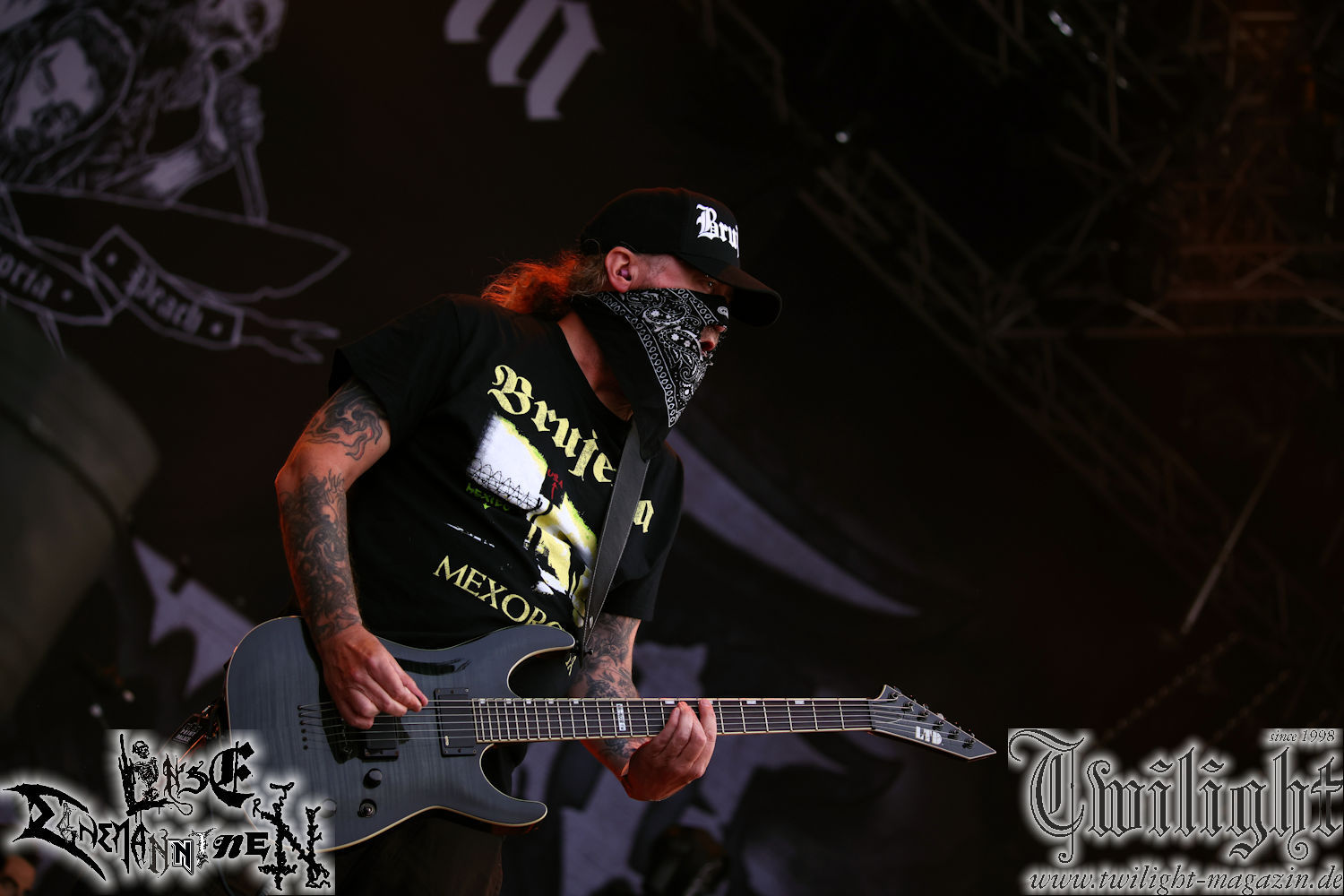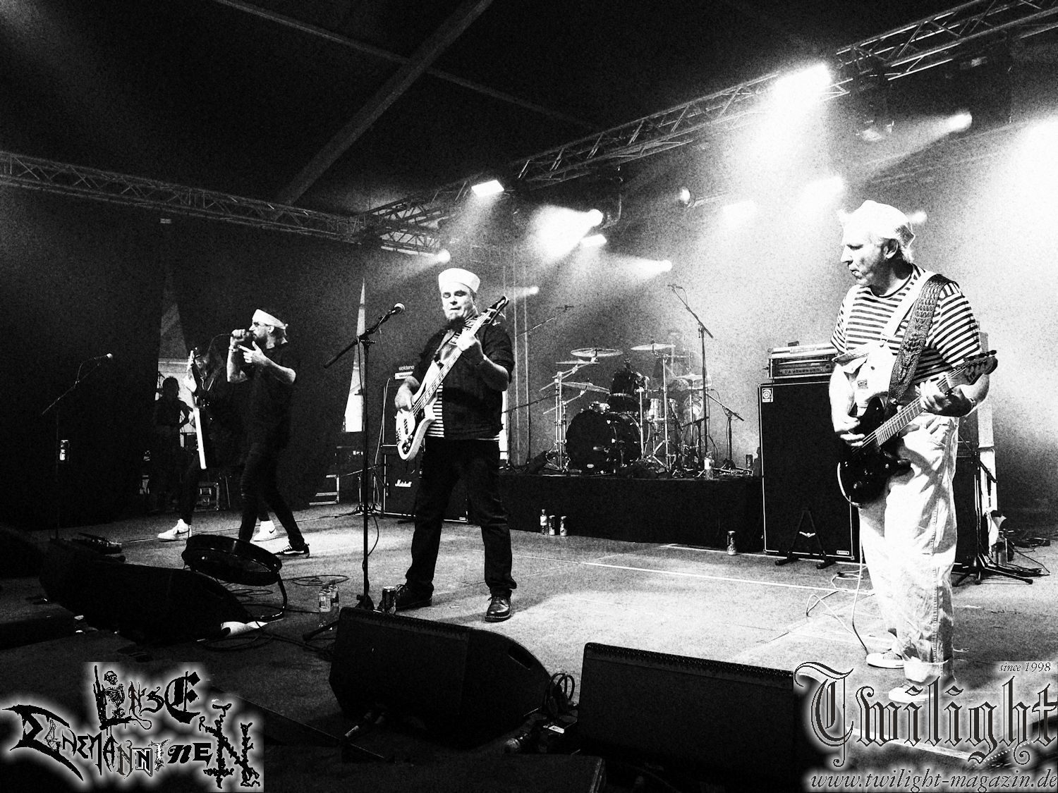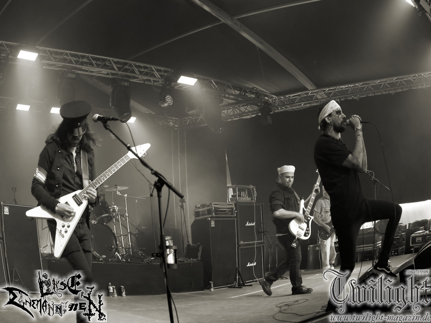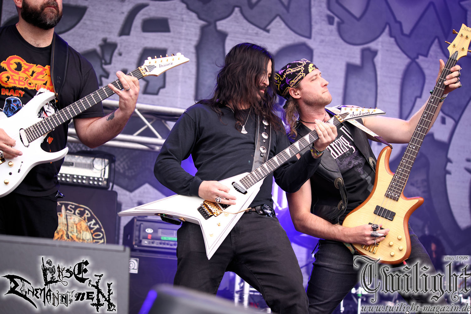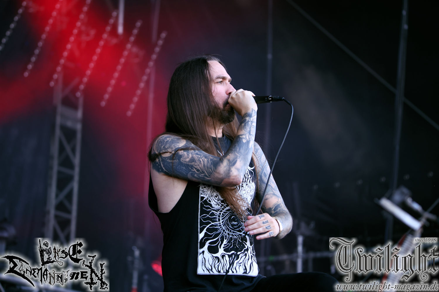 Nachdem ich mich schon die ganze Zeit tierisch darauf gefreut habe, ist es jetzt nun endlich soweit, denn die umwerfenden Night In Gales werden gleich im Zelt loslegen. Ich finde diese Melodic Death Metal - Institution ja wirklich einfach nur genial und ihr Sound ist für mich wunderbar, weshalb ich mich auch erneut mit frischem Bier in der ersten Reihe positioniert habe. Da muss ich einfach ganz vorne mit dabei sein und ich bin echt gespannt, welche Songs sie aus ihrem reichen Fundus wohl spielen werden, immerhin stehen ihnen nur 30 Minuten zur Verfügung. Mein Plan nicht ganz so betrunken zu sein, wie bei ihrem Gig zum 30. Geburtstag von Final Cry in Hannover, ist nicht so ganz aufgegangen, aber immer noch besser als das In Blackest Velvet, Night In Gales, Dew-Scented-Konzert 2001 in Salzgitter im Forellenhof, denn da kann ich mich nur noch teilweise an Dew-Scented erinnern. Egal, denn es geht endlich los und Christian (Gesang), Tobias (Bass), Adriano (Drums) und die Brüder Frank und Jens (beide Gitarre) betreten zu einem schönen Intro sichtlich motiviert die in blaues Licht und Nebel gehüllte sowie jeweils links und rechts von sehr cool aussehenden Sidedrops eingegrenzte Bühne mit dem grandiosen Bandlogo im Hintergrund und legen los. Und zwar mit „Dawnlight Garden“, dem Titelsongs ihres Albums von 2020. Knaller! Gepackt in einen wirklich sehr geilen und fetten Livesound macht sich schon beim ersten Song die große Stärke dieser Band sofort bemerkbar: Umwerfende, packende und emotional sehr mitreißende Melodien gepaart mit bestem Death Metal. Also die ursprüngliche Melo-Death-Schule, so wie ich sie liebe. Anfang der 2000er hatte sich die Band vom Sound her zwar etwas geöffnet, aber für sich festgestellt, dass nur die alte Lehre für sie Sinn macht (nachzulesen im famosen Mørkeskye – Anm. d. Verf.). Das stellen sie mit dem nun folgenden „The Spears Within“ von 2018 mächtig unter Beweis. Wie bereits erwähnt, hat die Band echt Bock, ist bewegungsfreudig und ordentlich am Bangen und Posen, dass es eine wahre Augenfreude ist. Hier wird nicht nur runtergezockt, sondern der eigene Sound erlebt und ausgelebt. Bei solch einer umwerfenden Musik, kann auch keiner unberührt bleiben und um mich herum sehe ich nur strahlende Gesichter und das Zelt ist auch so richtig gut gefüllt. Klasse, das freut mich für die Jungs wirklich sehr. Weiter geht es mit der Hymne „Into The Evergrey“ vom aktuellen Killeralbum „Shadowreaper“. Der Song ist echt sowas von geil, Leute. Als ich das erste Mal das Video sah und hörte, fühlte ich mich sofort in die 90er zurück versetzt, als ich als Teenager vor meiner Anlage saß und mich ergriffen dem Göteborg-Sound hingab. Das ist jetzt nicht anders und ich komme vor Freude gar nicht mehr aus dem Strahlen heraus. Danke dafür Jungs! Kollege Dunemann ist jetzt auch wieder mit dem Fotografieren fertig, hat sich zu mir nach vorne gesellt und mein Vornamensvetter ist ebenfalls anwesend und so feiern wir die Band jetzt gemeinsam ab. „Transition To Doom“ ist dafür auch wie gemacht. Im Rausch der Freude fordern Dunemann und ich den Klassiker „Razor“ und wir haben tatsächlich Glück und nicht nur wir sind entzückt, dass der Song jetzt kommt. Die Stimmung im Zelt kocht und das nicht nur wegen der Hitze. Und dem nicht genug, denn der nächste Klassiker wird uns um unsere Ohren gezimmert, nämlich „Autumn Water“ von „Towards The Twilight“. Wie schön und wenn Night In Gales schon in der alten Schatzkiste kramen, servieren sie uns dann auch noch „Sylphlike“! Ganz grooooßes Kino! Was für ein herrlich intensives und mitreißendes Konzert. Aber auch dieses geht leider irgendwann zu Ende und wird mit einem Klassiker beendet. Aber kein eigener, denn es gibt Iron Maiden ,mit ihrem gleichnamigen Song auf die Ohren und so gehen alle nochmal ordentlich ab und verlassen mehr als zufrieden das Zelt. Danke für dieses tolle Konzert Night In Gales! Ich bin zutiefst zufrieden. Und falls Night In Gales bei euch bisher unter dem Radar liefen und ihr Fans von mitreißenden feurigen, intensiven und von Herzblut angetriebenen Melodic Death Metal der alten Schule seid, ist diese Band für euch Pflicht!