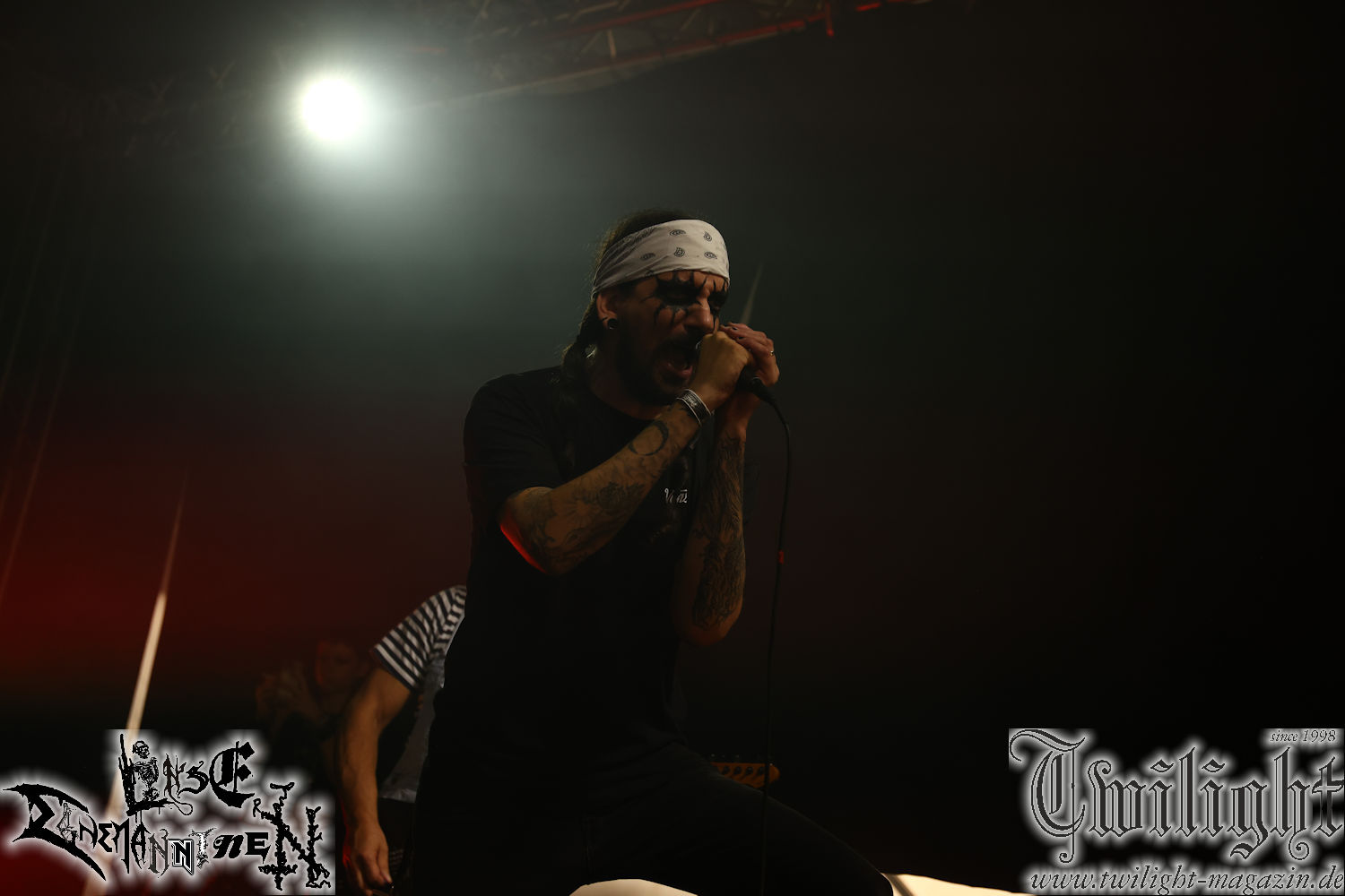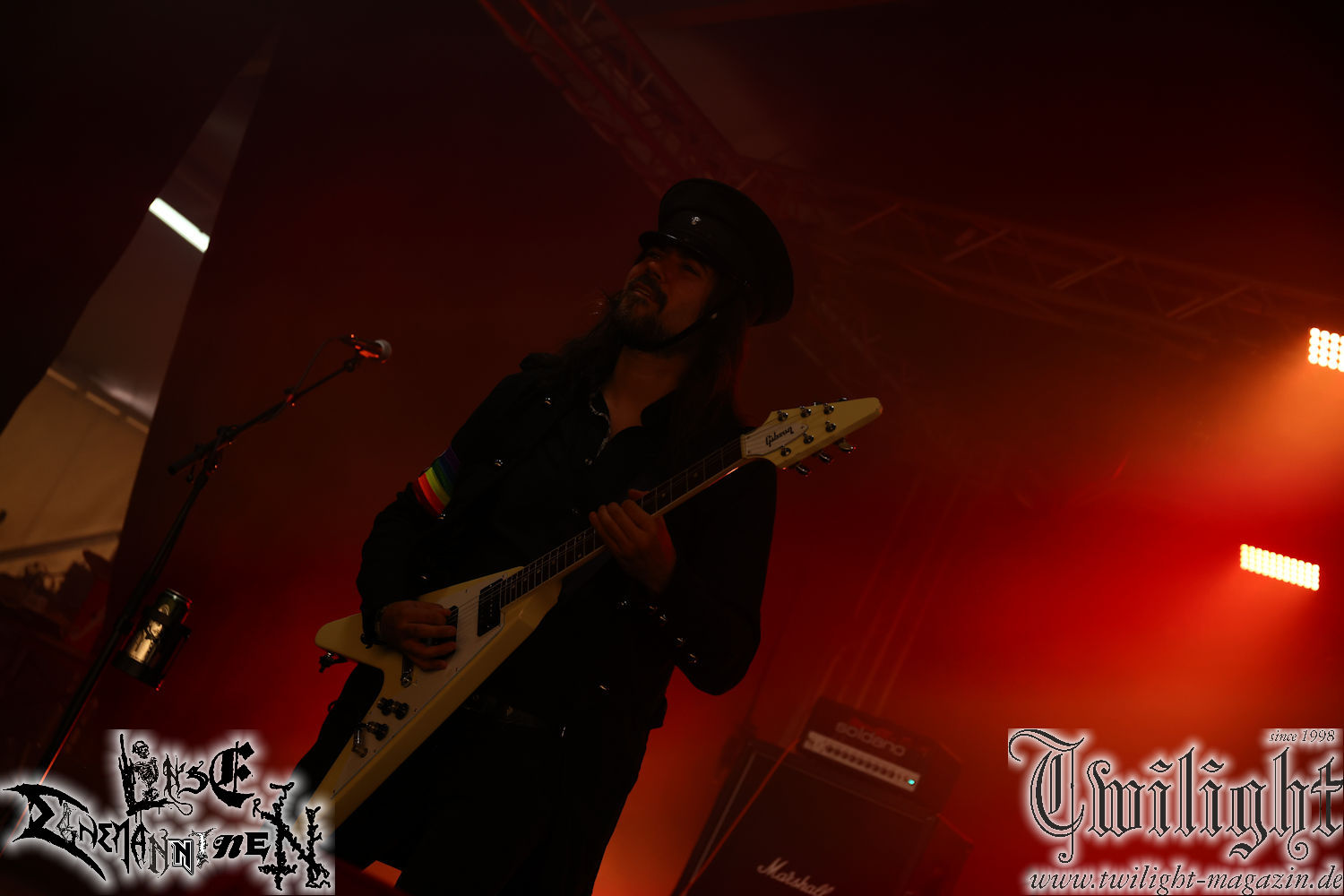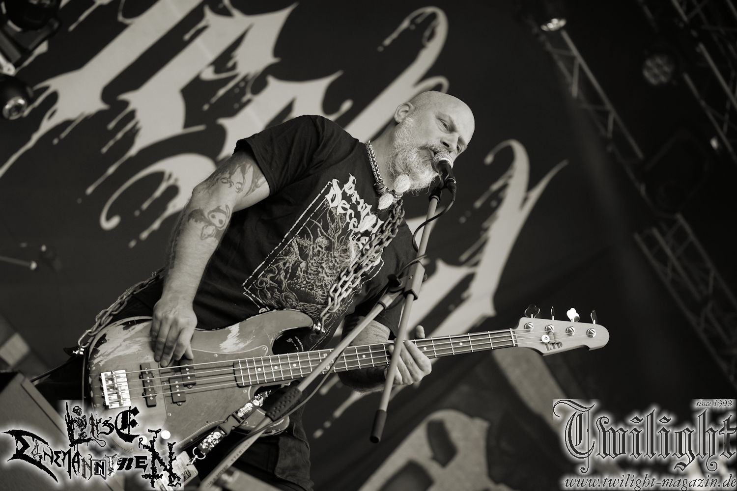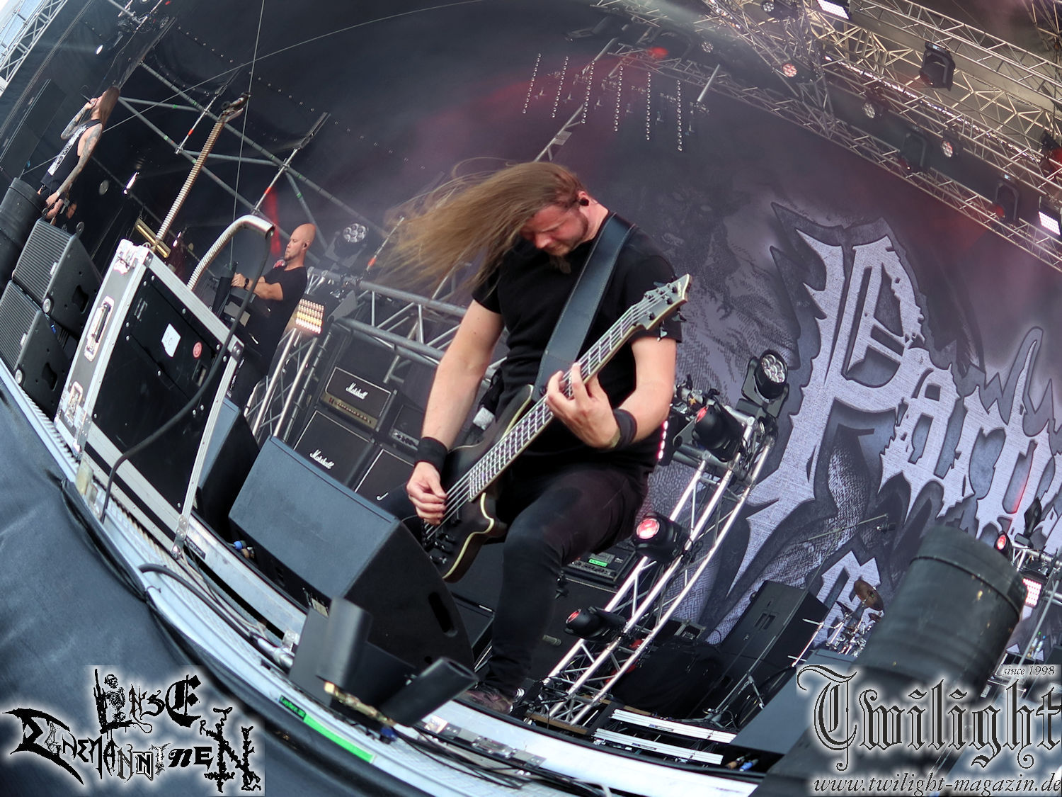 Nachdem ich mich schon die ganze Zeit tierisch darauf gefreut habe, ist es jetzt nun endlich soweit, denn die umwerfenden Night In Gales werden gleich im Zelt loslegen. Ich finde diese Melodic Death Metal - Institution ja wirklich einfach nur genial und ihr Sound ist für mich wunderbar, weshalb ich mich auch erneut mit frischem Bier in der ersten Reihe positioniert habe. Da muss ich einfach ganz vorne mit dabei sein und ich bin echt gespannt, welche Songs sie aus ihrem reichen Fundus wohl spielen werden, immerhin stehen ihnen nur 30 Minuten zur Verfügung. Mein Plan nicht ganz so betrunken zu sein, wie bei ihrem Gig zum 30. Geburtstag von Final Cry in Hannover, ist nicht so ganz aufgegangen, aber immer noch besser als das In Blackest Velvet, Night In Gales, Dew-Scented-Konzert 2001 in Salzgitter im Forellenhof, denn da kann ich mich nur noch teilweise an Dew-Scented erinnern. Egal, denn es geht endlich los und Christian (Gesang), Tobias (Bass), Adriano (Drums) und die Brüder Frank und Jens (beide Gitarre) betreten zu einem schönen Intro sichtlich motiviert die in blaues Licht und Nebel gehüllte sowie jeweils links und rechts von sehr cool aussehenden Sidedrops eingegrenzte Bühne mit dem grandiosen Bandlogo im Hintergrund und legen los. Und zwar mit „Dawnlight Garden“, dem Titelsongs ihres Albums von 2020. Knaller! Gepackt in einen wirklich sehr geilen und fetten Livesound macht sich schon beim ersten Song die große Stärke dieser Band sofort bemerkbar: Umwerfende, packende und emotional sehr mitreißende Melodien gepaart mit bestem Death Metal. Also die ursprüngliche Melo-Death-Schule, so wie ich sie liebe. Anfang der 2000er hatte sich die Band vom Sound her zwar etwas geöffnet, aber für sich festgestellt, dass nur die alte Lehre für sie Sinn macht (nachzulesen im famosen Mørkeskye – Anm. d. Verf.). Das stellen sie mit dem nun folgenden „The Spears Within“ von 2018 mächtig unter Beweis. Wie bereits erwähnt, hat die Band echt Bock, ist bewegungsfreudig und ordentlich am Bangen und Posen, dass es eine wahre Augenfreude ist. Hier wird nicht nur runtergezockt, sondern der eigene Sound erlebt und ausgelebt. Bei solch einer umwerfenden Musik, kann auch keiner unberührt bleiben und um mich herum sehe ich nur strahlende Gesichter und das Zelt ist auch so richtig gut gefüllt. Klasse, das freut mich für die Jungs wirklich sehr. Weiter geht es mit der Hymne „Into The Evergrey“ vom aktuellen Killeralbum „Shadowreaper“. Der Song ist echt sowas von geil, Leute. Als ich das erste Mal das Video sah und hörte, fühlte ich mich sofort in die 90er zurück versetzt, als ich als Teenager vor meiner Anlage saß und mich ergriffen dem Göteborg-Sound hingab. Das ist jetzt nicht anders und ich komme vor Freude gar nicht mehr aus dem Strahlen heraus. Danke dafür Jungs! Kollege Dunemann ist jetzt auch wieder mit dem Fotografieren fertig, hat sich zu mir nach vorne gesellt und mein Vornamensvetter ist ebenfalls anwesend und so feiern wir die Band jetzt gemeinsam ab. „Transition To Doom“ ist dafür auch wie gemacht. Im Rausch der Freude fordern Dunemann und ich den Klassiker „Razor“ und wir haben tatsächlich Glück und nicht nur wir sind entzückt, dass der Song jetzt kommt. Die Stimmung im Zelt kocht und das nicht nur wegen der Hitze. Und dem nicht genug, denn der nächste Klassiker wird uns um unsere Ohren gezimmert, nämlich „Autumn Water“ von „Towards The Twilight“. Wie schön und wenn Night In Gales schon in der alten Schatzkiste kramen, servieren sie uns dann auch noch „Sylphlike“! Ganz grooooßes Kino! Was für ein herrlich intensives und mitreißendes Konzert. Aber auch dieses geht leider irgendwann zu Ende und wird mit einem Klassiker beendet. Aber kein eigener, denn es gibt Iron Maiden ,mit ihrem gleichnamigen Song auf die Ohren und so gehen alle nochmal ordentlich ab und verlassen mehr als zufrieden das Zelt. Danke für dieses tolle Konzert Night In Gales! Ich bin zutiefst zufrieden. Und falls Night In Gales bei euch bisher unter dem Radar liefen und ihr Fans von mitreißenden feurigen, intensiven und von Herzblut angetriebenen Melodic Death Metal der alten Schule seid, ist diese Band für euch Pflicht!