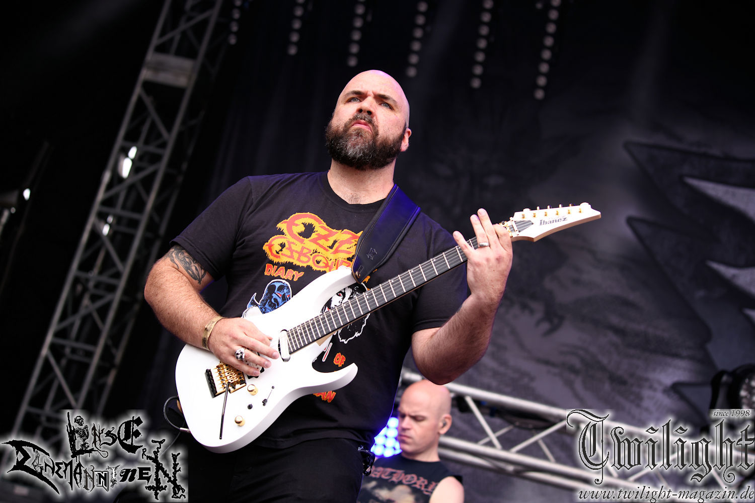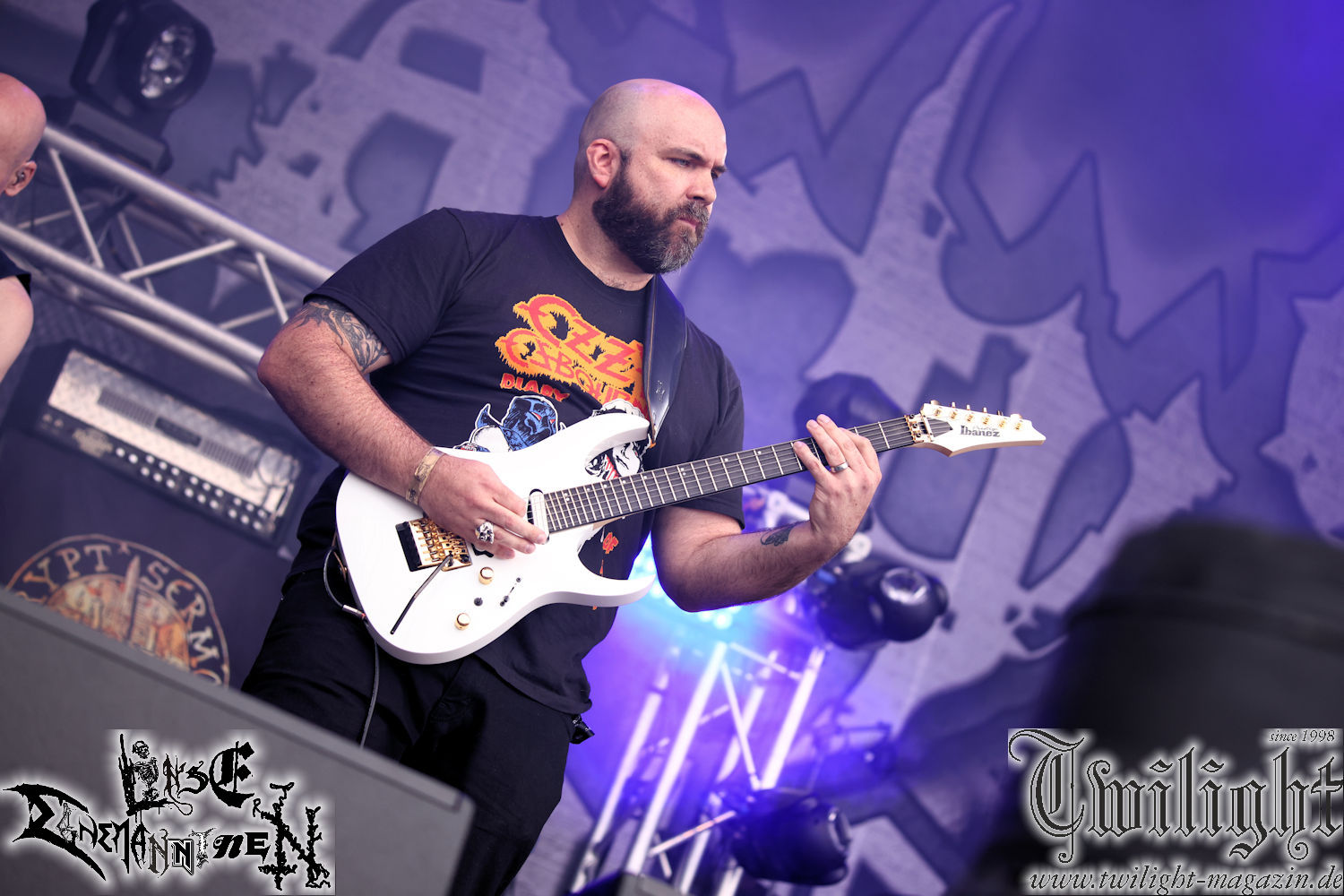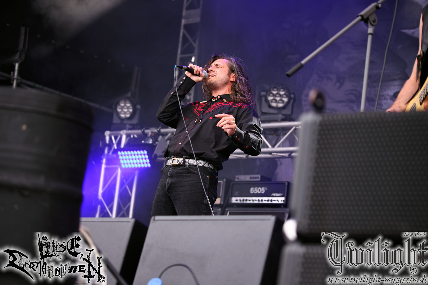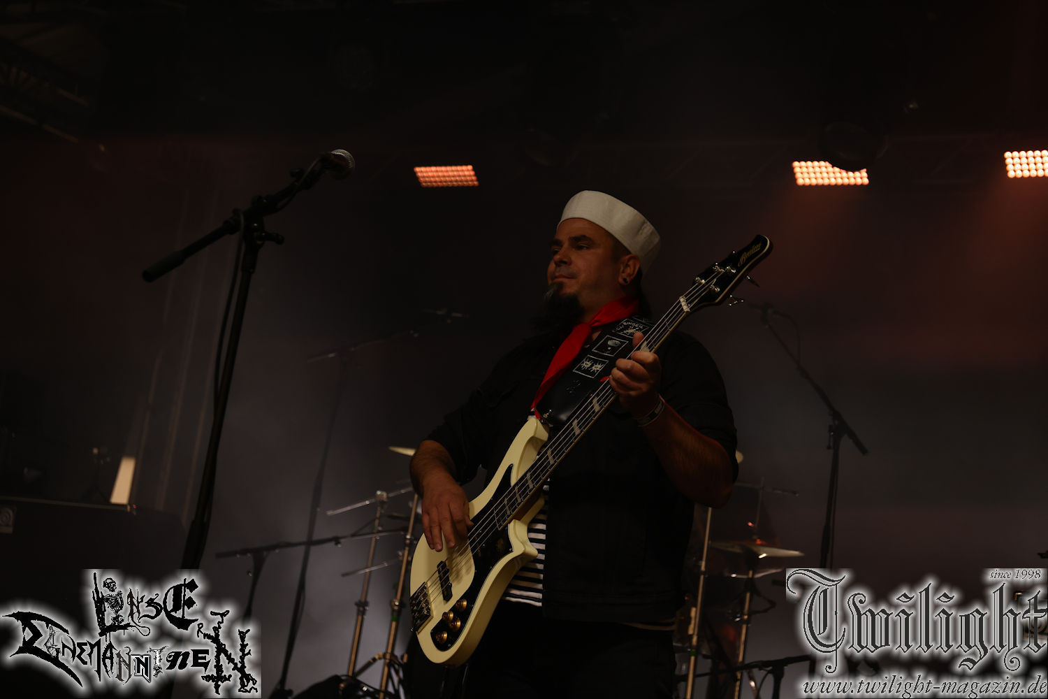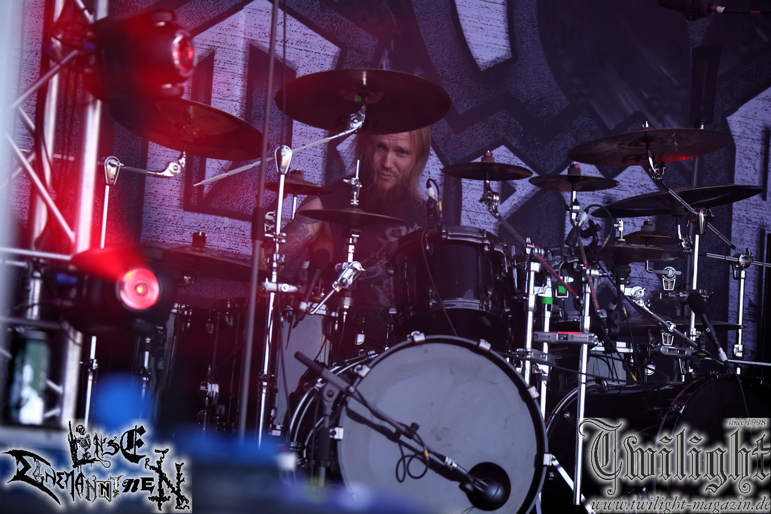Nachdem ich mich schon die ganze Zeit tierisch darauf gefreut habe, ist es jetzt nun endlich soweit, denn die umwerfenden Night In Gales werden gleich im Zelt loslegen. Ich finde diese Melodic Death Metal - Institution ja wirklich einfach nur genial und ihr Sound ist für mich wunderbar, weshalb ich mich auch erneut mit frischem Bier in der ersten Reihe positioniert habe. Da muss ich einfach ganz vorne mit dabei sein und ich bin echt gespannt, welche Songs sie aus ihrem reichen Fundus wohl spielen werden, immerhin stehen ihnen nur 30 Minuten zur Verfügung. Mein Plan nicht ganz so betrunken zu sein, wie bei ihrem Gig zum 30. Geburtstag von Final Cry in Hannover, ist nicht so ganz aufgegangen, aber immer noch besser als das In Blackest Velvet, Night In Gales, Dew-Scented-Konzert 2001 in Salzgitter im Forellenhof, denn da kann ich mich nur noch teilweise an Dew-Scented erinnern. Egal, denn es geht endlich los und Christian (Gesang), Tobias (Bass), Adriano (Drums) und die Brüder Frank und Jens (beide Gitarre) betreten zu einem schönen Intro sichtlich motiviert die in blaues Licht und Nebel gehüllte sowie jeweils links und rechts von sehr cool aussehenden Sidedrops eingegrenzte Bühne mit dem grandiosen Bandlogo im Hintergrund und legen los. Und zwar mit „Dawnlight Garden“, dem Titelsongs ihres Albums von 2020. Knaller! Gepackt in einen wirklich sehr geilen und fetten Livesound macht sich schon beim ersten Song die große Stärke dieser Band sofort bemerkbar: Umwerfende, packende und emotional sehr mitreißende Melodien gepaart mit bestem Death Metal. Also die ursprüngliche Melo-Death-Schule, so wie ich sie liebe. Anfang der 2000er hatte sich die Band vom Sound her zwar etwas geöffnet, aber für sich festgestellt, dass nur die alte Lehre für sie Sinn macht (nachzulesen im famosen Mørkeskye – Anm. d. Verf.). Das stellen sie mit dem nun folgenden „The Spears Within“ von 2018 mächtig unter Beweis. Wie bereits erwähnt, hat die Band echt Bock, ist bewegungsfreudig und ordentlich am Bangen und Posen, dass es eine wahre Augenfreude ist. Hier wird nicht nur runtergezockt, sondern der eigene Sound erlebt und ausgelebt. Bei solch einer umwerfenden Musik, kann auch keiner unberührt bleiben und um mich herum sehe ich nur strahlende Gesichter und das Zelt ist auch so richtig gut gefüllt. Klasse, das freut mich für die Jungs wirklich sehr. Weiter geht es mit der Hymne „Into The Evergrey“ vom aktuellen Killeralbum „Shadowreaper“. Der Song ist echt sowas von geil, Leute. Als ich das erste Mal das Video sah und hörte, fühlte ich mich sofort in die 90er zurück versetzt, als ich als Teenager vor meiner Anlage saß und mich ergriffen dem Göteborg-Sound hingab. Das ist jetzt nicht anders und ich komme vor Freude gar nicht mehr aus dem Strahlen heraus. Danke dafür Jungs! Kollege Dunemann ist jetzt auch wieder mit dem Fotografieren fertig, hat sich zu mir nach vorne gesellt und mein Vornamensvetter ist ebenfalls anwesend und so feiern wir die Band jetzt gemeinsam ab. „Transition To Doom“ ist dafür auch wie gemacht. Im Rausch der Freude fordern Dunemann und ich den Klassiker „Razor“ und wir haben tatsächlich Glück und nicht nur wir sind entzückt, dass der Song jetzt kommt. Die Stimmung im Zelt kocht und das nicht nur wegen der Hitze. Und dem nicht genug, denn der nächste Klassiker wird uns um unsere Ohren gezimmert, nämlich „Autumn Water“ von „Towards The Twilight“. Wie schön und wenn Night In Gales schon in der alten Schatzkiste kramen, servieren sie uns dann auch noch „Sylphlike“! Ganz grooooßes Kino! Was für ein herrlich intensives und mitreißendes Konzert. Aber auch dieses geht leider irgendwann zu Ende und wird mit einem Klassiker beendet. Aber kein eigener, denn es gibt Iron Maiden ,mit ihrem gleichnamigen Song auf die Ohren und so gehen alle nochmal ordentlich ab und verlassen mehr als zufrieden das Zelt. Danke für dieses tolle Konzert Night In Gales! Ich bin zutiefst zufrieden. Und falls Night In Gales bei euch bisher unter dem Radar liefen und ihr Fans von mitreißenden feurigen, intensiven und von Herzblut angetriebenen Melodic Death Metal der alten Schule seid, ist diese Band für euch Pflicht!