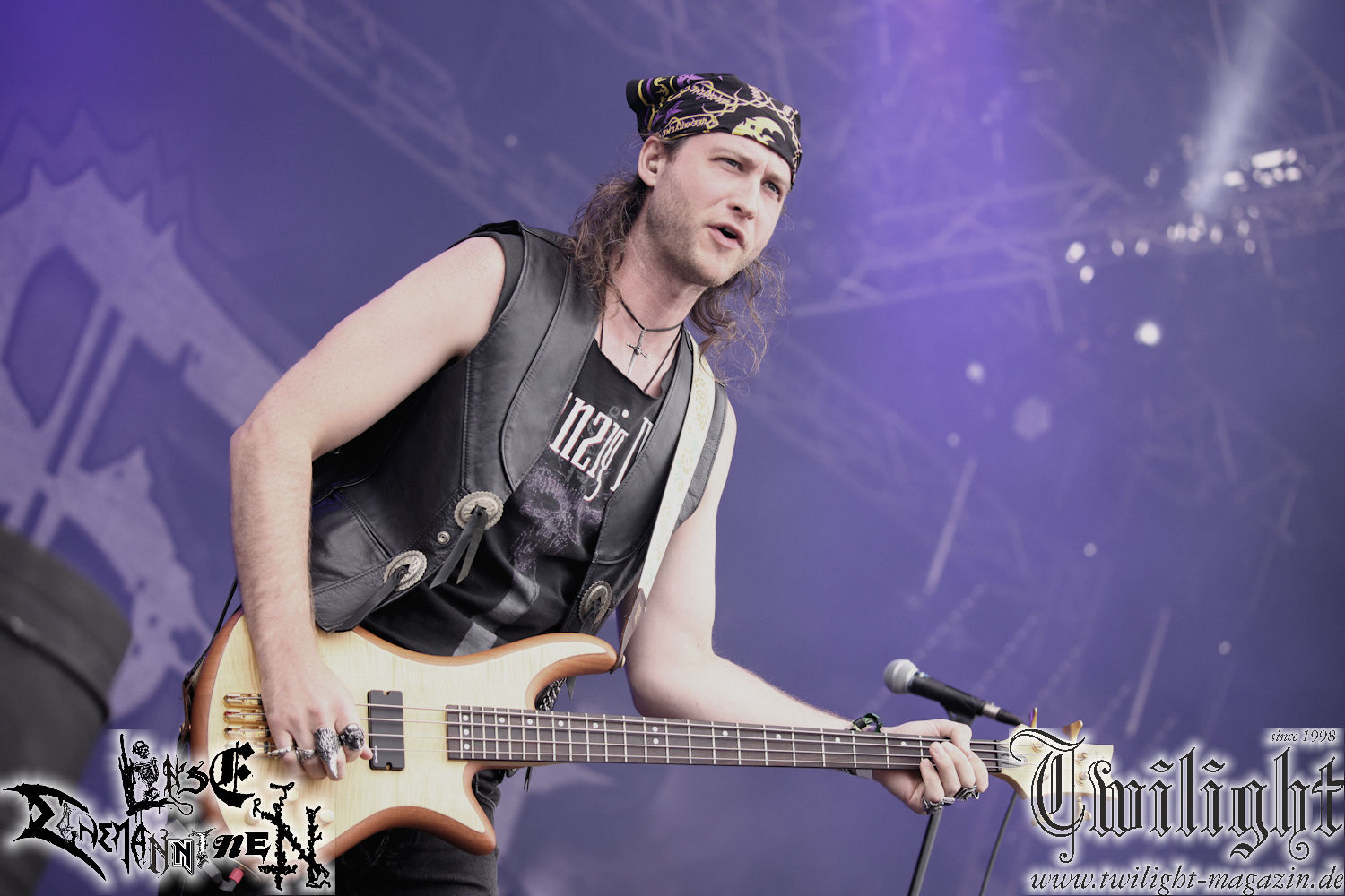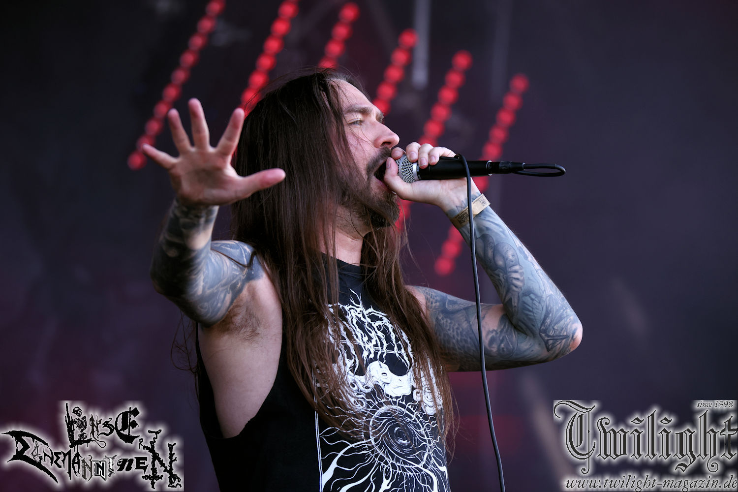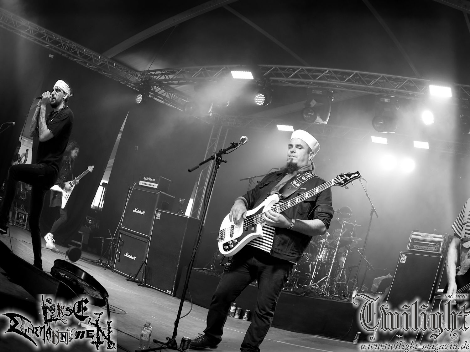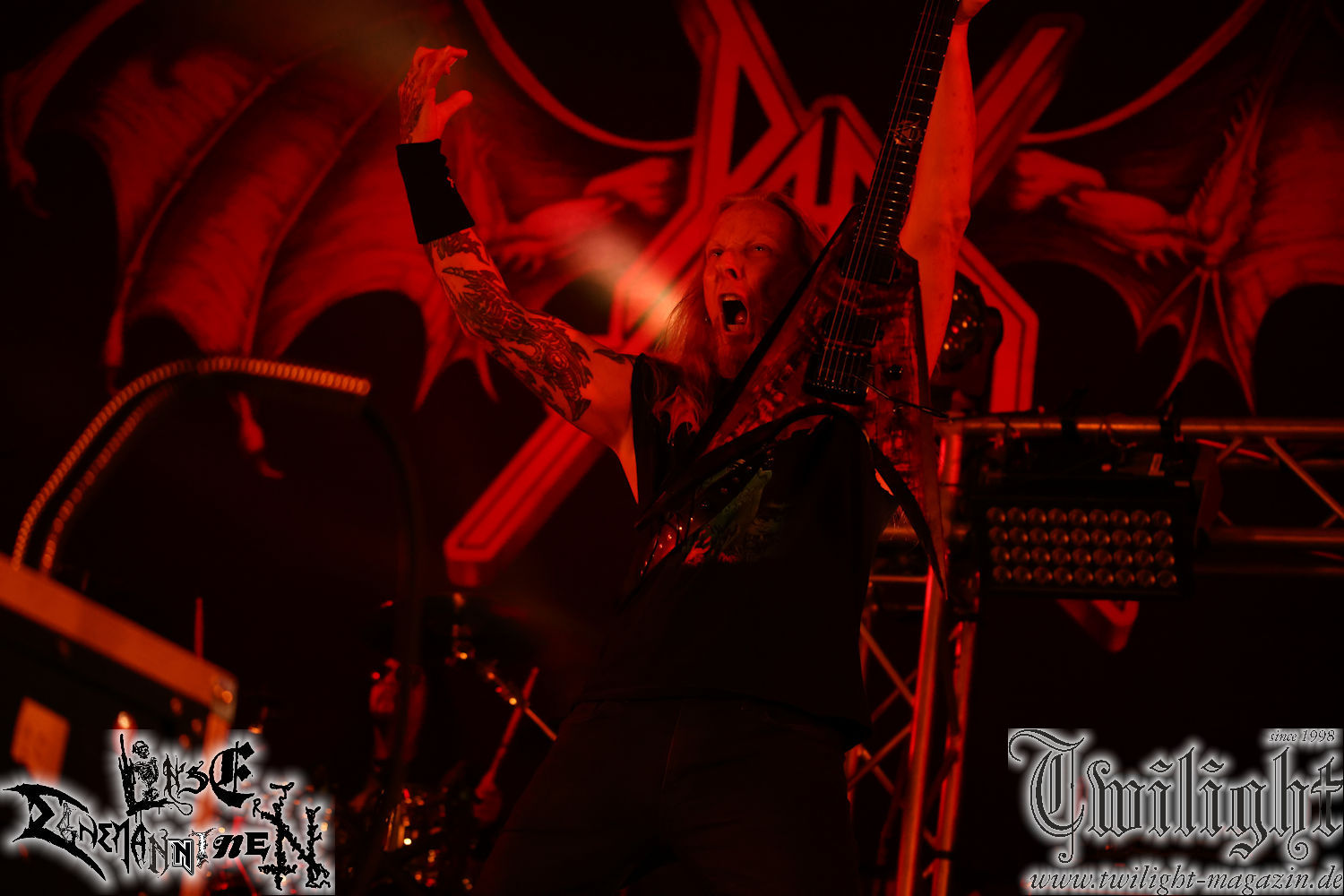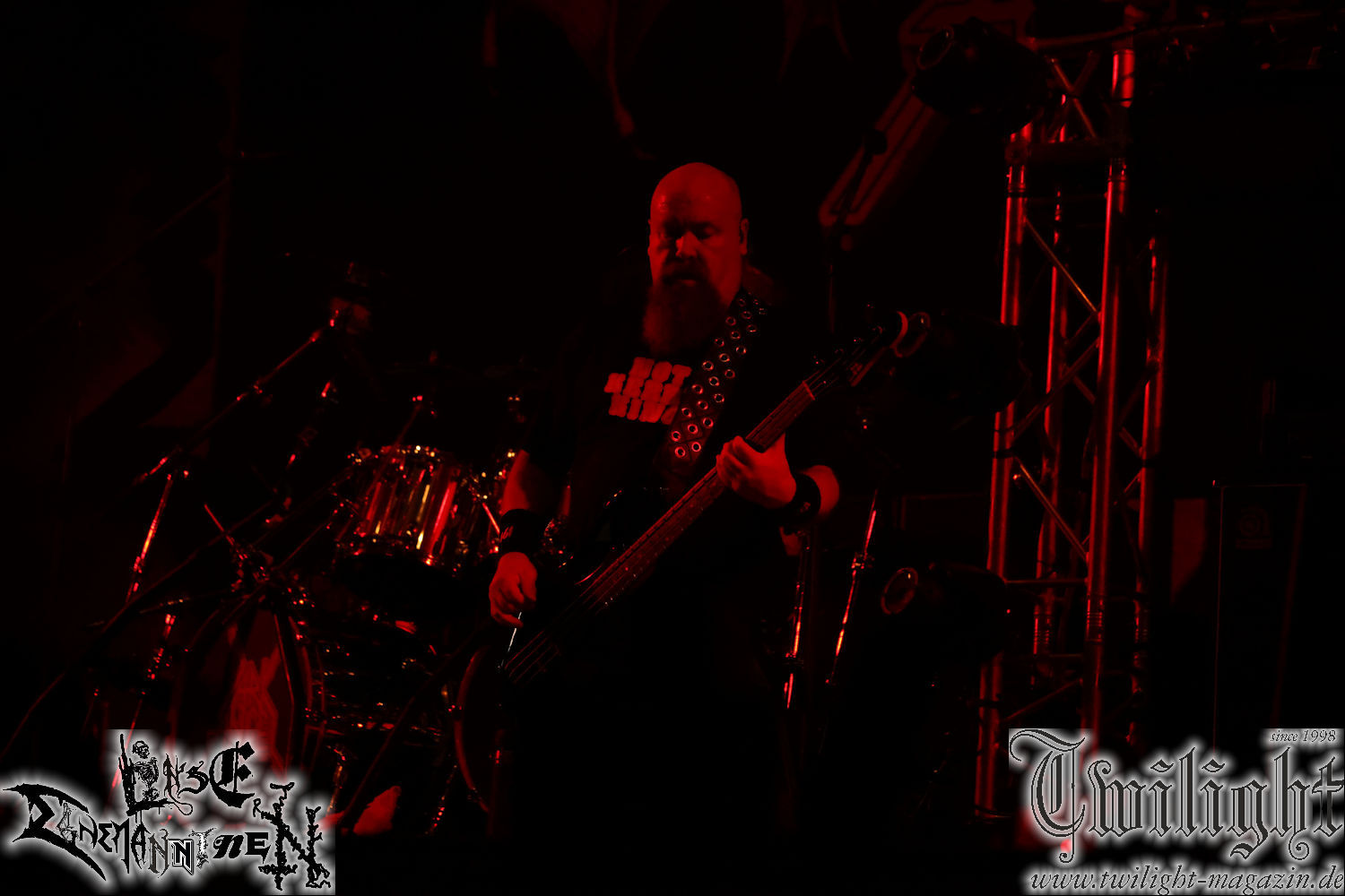 Nachdem ich mich schon die ganze Zeit tierisch darauf gefreut habe, ist es jetzt nun endlich soweit, denn die umwerfenden Night In Gales werden gleich im Zelt loslegen. Ich finde diese Melodic Death Metal - Institution ja wirklich einfach nur genial und ihr Sound ist für mich wunderbar, weshalb ich mich auch erneut mit frischem Bier in der ersten Reihe positioniert habe. Da muss ich einfach ganz vorne mit dabei sein und ich bin echt gespannt, welche Songs sie aus ihrem reichen Fundus wohl spielen werden, immerhin stehen ihnen nur 30 Minuten zur Verfügung. Mein Plan nicht ganz so betrunken zu sein, wie bei ihrem Gig zum 30. Geburtstag von Final Cry in Hannover, ist nicht so ganz aufgegangen, aber immer noch besser als das In Blackest Velvet, Night In Gales, Dew-Scented-Konzert 2001 in Salzgitter im Forellenhof, denn da kann ich mich nur noch teilweise an Dew-Scented erinnern. Egal, denn es geht endlich los und Christian (Gesang), Tobias (Bass), Adriano (Drums) und die Brüder Frank und Jens (beide Gitarre) betreten zu einem schönen Intro sichtlich motiviert die in blaues Licht und Nebel gehüllte sowie jeweils links und rechts von sehr cool aussehenden Sidedrops eingegrenzte Bühne mit dem grandiosen Bandlogo im Hintergrund und legen los. Und zwar mit „Dawnlight Garden“, dem Titelsongs ihres Albums von 2020. Knaller! Gepackt in einen wirklich sehr geilen und fetten Livesound macht sich schon beim ersten Song die große Stärke dieser Band sofort bemerkbar: Umwerfende, packende und emotional sehr mitreißende Melodien gepaart mit bestem Death Metal. Also die ursprüngliche Melo-Death-Schule, so wie ich sie liebe. Anfang der 2000er hatte sich die Band vom Sound her zwar etwas geöffnet, aber für sich festgestellt, dass nur die alte Lehre für sie Sinn macht (nachzulesen im famosen Mørkeskye – Anm. d. Verf.). Das stellen sie mit dem nun folgenden „The Spears Within“ von 2018 mächtig unter Beweis. Wie bereits erwähnt, hat die Band echt Bock, ist bewegungsfreudig und ordentlich am Bangen und Posen, dass es eine wahre Augenfreude ist. Hier wird nicht nur runtergezockt, sondern der eigene Sound erlebt und ausgelebt. Bei solch einer umwerfenden Musik, kann auch keiner unberührt bleiben und um mich herum sehe ich nur strahlende Gesichter und das Zelt ist auch so richtig gut gefüllt. Klasse, das freut mich für die Jungs wirklich sehr. Weiter geht es mit der Hymne „Into The Evergrey“ vom aktuellen Killeralbum „Shadowreaper“. Der Song ist echt sowas von geil, Leute. Als ich das erste Mal das Video sah und hörte, fühlte ich mich sofort in die 90er zurück versetzt, als ich als Teenager vor meiner Anlage saß und mich ergriffen dem Göteborg-Sound hingab. Das ist jetzt nicht anders und ich komme vor Freude gar nicht mehr aus dem Strahlen heraus. Danke dafür Jungs! Kollege Dunemann ist jetzt auch wieder mit dem Fotografieren fertig, hat sich zu mir nach vorne gesellt und mein Vornamensvetter ist ebenfalls anwesend und so feiern wir die Band jetzt gemeinsam ab. „Transition To Doom“ ist dafür auch wie gemacht. Im Rausch der Freude fordern Dunemann und ich den Klassiker „Razor“ und wir haben tatsächlich Glück und nicht nur wir sind entzückt, dass der Song jetzt kommt. Die Stimmung im Zelt kocht und das nicht nur wegen der Hitze. Und dem nicht genug, denn der nächste Klassiker wird uns um unsere Ohren gezimmert, nämlich „Autumn Water“ von „Towards The Twilight“. Wie schön und wenn Night In Gales schon in der alten Schatzkiste kramen, servieren sie uns dann auch noch „Sylphlike“! Ganz grooooßes Kino! Was für ein herrlich intensives und mitreißendes Konzert. Aber auch dieses geht leider irgendwann zu Ende und wird mit einem Klassiker beendet. Aber kein eigener, denn es gibt Iron Maiden ,mit ihrem gleichnamigen Song auf die Ohren und so gehen alle nochmal ordentlich ab und verlassen mehr als zufrieden das Zelt. Danke für dieses tolle Konzert Night In Gales! Ich bin zutiefst zufrieden. Und falls Night In Gales bei euch bisher unter dem Radar liefen und ihr Fans von mitreißenden feurigen, intensiven und von Herzblut angetriebenen Melodic Death Metal der alten Schule seid, ist diese Band für euch Pflicht!