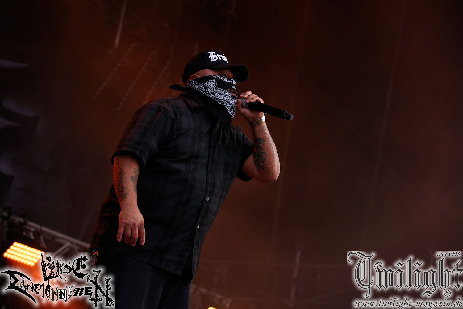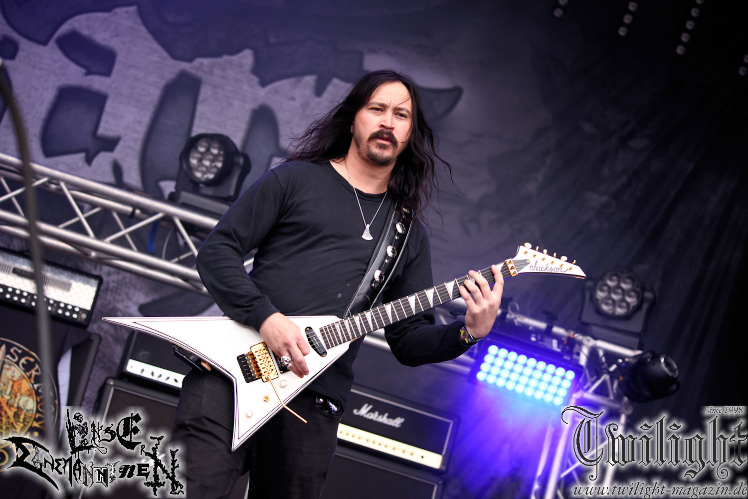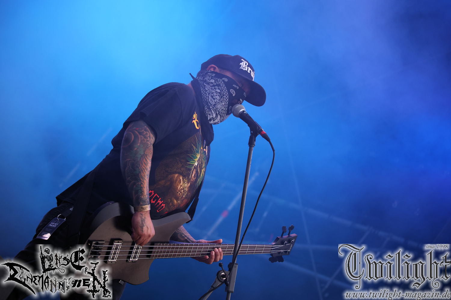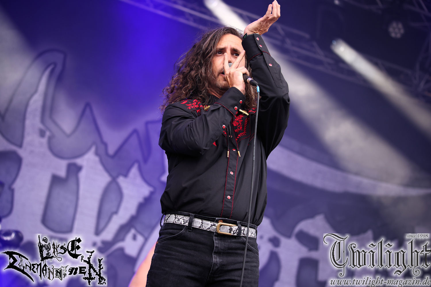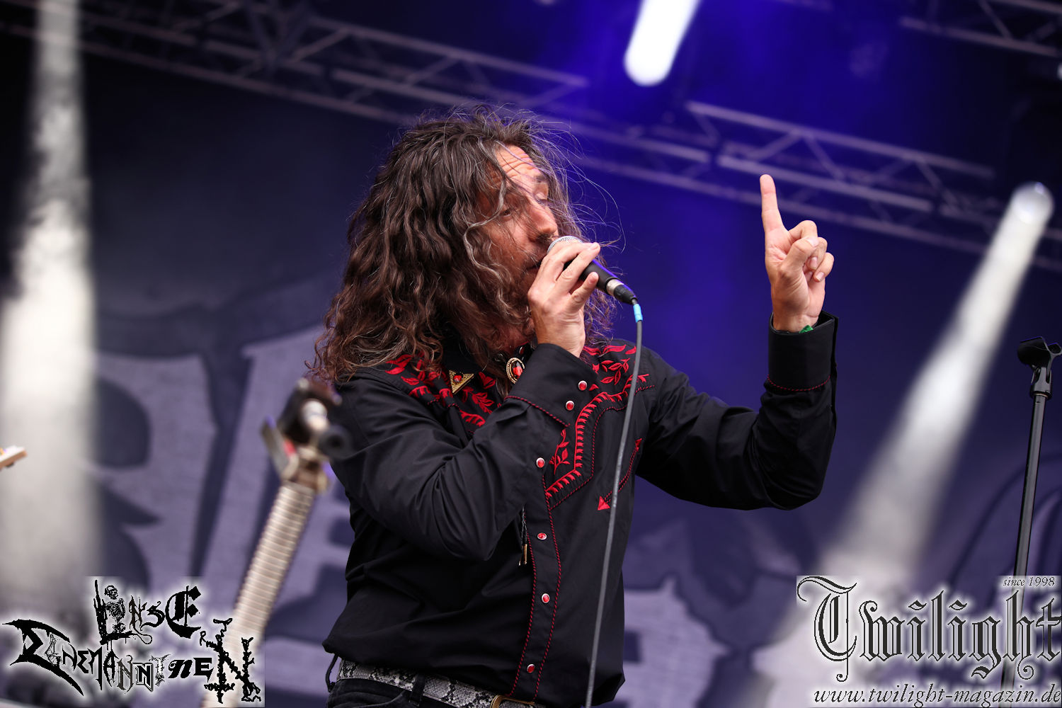 Nachdem ich mich schon die ganze Zeit tierisch darauf gefreut habe, ist es jetzt nun endlich soweit, denn die umwerfenden Night In Gales werden gleich im Zelt loslegen. Ich finde diese Melodic Death Metal - Institution ja wirklich einfach nur genial und ihr Sound ist für mich wunderbar, weshalb ich mich auch erneut mit frischem Bier in der ersten Reihe positioniert habe. Da muss ich einfach ganz vorne mit dabei sein und ich bin echt gespannt, welche Songs sie aus ihrem reichen Fundus wohl spielen werden, immerhin stehen ihnen nur 30 Minuten zur Verfügung. Mein Plan nicht ganz so betrunken zu sein, wie bei ihrem Gig zum 30. Geburtstag von Final Cry in Hannover, ist nicht so ganz aufgegangen, aber immer noch besser als das In Blackest Velvet, Night In Gales, Dew-Scented-Konzert 2001 in Salzgitter im Forellenhof, denn da kann ich mich nur noch teilweise an Dew-Scented erinnern. Egal, denn es geht endlich los und Christian (Gesang), Tobias (Bass), Adriano (Drums) und die Brüder Frank und Jens (beide Gitarre) betreten zu einem schönen Intro sichtlich motiviert die in blaues Licht und Nebel gehüllte sowie jeweils links und rechts von sehr cool aussehenden Sidedrops eingegrenzte Bühne mit dem grandiosen Bandlogo im Hintergrund und legen los. Und zwar mit „Dawnlight Garden“, dem Titelsongs ihres Albums von 2020. Knaller! Gepackt in einen wirklich sehr geilen und fetten Livesound macht sich schon beim ersten Song die große Stärke dieser Band sofort bemerkbar: Umwerfende, packende und emotional sehr mitreißende Melodien gepaart mit bestem Death Metal. Also die ursprüngliche Melo-Death-Schule, so wie ich sie liebe. Anfang der 2000er hatte sich die Band vom Sound her zwar etwas geöffnet, aber für sich festgestellt, dass nur die alte Lehre für sie Sinn macht (nachzulesen im famosen Mørkeskye – Anm. d. Verf.). Das stellen sie mit dem nun folgenden „The Spears Within“ von 2018 mächtig unter Beweis. Wie bereits erwähnt, hat die Band echt Bock, ist bewegungsfreudig und ordentlich am Bangen und Posen, dass es eine wahre Augenfreude ist. Hier wird nicht nur runtergezockt, sondern der eigene Sound erlebt und ausgelebt. Bei solch einer umwerfenden Musik, kann auch keiner unberührt bleiben und um mich herum sehe ich nur strahlende Gesichter und das Zelt ist auch so richtig gut gefüllt. Klasse, das freut mich für die Jungs wirklich sehr. Weiter geht es mit der Hymne „Into The Evergrey“ vom aktuellen Killeralbum „Shadowreaper“. Der Song ist echt sowas von geil, Leute. Als ich das erste Mal das Video sah und hörte, fühlte ich mich sofort in die 90er zurück versetzt, als ich als Teenager vor meiner Anlage saß und mich ergriffen dem Göteborg-Sound hingab. Das ist jetzt nicht anders und ich komme vor Freude gar nicht mehr aus dem Strahlen heraus. Danke dafür Jungs! Kollege Dunemann ist jetzt auch wieder mit dem Fotografieren fertig, hat sich zu mir nach vorne gesellt und mein Vornamensvetter ist ebenfalls anwesend und so feiern wir die Band jetzt gemeinsam ab. „Transition To Doom“ ist dafür auch wie gemacht. Im Rausch der Freude fordern Dunemann und ich den Klassiker „Razor“ und wir haben tatsächlich Glück und nicht nur wir sind entzückt, dass der Song jetzt kommt. Die Stimmung im Zelt kocht und das nicht nur wegen der Hitze. Und dem nicht genug, denn der nächste Klassiker wird uns um unsere Ohren gezimmert, nämlich „Autumn Water“ von „Towards The Twilight“. Wie schön und wenn Night In Gales schon in der alten Schatzkiste kramen, servieren sie uns dann auch noch „Sylphlike“! Ganz grooooßes Kino! Was für ein herrlich intensives und mitreißendes Konzert. Aber auch dieses geht leider irgendwann zu Ende und wird mit einem Klassiker beendet. Aber kein eigener, denn es gibt Iron Maiden ,mit ihrem gleichnamigen Song auf die Ohren und so gehen alle nochmal ordentlich ab und verlassen mehr als zufrieden das Zelt. Danke für dieses tolle Konzert Night In Gales! Ich bin zutiefst zufrieden. Und falls Night In Gales bei euch bisher unter dem Radar liefen und ihr Fans von mitreißenden feurigen, intensiven und von Herzblut angetriebenen Melodic Death Metal der alten Schule seid, ist diese Band für euch Pflicht!