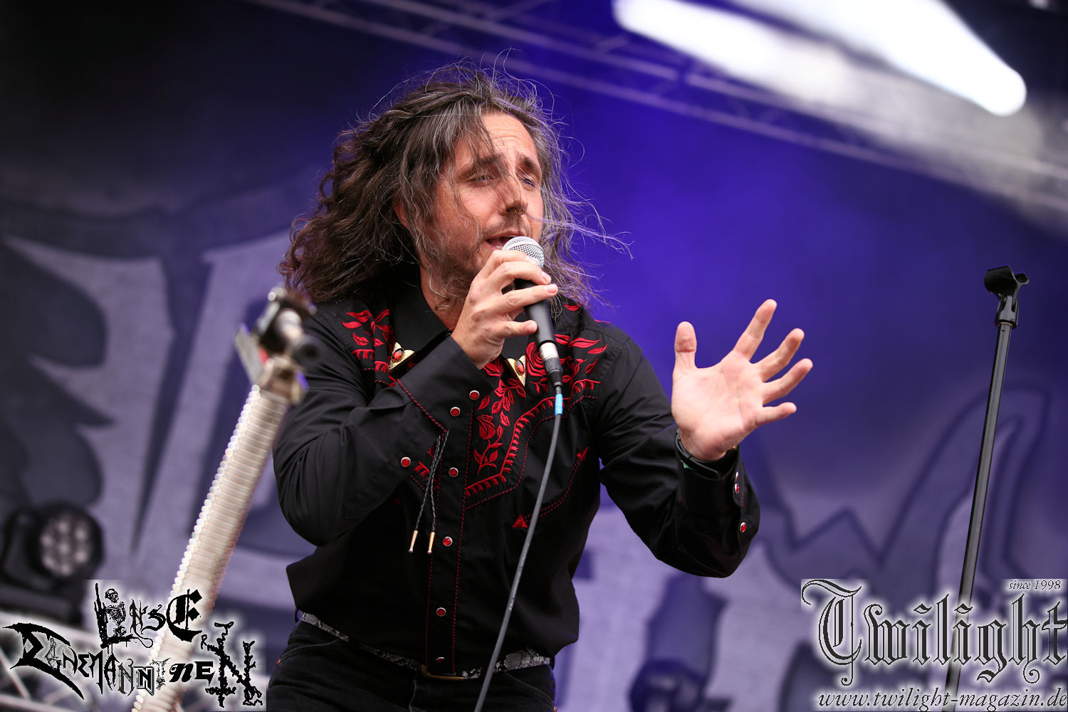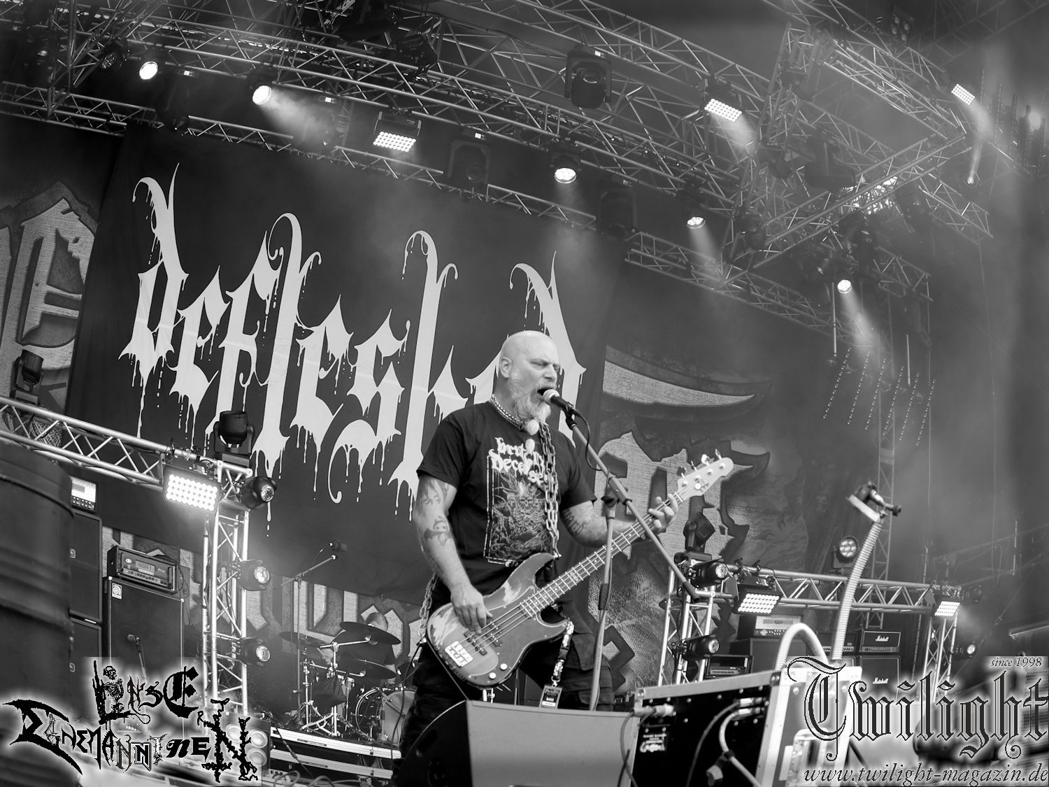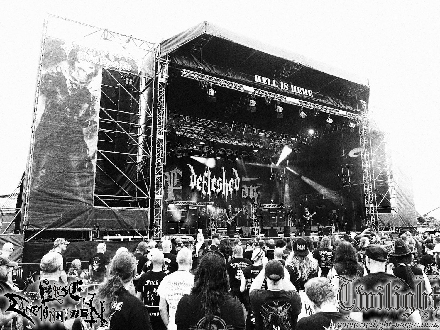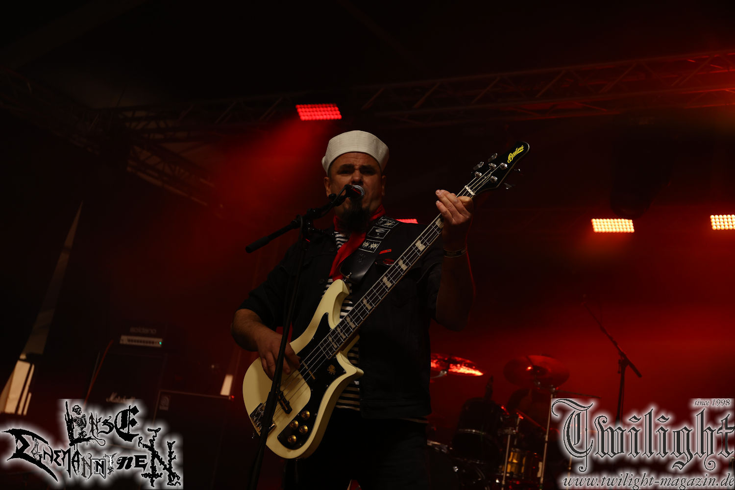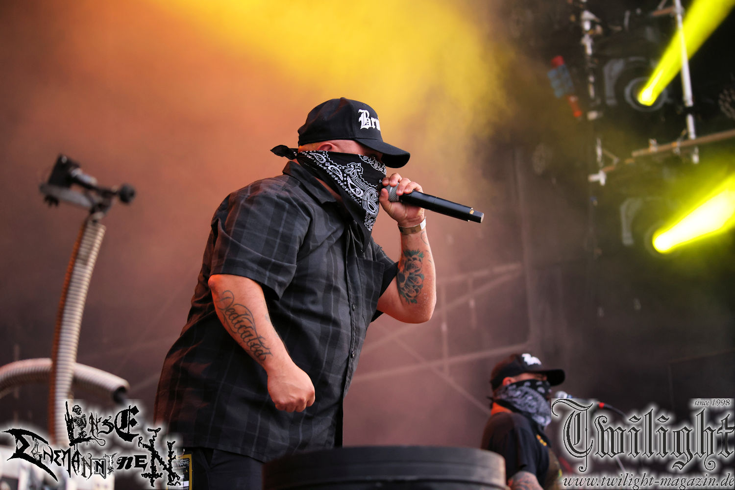 Nachdem ich mich schon die ganze Zeit tierisch darauf gefreut habe, ist es jetzt nun endlich soweit, denn die umwerfenden Night In Gales werden gleich im Zelt loslegen. Ich finde diese Melodic Death Metal - Institution ja wirklich einfach nur genial und ihr Sound ist für mich wunderbar, weshalb ich mich auch erneut mit frischem Bier in der ersten Reihe positioniert habe. Da muss ich einfach ganz vorne mit dabei sein und ich bin echt gespannt, welche Songs sie aus ihrem reichen Fundus wohl spielen werden, immerhin stehen ihnen nur 30 Minuten zur Verfügung. Mein Plan nicht ganz so betrunken zu sein, wie bei ihrem Gig zum 30. Geburtstag von Final Cry in Hannover, ist nicht so ganz aufgegangen, aber immer noch besser als das In Blackest Velvet, Night In Gales, Dew-Scented-Konzert 2001 in Salzgitter im Forellenhof, denn da kann ich mich nur noch teilweise an Dew-Scented erinnern. Egal, denn es geht endlich los und Christian (Gesang), Tobias (Bass), Adriano (Drums) und die Brüder Frank und Jens (beide Gitarre) betreten zu einem schönen Intro sichtlich motiviert die in blaues Licht und Nebel gehüllte sowie jeweils links und rechts von sehr cool aussehenden Sidedrops eingegrenzte Bühne mit dem grandiosen Bandlogo im Hintergrund und legen los. Und zwar mit „Dawnlight Garden“, dem Titelsongs ihres Albums von 2020. Knaller! Gepackt in einen wirklich sehr geilen und fetten Livesound macht sich schon beim ersten Song die große Stärke dieser Band sofort bemerkbar: Umwerfende, packende und emotional sehr mitreißende Melodien gepaart mit bestem Death Metal. Also die ursprüngliche Melo-Death-Schule, so wie ich sie liebe. Anfang der 2000er hatte sich die Band vom Sound her zwar etwas geöffnet, aber für sich festgestellt, dass nur die alte Lehre für sie Sinn macht (nachzulesen im famosen Mørkeskye – Anm. d. Verf.). Das stellen sie mit dem nun folgenden „The Spears Within“ von 2018 mächtig unter Beweis. Wie bereits erwähnt, hat die Band echt Bock, ist bewegungsfreudig und ordentlich am Bangen und Posen, dass es eine wahre Augenfreude ist. Hier wird nicht nur runtergezockt, sondern der eigene Sound erlebt und ausgelebt. Bei solch einer umwerfenden Musik, kann auch keiner unberührt bleiben und um mich herum sehe ich nur strahlende Gesichter und das Zelt ist auch so richtig gut gefüllt. Klasse, das freut mich für die Jungs wirklich sehr. Weiter geht es mit der Hymne „Into The Evergrey“ vom aktuellen Killeralbum „Shadowreaper“. Der Song ist echt sowas von geil, Leute. Als ich das erste Mal das Video sah und hörte, fühlte ich mich sofort in die 90er zurück versetzt, als ich als Teenager vor meiner Anlage saß und mich ergriffen dem Göteborg-Sound hingab. Das ist jetzt nicht anders und ich komme vor Freude gar nicht mehr aus dem Strahlen heraus. Danke dafür Jungs! Kollege Dunemann ist jetzt auch wieder mit dem Fotografieren fertig, hat sich zu mir nach vorne gesellt und mein Vornamensvetter ist ebenfalls anwesend und so feiern wir die Band jetzt gemeinsam ab. „Transition To Doom“ ist dafür auch wie gemacht. Im Rausch der Freude fordern Dunemann und ich den Klassiker „Razor“ und wir haben tatsächlich Glück und nicht nur wir sind entzückt, dass der Song jetzt kommt. Die Stimmung im Zelt kocht und das nicht nur wegen der Hitze. Und dem nicht genug, denn der nächste Klassiker wird uns um unsere Ohren gezimmert, nämlich „Autumn Water“ von „Towards The Twilight“. Wie schön und wenn Night In Gales schon in der alten Schatzkiste kramen, servieren sie uns dann auch noch „Sylphlike“! Ganz grooooßes Kino! Was für ein herrlich intensives und mitreißendes Konzert. Aber auch dieses geht leider irgendwann zu Ende und wird mit einem Klassiker beendet. Aber kein eigener, denn es gibt Iron Maiden ,mit ihrem gleichnamigen Song auf die Ohren und so gehen alle nochmal ordentlich ab und verlassen mehr als zufrieden das Zelt. Danke für dieses tolle Konzert Night In Gales! Ich bin zutiefst zufrieden. Und falls Night In Gales bei euch bisher unter dem Radar liefen und ihr Fans von mitreißenden feurigen, intensiven und von Herzblut angetriebenen Melodic Death Metal der alten Schule seid, ist diese Band für euch Pflicht!