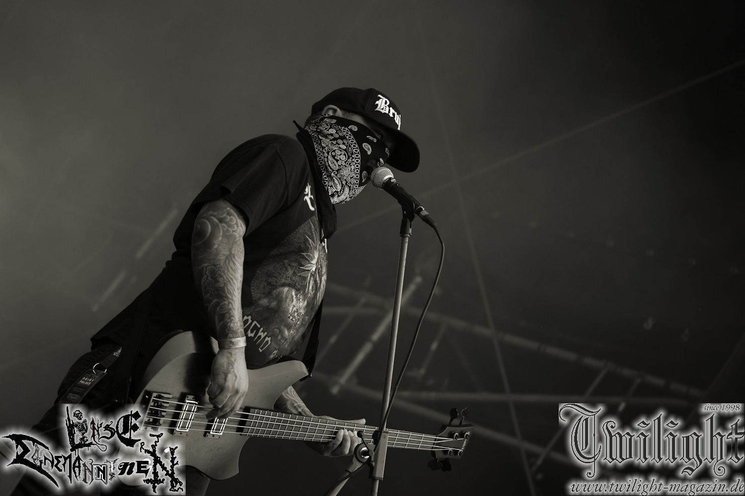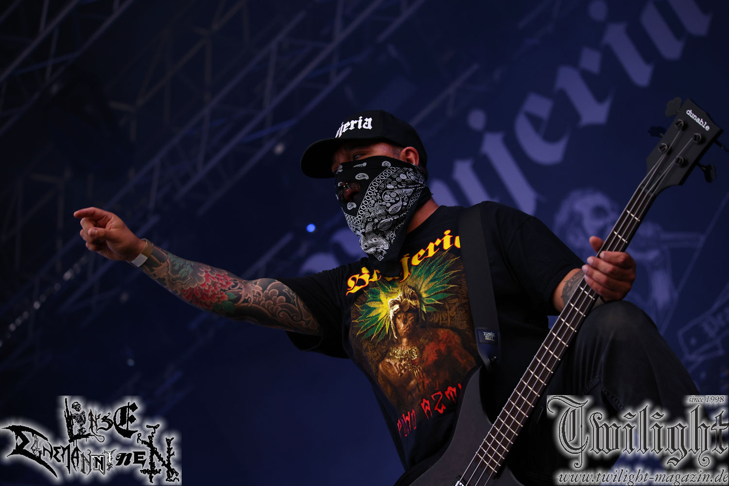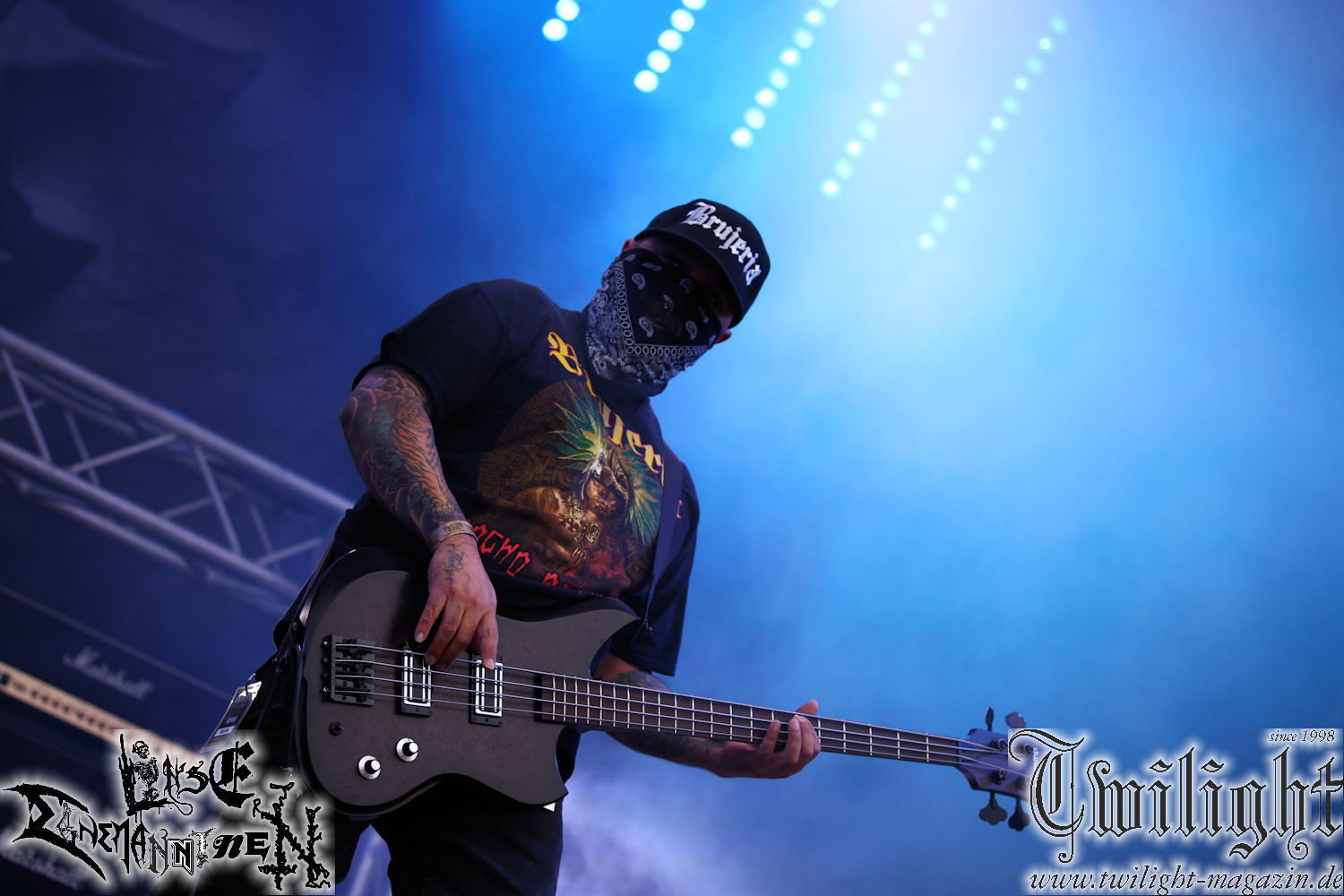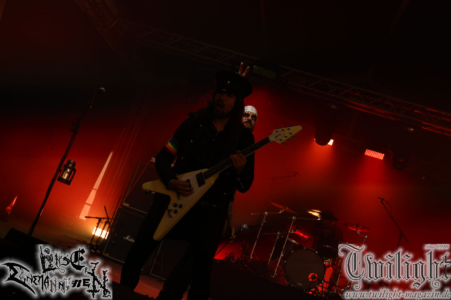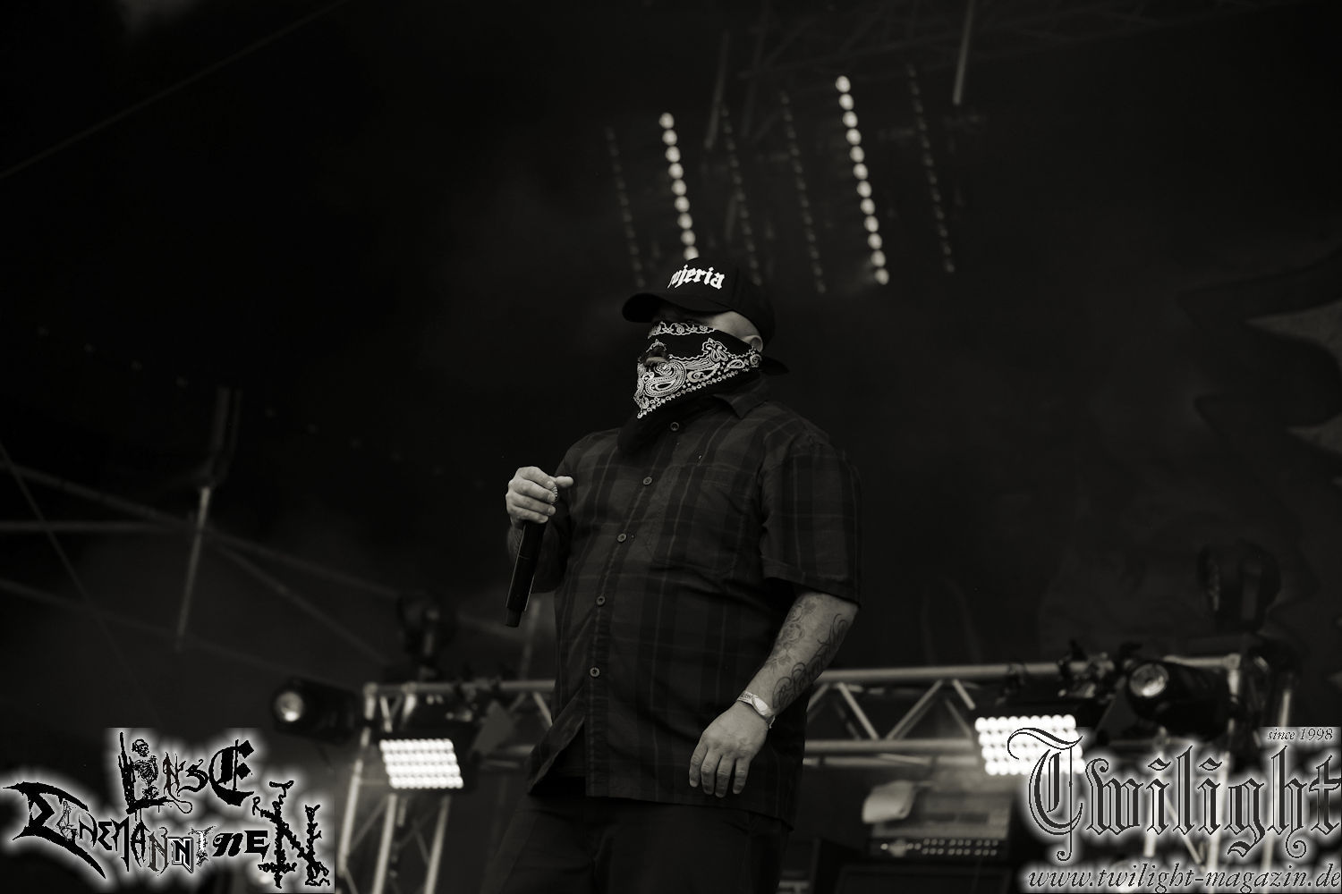 Nachdem ich mich schon die ganze Zeit tierisch darauf gefreut habe, ist es jetzt nun endlich soweit, denn die umwerfenden Night In Gales werden gleich im Zelt loslegen. Ich finde diese Melodic Death Metal - Institution ja wirklich einfach nur genial und ihr Sound ist für mich wunderbar, weshalb ich mich auch erneut mit frischem Bier in der ersten Reihe positioniert habe. Da muss ich einfach ganz vorne mit dabei sein und ich bin echt gespannt, welche Songs sie aus ihrem reichen Fundus wohl spielen werden, immerhin stehen ihnen nur 30 Minuten zur Verfügung. Mein Plan nicht ganz so betrunken zu sein, wie bei ihrem Gig zum 30. Geburtstag von Final Cry in Hannover, ist nicht so ganz aufgegangen, aber immer noch besser als das In Blackest Velvet, Night In Gales, Dew-Scented-Konzert 2001 in Salzgitter im Forellenhof, denn da kann ich mich nur noch teilweise an Dew-Scented erinnern. Egal, denn es geht endlich los und Christian (Gesang), Tobias (Bass), Adriano (Drums) und die Brüder Frank und Jens (beide Gitarre) betreten zu einem schönen Intro sichtlich motiviert die in blaues Licht und Nebel gehüllte sowie jeweils links und rechts von sehr cool aussehenden Sidedrops eingegrenzte Bühne mit dem grandiosen Bandlogo im Hintergrund und legen los. Und zwar mit „Dawnlight Garden“, dem Titelsongs ihres Albums von 2020. Knaller! Gepackt in einen wirklich sehr geilen und fetten Livesound macht sich schon beim ersten Song die große Stärke dieser Band sofort bemerkbar: Umwerfende, packende und emotional sehr mitreißende Melodien gepaart mit bestem Death Metal. Also die ursprüngliche Melo-Death-Schule, so wie ich sie liebe. Anfang der 2000er hatte sich die Band vom Sound her zwar etwas geöffnet, aber für sich festgestellt, dass nur die alte Lehre für sie Sinn macht (nachzulesen im famosen Mørkeskye – Anm. d. Verf.). Das stellen sie mit dem nun folgenden „The Spears Within“ von 2018 mächtig unter Beweis. Wie bereits erwähnt, hat die Band echt Bock, ist bewegungsfreudig und ordentlich am Bangen und Posen, dass es eine wahre Augenfreude ist. Hier wird nicht nur runtergezockt, sondern der eigene Sound erlebt und ausgelebt. Bei solch einer umwerfenden Musik, kann auch keiner unberührt bleiben und um mich herum sehe ich nur strahlende Gesichter und das Zelt ist auch so richtig gut gefüllt. Klasse, das freut mich für die Jungs wirklich sehr. Weiter geht es mit der Hymne „Into The Evergrey“ vom aktuellen Killeralbum „Shadowreaper“. Der Song ist echt sowas von geil, Leute. Als ich das erste Mal das Video sah und hörte, fühlte ich mich sofort in die 90er zurück versetzt, als ich als Teenager vor meiner Anlage saß und mich ergriffen dem Göteborg-Sound hingab. Das ist jetzt nicht anders und ich komme vor Freude gar nicht mehr aus dem Strahlen heraus. Danke dafür Jungs! Kollege Dunemann ist jetzt auch wieder mit dem Fotografieren fertig, hat sich zu mir nach vorne gesellt und mein Vornamensvetter ist ebenfalls anwesend und so feiern wir die Band jetzt gemeinsam ab. „Transition To Doom“ ist dafür auch wie gemacht. Im Rausch der Freude fordern Dunemann und ich den Klassiker „Razor“ und wir haben tatsächlich Glück und nicht nur wir sind entzückt, dass der Song jetzt kommt. Die Stimmung im Zelt kocht und das nicht nur wegen der Hitze. Und dem nicht genug, denn der nächste Klassiker wird uns um unsere Ohren gezimmert, nämlich „Autumn Water“ von „Towards The Twilight“. Wie schön und wenn Night In Gales schon in der alten Schatzkiste kramen, servieren sie uns dann auch noch „Sylphlike“! Ganz grooooßes Kino! Was für ein herrlich intensives und mitreißendes Konzert. Aber auch dieses geht leider irgendwann zu Ende und wird mit einem Klassiker beendet. Aber kein eigener, denn es gibt Iron Maiden ,mit ihrem gleichnamigen Song auf die Ohren und so gehen alle nochmal ordentlich ab und verlassen mehr als zufrieden das Zelt. Danke für dieses tolle Konzert Night In Gales! Ich bin zutiefst zufrieden. Und falls Night In Gales bei euch bisher unter dem Radar liefen und ihr Fans von mitreißenden feurigen, intensiven und von Herzblut angetriebenen Melodic Death Metal der alten Schule seid, ist diese Band für euch Pflicht!
