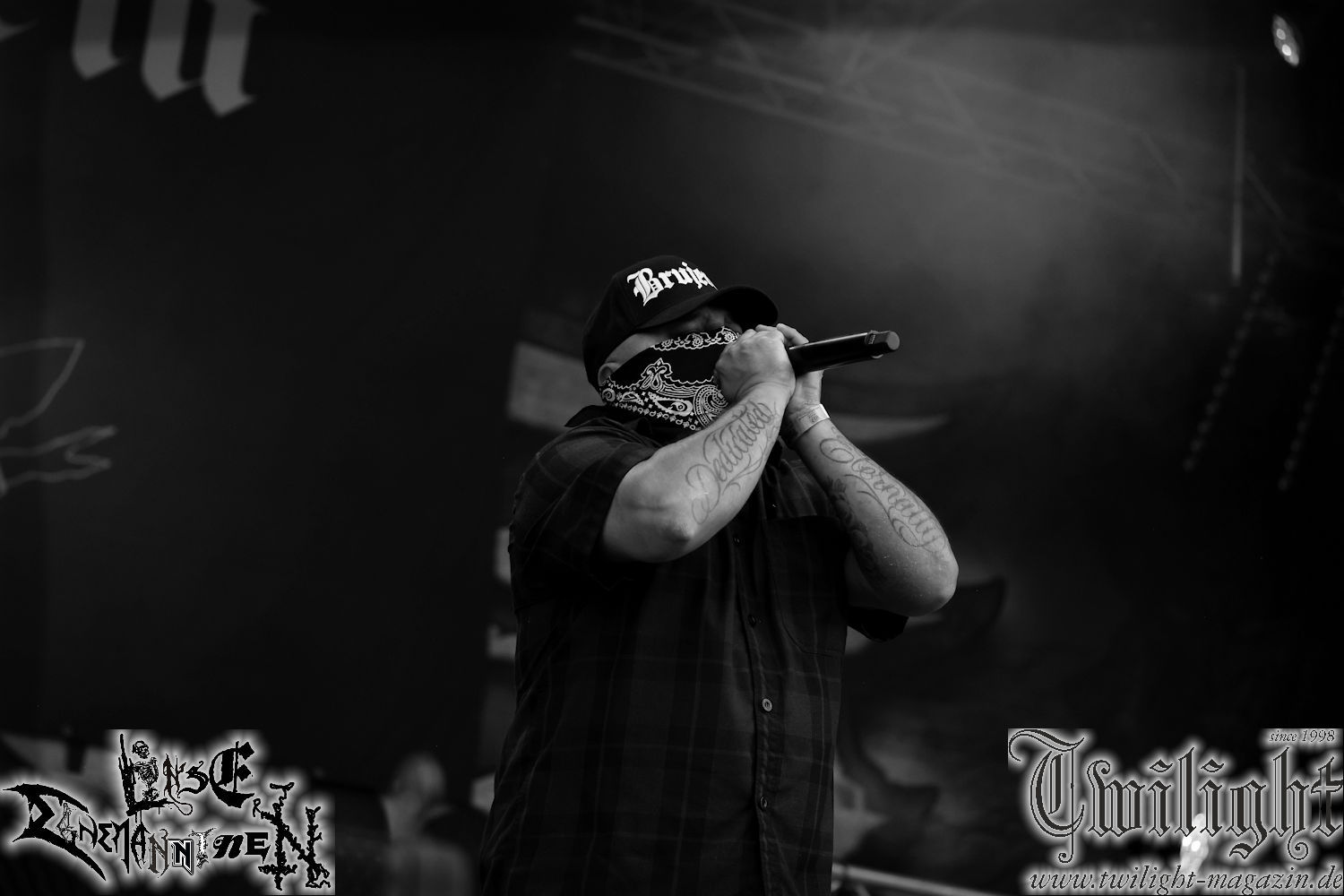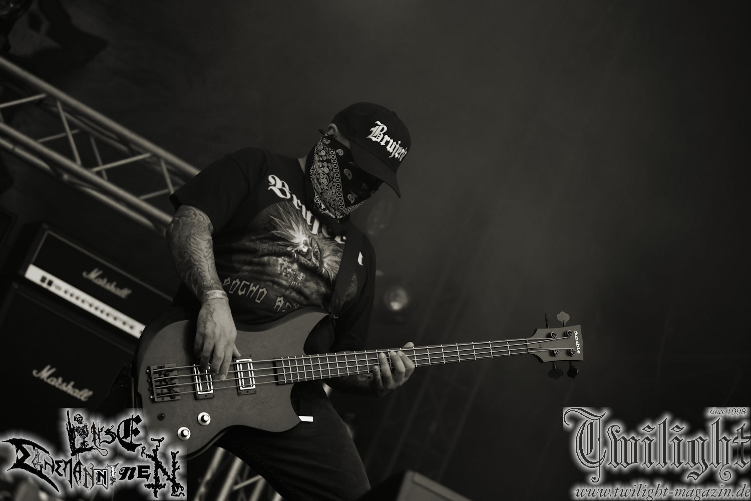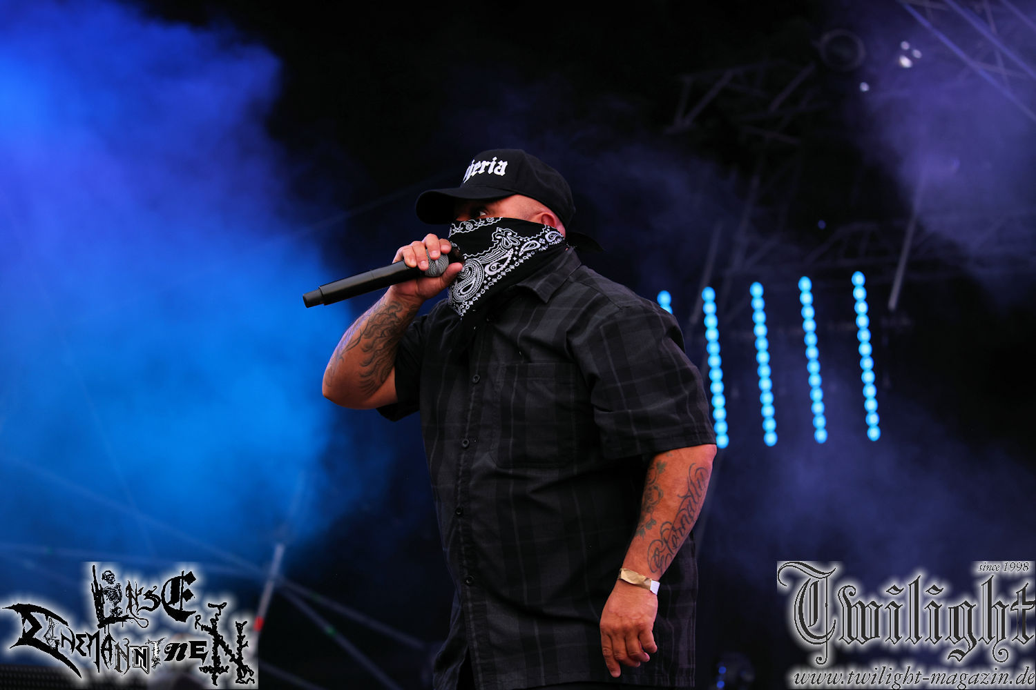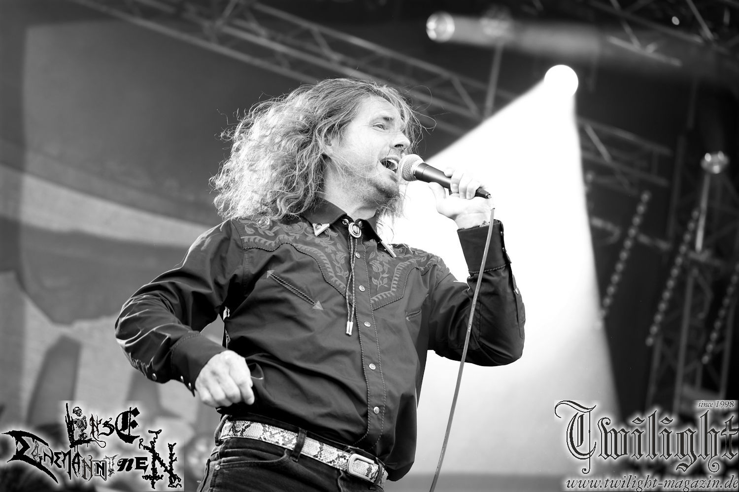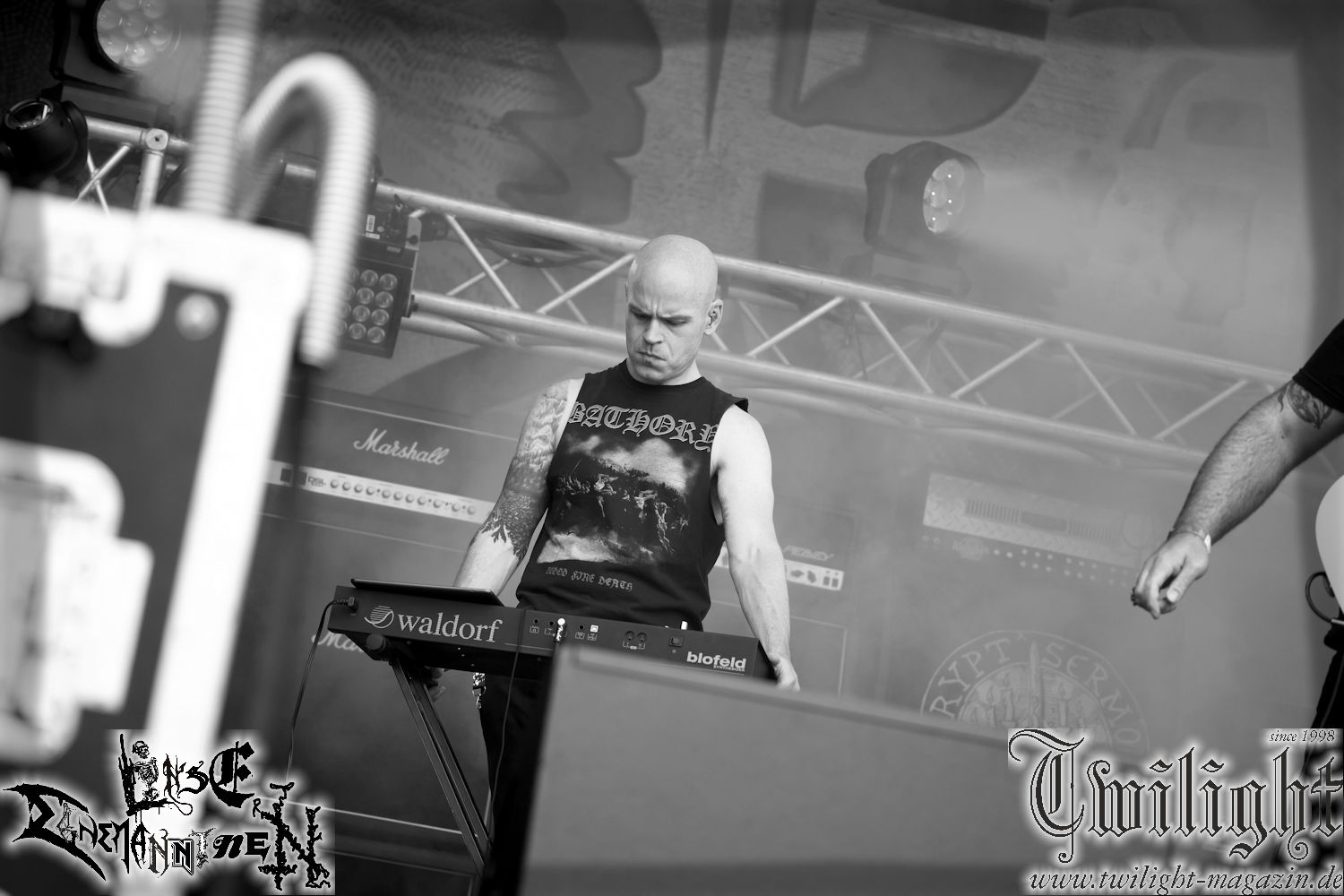 Nachdem ich mich schon die ganze Zeit tierisch darauf gefreut habe, ist es jetzt nun endlich soweit, denn die umwerfenden Night In Gales werden gleich im Zelt loslegen. Ich finde diese Melodic Death Metal - Institution ja wirklich einfach nur genial und ihr Sound ist für mich wunderbar, weshalb ich mich auch erneut mit frischem Bier in der ersten Reihe positioniert habe. Da muss ich einfach ganz vorne mit dabei sein und ich bin echt gespannt, welche Songs sie aus ihrem reichen Fundus wohl spielen werden, immerhin stehen ihnen nur 30 Minuten zur Verfügung. Mein Plan nicht ganz so betrunken zu sein, wie bei ihrem Gig zum 30. Geburtstag von Final Cry in Hannover, ist nicht so ganz aufgegangen, aber immer noch besser als das In Blackest Velvet, Night In Gales, Dew-Scented-Konzert 2001 in Salzgitter im Forellenhof, denn da kann ich mich nur noch teilweise an Dew-Scented erinnern. Egal, denn es geht endlich los und Christian (Gesang), Tobias (Bass), Adriano (Drums) und die Brüder Frank und Jens (beide Gitarre) betreten zu einem schönen Intro sichtlich motiviert die in blaues Licht und Nebel gehüllte sowie jeweils links und rechts von sehr cool aussehenden Sidedrops eingegrenzte Bühne mit dem grandiosen Bandlogo im Hintergrund und legen los. Und zwar mit „Dawnlight Garden“, dem Titelsongs ihres Albums von 2020. Knaller! Gepackt in einen wirklich sehr geilen und fetten Livesound macht sich schon beim ersten Song die große Stärke dieser Band sofort bemerkbar: Umwerfende, packende und emotional sehr mitreißende Melodien gepaart mit bestem Death Metal. Also die ursprüngliche Melo-Death-Schule, so wie ich sie liebe. Anfang der 2000er hatte sich die Band vom Sound her zwar etwas geöffnet, aber für sich festgestellt, dass nur die alte Lehre für sie Sinn macht (nachzulesen im famosen Mørkeskye – Anm. d. Verf.). Das stellen sie mit dem nun folgenden „The Spears Within“ von 2018 mächtig unter Beweis. Wie bereits erwähnt, hat die Band echt Bock, ist bewegungsfreudig und ordentlich am Bangen und Posen, dass es eine wahre Augenfreude ist. Hier wird nicht nur runtergezockt, sondern der eigene Sound erlebt und ausgelebt. Bei solch einer umwerfenden Musik, kann auch keiner unberührt bleiben und um mich herum sehe ich nur strahlende Gesichter und das Zelt ist auch so richtig gut gefüllt. Klasse, das freut mich für die Jungs wirklich sehr. Weiter geht es mit der Hymne „Into The Evergrey“ vom aktuellen Killeralbum „Shadowreaper“. Der Song ist echt sowas von geil, Leute. Als ich das erste Mal das Video sah und hörte, fühlte ich mich sofort in die 90er zurück versetzt, als ich als Teenager vor meiner Anlage saß und mich ergriffen dem Göteborg-Sound hingab. Das ist jetzt nicht anders und ich komme vor Freude gar nicht mehr aus dem Strahlen heraus. Danke dafür Jungs! Kollege Dunemann ist jetzt auch wieder mit dem Fotografieren fertig, hat sich zu mir nach vorne gesellt und mein Vornamensvetter ist ebenfalls anwesend und so feiern wir die Band jetzt gemeinsam ab. „Transition To Doom“ ist dafür auch wie gemacht. Im Rausch der Freude fordern Dunemann und ich den Klassiker „Razor“ und wir haben tatsächlich Glück und nicht nur wir sind entzückt, dass der Song jetzt kommt. Die Stimmung im Zelt kocht und das nicht nur wegen der Hitze. Und dem nicht genug, denn der nächste Klassiker wird uns um unsere Ohren gezimmert, nämlich „Autumn Water“ von „Towards The Twilight“. Wie schön und wenn Night In Gales schon in der alten Schatzkiste kramen, servieren sie uns dann auch noch „Sylphlike“! Ganz grooooßes Kino! Was für ein herrlich intensives und mitreißendes Konzert. Aber auch dieses geht leider irgendwann zu Ende und wird mit einem Klassiker beendet. Aber kein eigener, denn es gibt Iron Maiden ,mit ihrem gleichnamigen Song auf die Ohren und so gehen alle nochmal ordentlich ab und verlassen mehr als zufrieden das Zelt. Danke für dieses tolle Konzert Night In Gales! Ich bin zutiefst zufrieden. Und falls Night In Gales bei euch bisher unter dem Radar liefen und ihr Fans von mitreißenden feurigen, intensiven und von Herzblut angetriebenen Melodic Death Metal der alten Schule seid, ist diese Band für euch Pflicht!