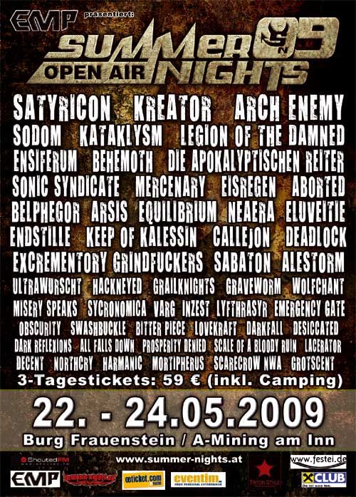 Zusammengefasst war es ein geiles, wenn auch anstrengendes Festival, und das mit einem Billing, wie man es selten auf so engem Raum zu sehen bekommt. Auch das Wetter gab alles her, von brennender Sonne bis zum derben Gewitter, was zu wilden Flüchen und lautem Jubel führte. Die Festivalorga hatte sich wirklich angestrengt, möglichst viele Bands, darunter viele große Namen der Szene, zu zeigen, ohne dabei Überschneidungen in Kauf zu nehmen. So hatte man die Gelegenheit, alles zu sehen, was einem gefiel, vorausgesetzt, dass einem nicht vorher die Kräfte ausgingen. Auch die Metalfans haben eine gute Stimmung verbreitet und haben sich größtenteils am Riemen gerissen. Ein paar Arschlöcher waren dennoch offenbar dabei: Sonst wären unser Klopapier, eine Tasche mit Futter und drei unserer Campingstühle (!) nicht einfach so verschwunden. Viele Negativpunkte gab dennoch nicht; allein an der Tontechnik, an den Parkgelegenheiten, der Größe des Zeltplatzes und der Länge des Weges zu den Stages muss noch gefeilt werden. Wenn die Veranstalter sich nächstes Jahr allerdings wieder so ins Zeug legen, dann wird das Summer Nights 2010 der absolute Hammer, auf den ich mich jetzt schon freue.