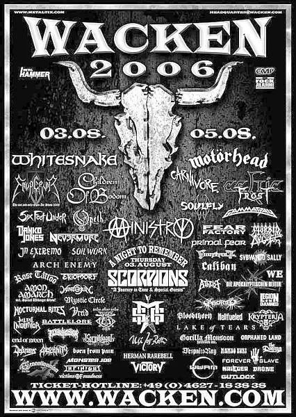 Aborted, Amon Amarth, Atheist, Battlelore, Bloodthorn, Born From Pain, Celtic Frost, Children Of Bodom, D'espairs Ray, Die Apokalyptischen Reiter, Ektomorf, Emperor, End of Green, Finntroll, Gamma Ray, In Extremo, Korpiklaani, Legion of the Damned, Metal Inquisitor, Ministry, Motörhead, MSG, Nevermore, Opeth, Orphaned Land, Primal Fear, Scorpions, Six Feet Under, Soilwork, Subway To Sally, The Dogma, Uli Jon Roth, Victory, Wacken Firefighters, WE, Wintersun