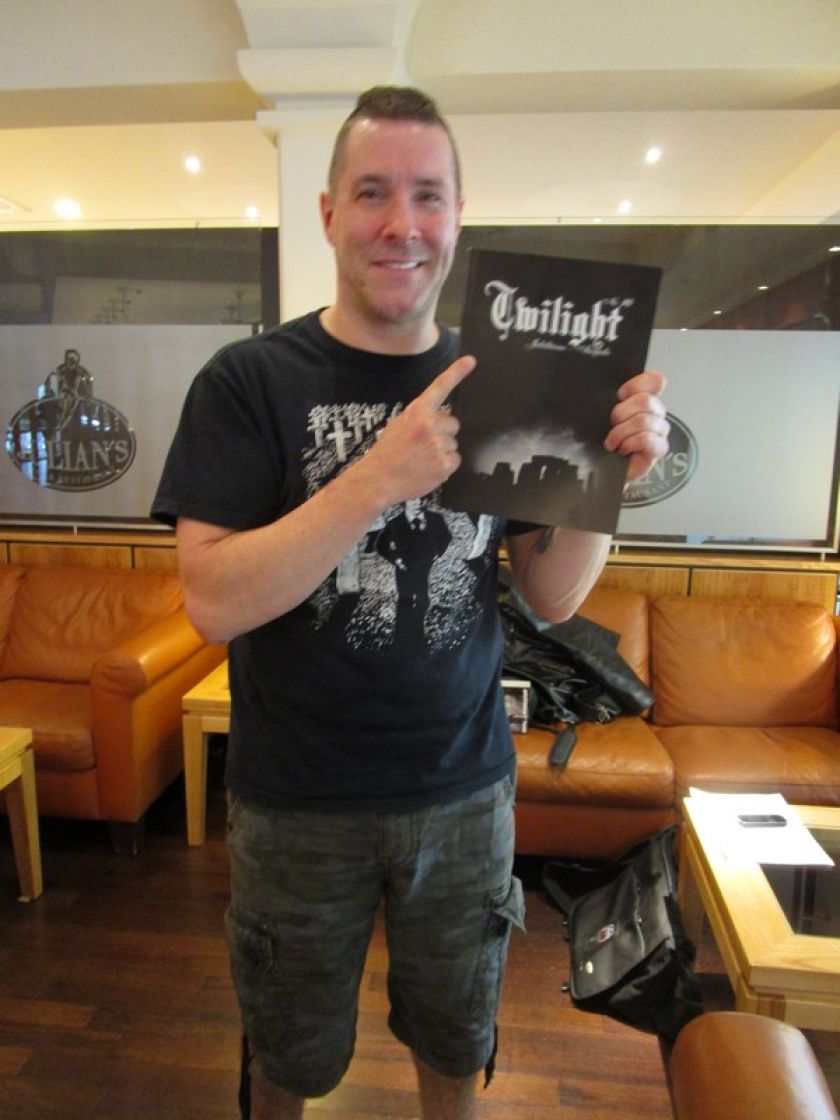 An einem regnerischen Montag im Juni machte ich mich also auf den Weg, um nach vielen Jahren mal wieder Angesicht zu Angesicht mit ANNIHILATOR Chef Jeff Waters zu quatschen. Positiver Nebeneffekt: Vor dem Hotel traf ich zunächst auf Jay Lansford (einstmals GIGANTOR Bassist) und konnte mit ihm ausführlich quatschen. Doch schließlich schlug die Turmuhr 15 Uhr und Jeff Waters erschien ausgeruht und redefreudig im Foyer, um einen ganzen Stapel ANNIHILATOR Cover zu signieren!