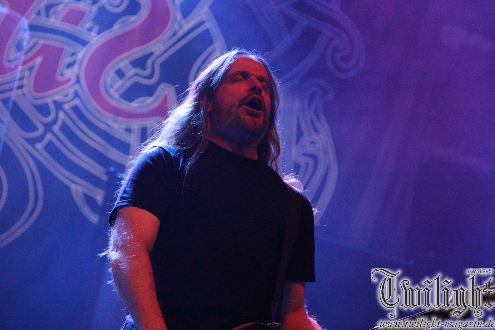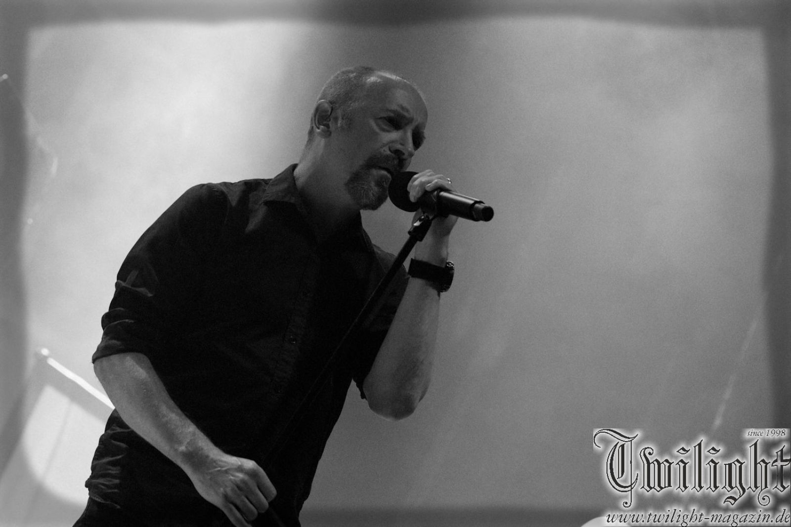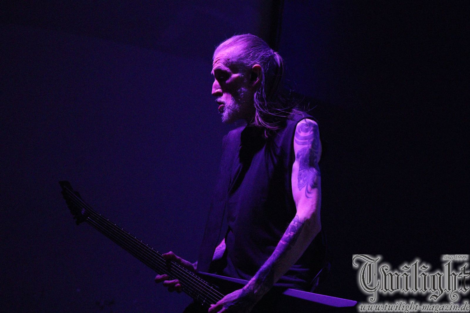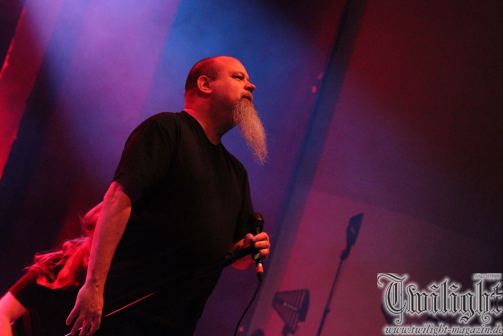 Paradise Lost ist als Live-Band eher eine Wundertüte, mal gut, mal schlecht, mal richtig mies, und Nick Holmes macht es einem da auch nicht unbedingt leichter mit seinen manchmal schon fast komplett ausbleibenden Ansagen. Heute hat er einen guten Tag und ist redselig. Sie seien Paradise Lost, aber das sollte sich inzwischen herumgesprochen haben, scherzt er. Ebenfalls verweist er darauf, dass sie ein paar alte Songs spielen würden, weil sie eben auch eine ganze Menge davon hätten. Kein Wunder, schließlich ist "Ascension" das mittlerweile 17. Studioalbum der Band. Also was spielt man, wenn man gerade das aktuelle Album betourt, aber eigentlich genug Hits in der Hinterhand hätte, um ganze Abende zu füllen? Man muss aussieben. Und so bleiben fast schon erwartungsgemäß Lost Paradise und Gothic sowie Symbols of Life, Paradise Lost, The Plague Within und Medusa komplett ungehört. Der Schwerpunkt der Songs liegt natürlich auf Ascension, aber auch der Rest kann sich absolut sehen lassen. Mit "Say just words" wird das offizielle Set beendet, um dann noch einmal mit No Celebration, Ghosts und Silence like the grave zurückzukommen. Die geringste Gegenliebe erhält die Band wohl für Mouth, aber die Band hat eine so breite Fangemeinde über die Jahre gesammelt, dass man es natürlich nicht mit jedem Song auch jedem recht machen kann. Die Soundprobleme von Saturnus sind übrigens inzwischen gelöst, sodass man einen richtig satten Sound genießen kann, und auch die Backtracks vom Gesang sind so dezent eingesetzt, dass man es nur an manchen Stellen tatsächlich direkt merkt. Es hat auf jeden Fall nicht das Playback-Flair vom Ultima Ratio Auftritt.