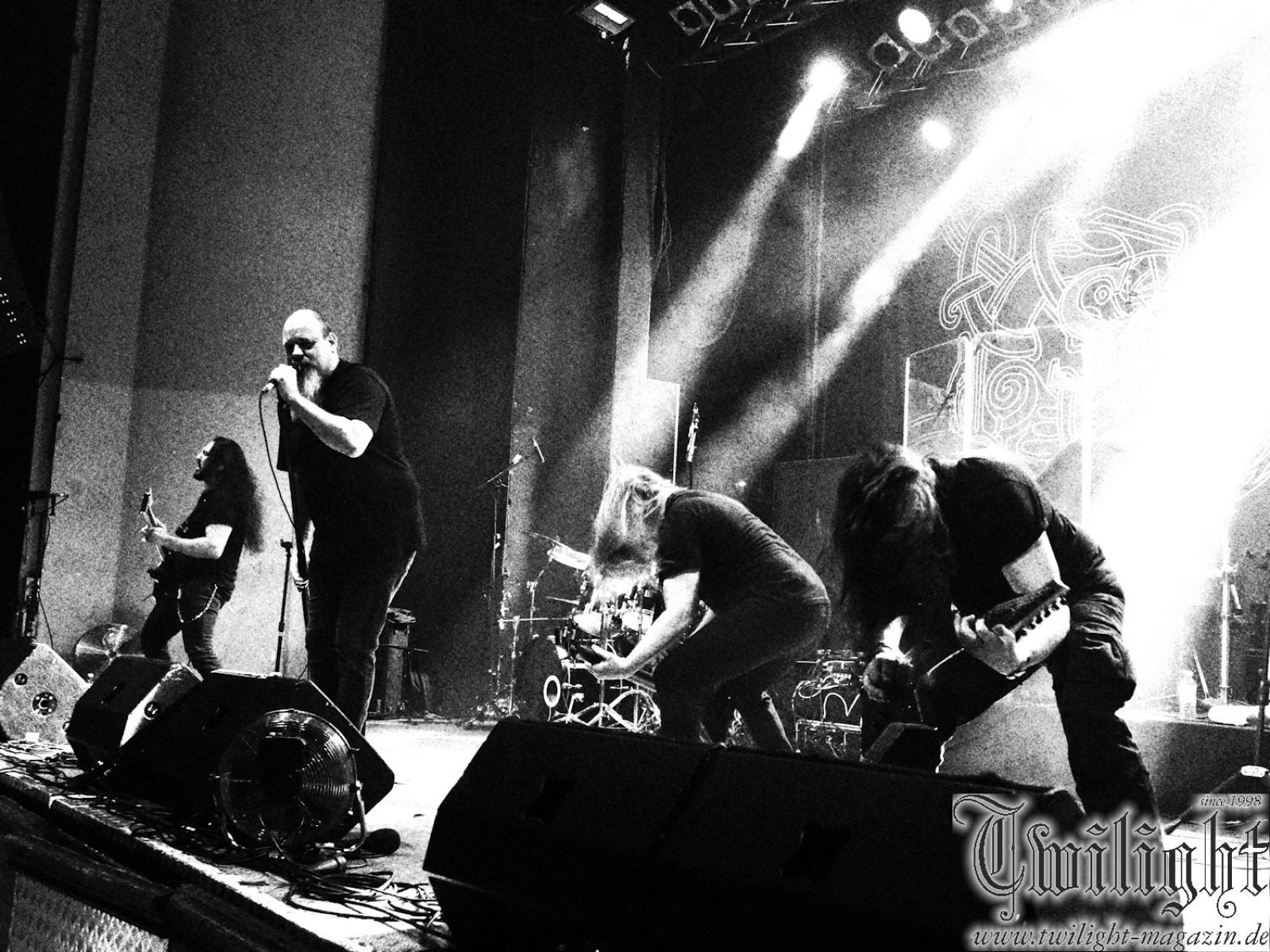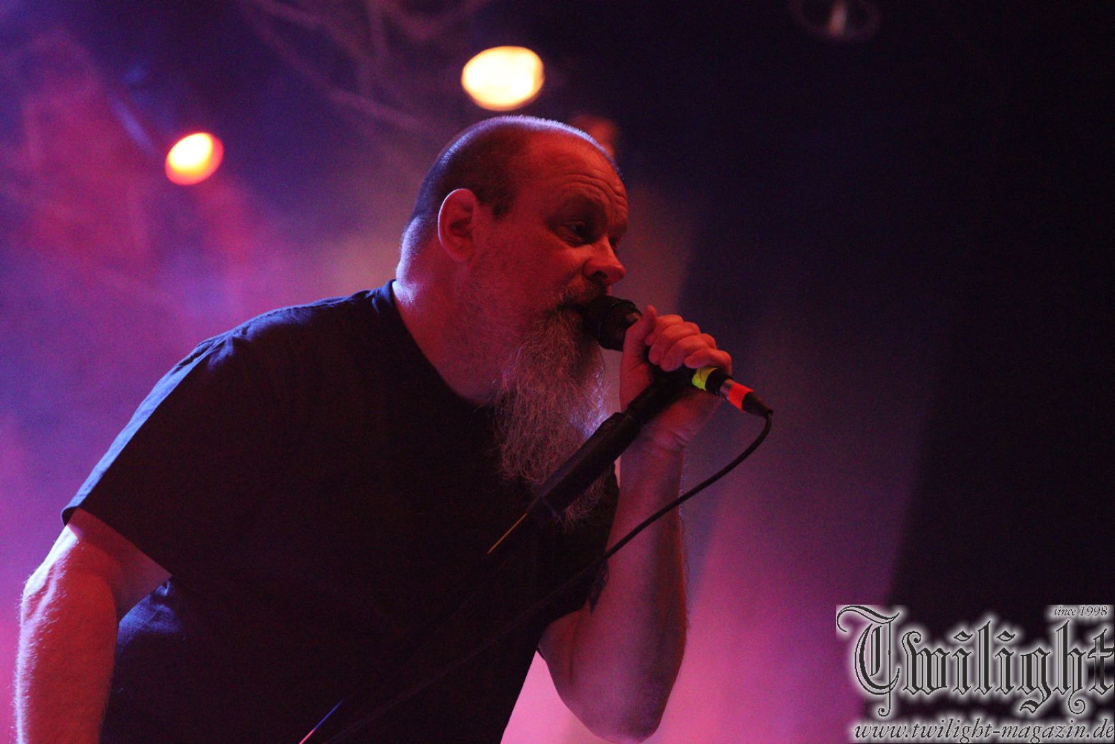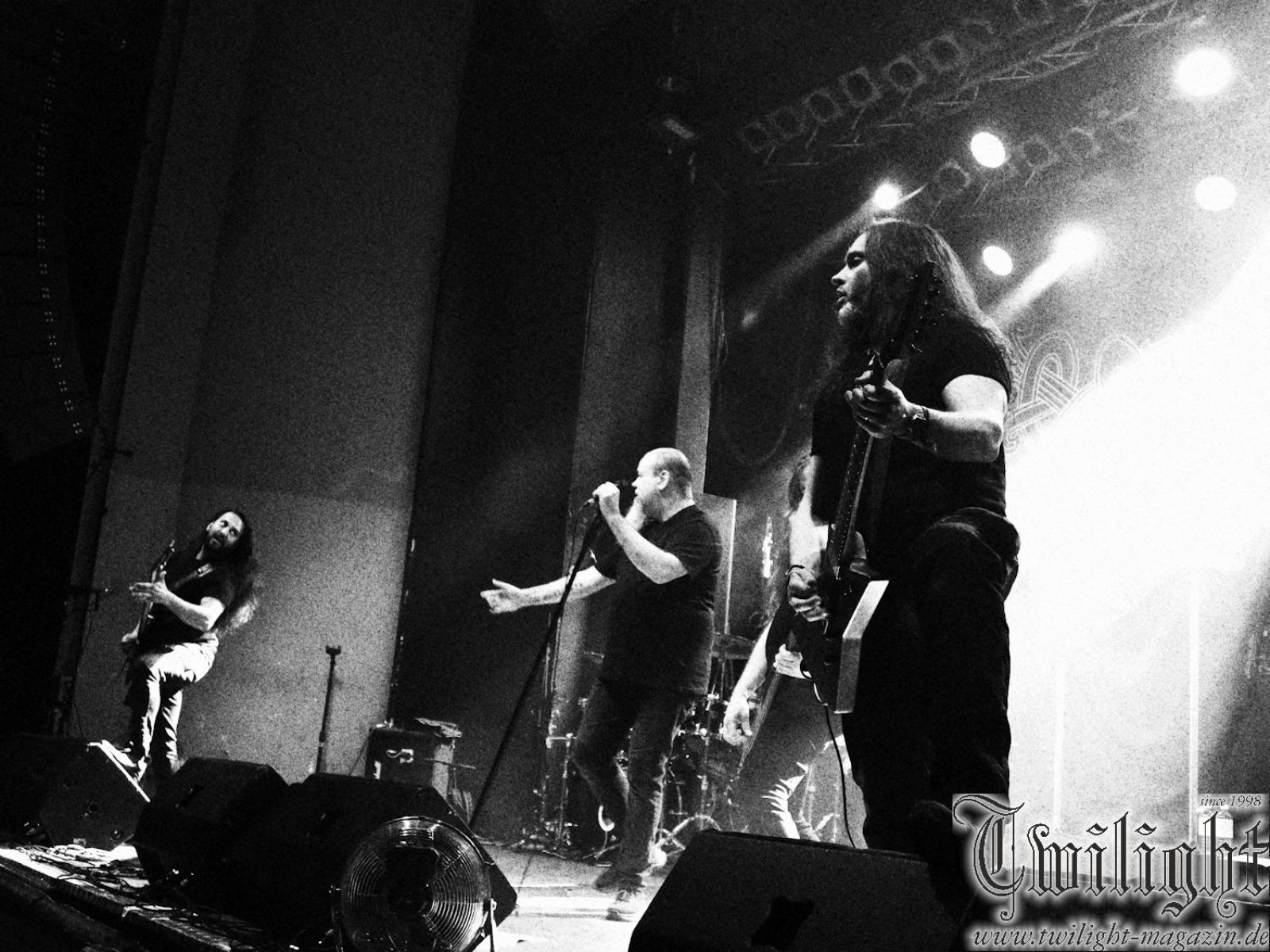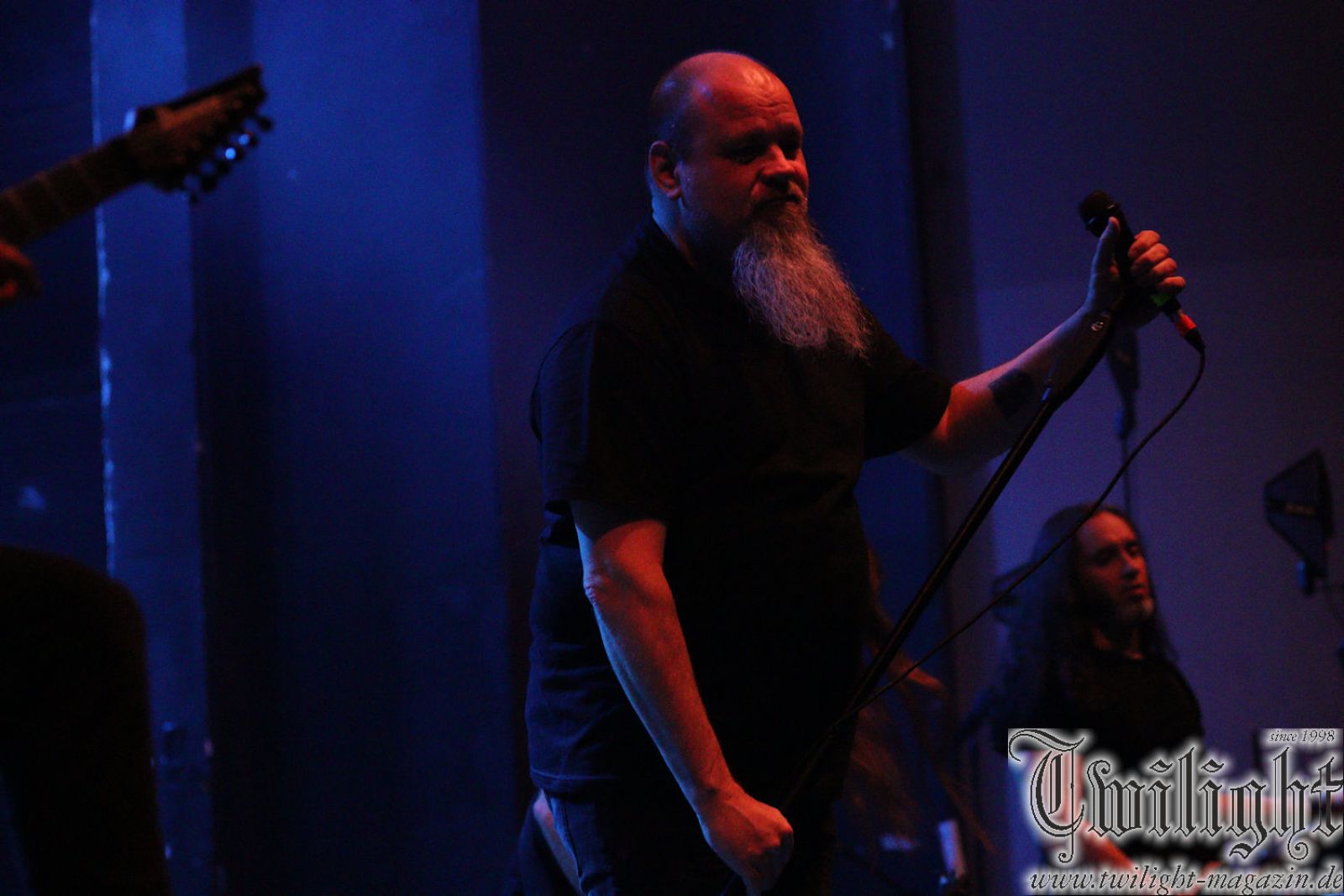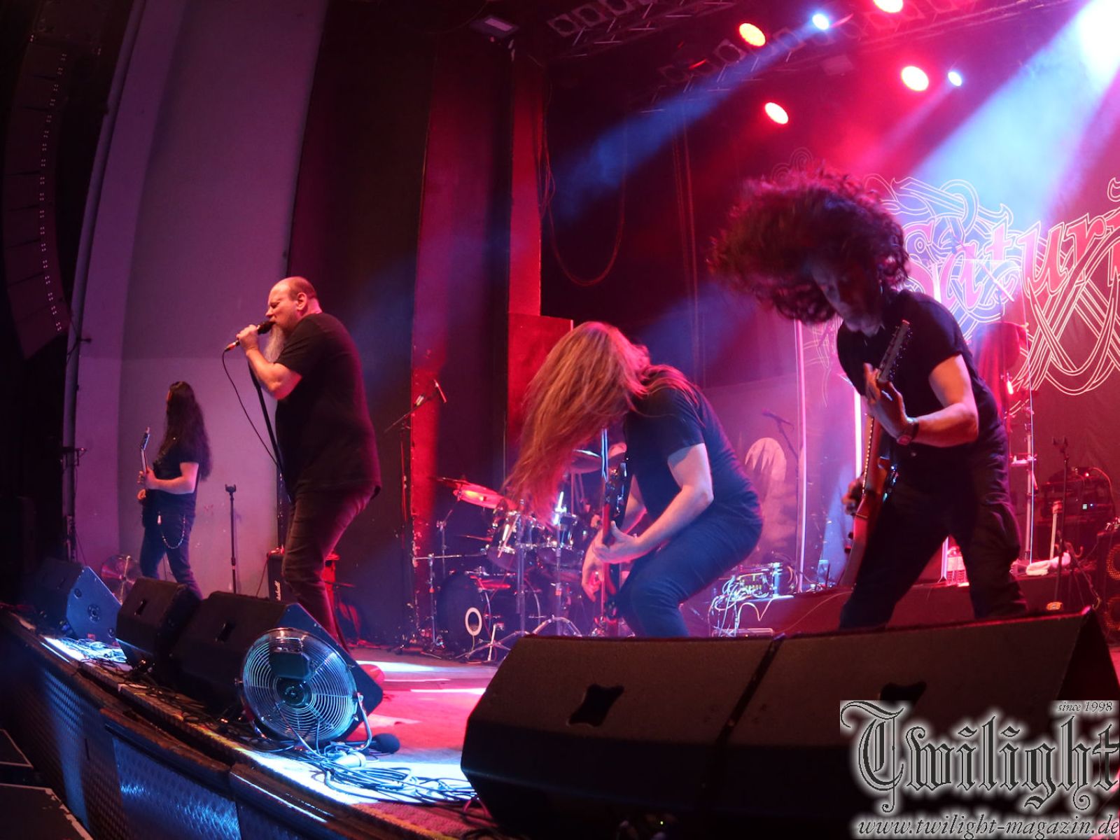Nach kurzer Umbau-Pause stehen Saturnus aus Dänemark auf der Bühne. Schleppender Doom/Death wird geboten, die Gitarren reizen die einzelnen wunderschönen Melodien bis ins letzte Detail aus, und die satten Growls, immer mal wieder unterstützt durch Talk-Passagen, komplettieren das Gesamtbild. Ich fühle mich klanglich zurückversetzt ins Jahr 1995, als Anathema das Album "The silent Enigma" herausgebracht haben. Und auch die PA unterstützt dieses Feeling, denn es knackst und britzelt in den Boxen, dass einem Angs und Bange wird. Der Bühnentechniker stürmt nach dem ersten Song von hinten die Bühne und spricht mit dem Schlagzeuger, aber wirklich besser wird es nicht. Zwischendurch wird die PA komplett heruntergezogen, sodass das Publikum mit dem Bühnensound auskommen muss. Das ist zwar nicht schön, aber Saturnus lassen sich ihre sichtbar gute Laune nicht verderben und präsentieren stattdessen ihre Deutsch-Kenntnisse. Nach nur fünf Songs (die dafür aber alle sehr lang) ist das Set leider auch schon wieder vorbei, die Band verabschiedet sich und lädt zum Meet & Greet am Merchandise ein (und das haben sie auch bis zur letzten Sekunde durchgehalten).