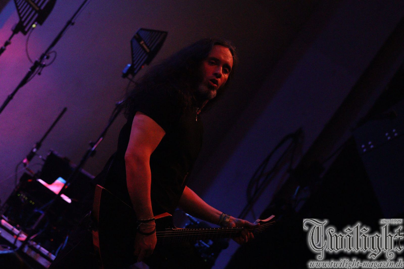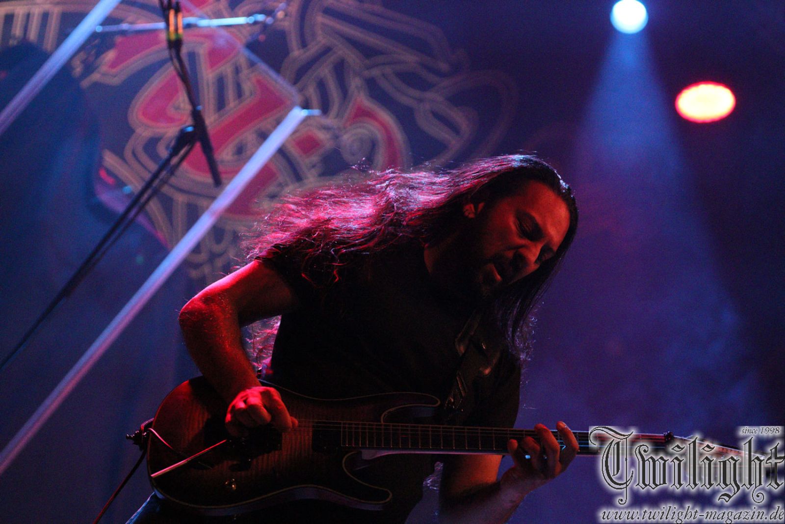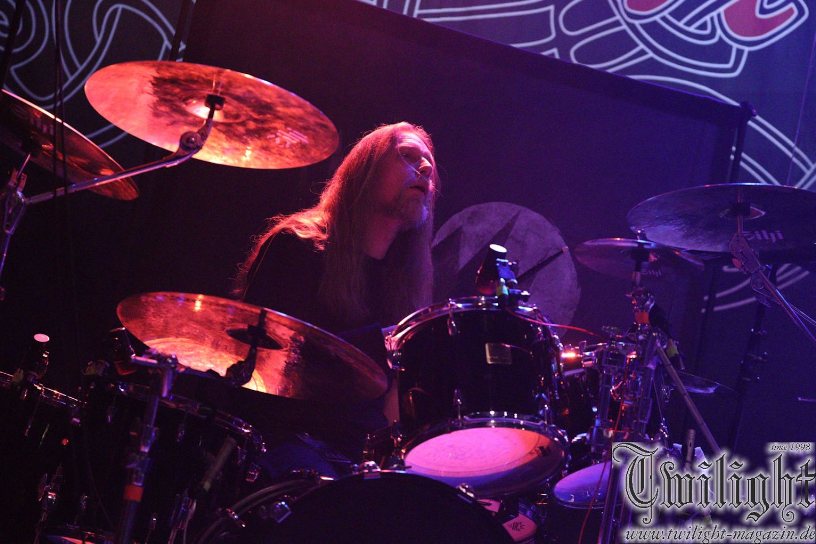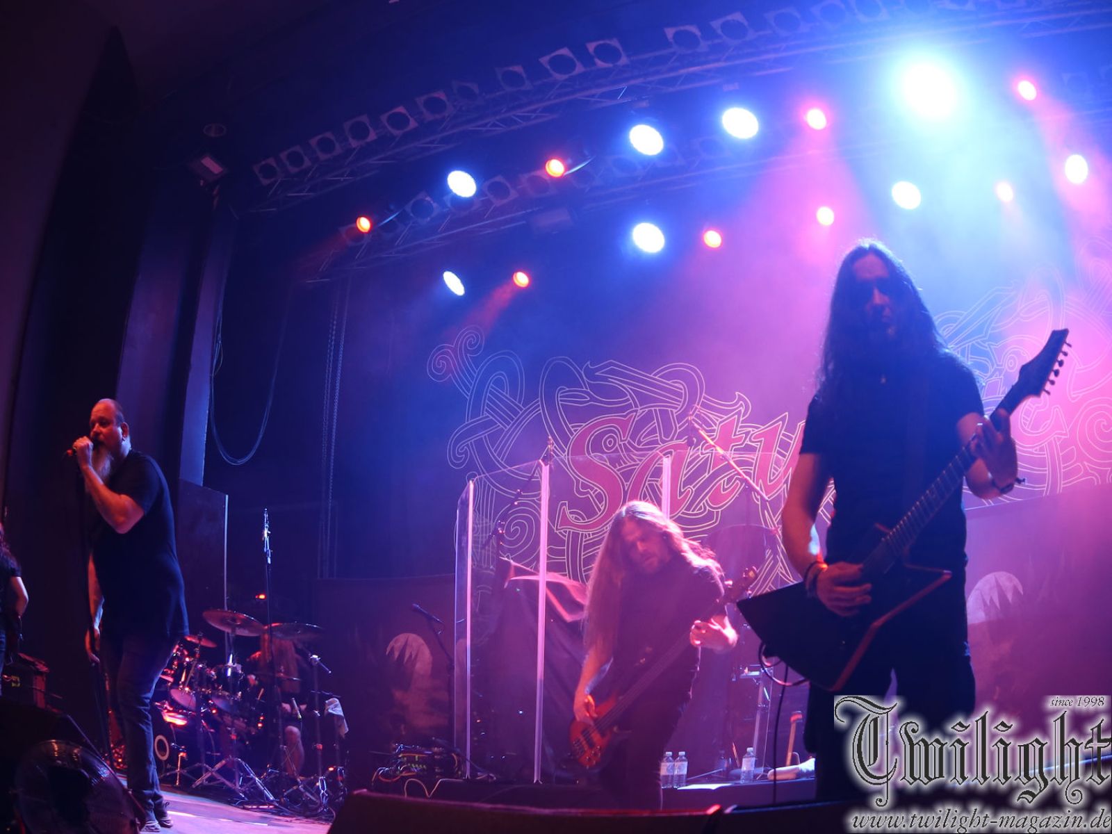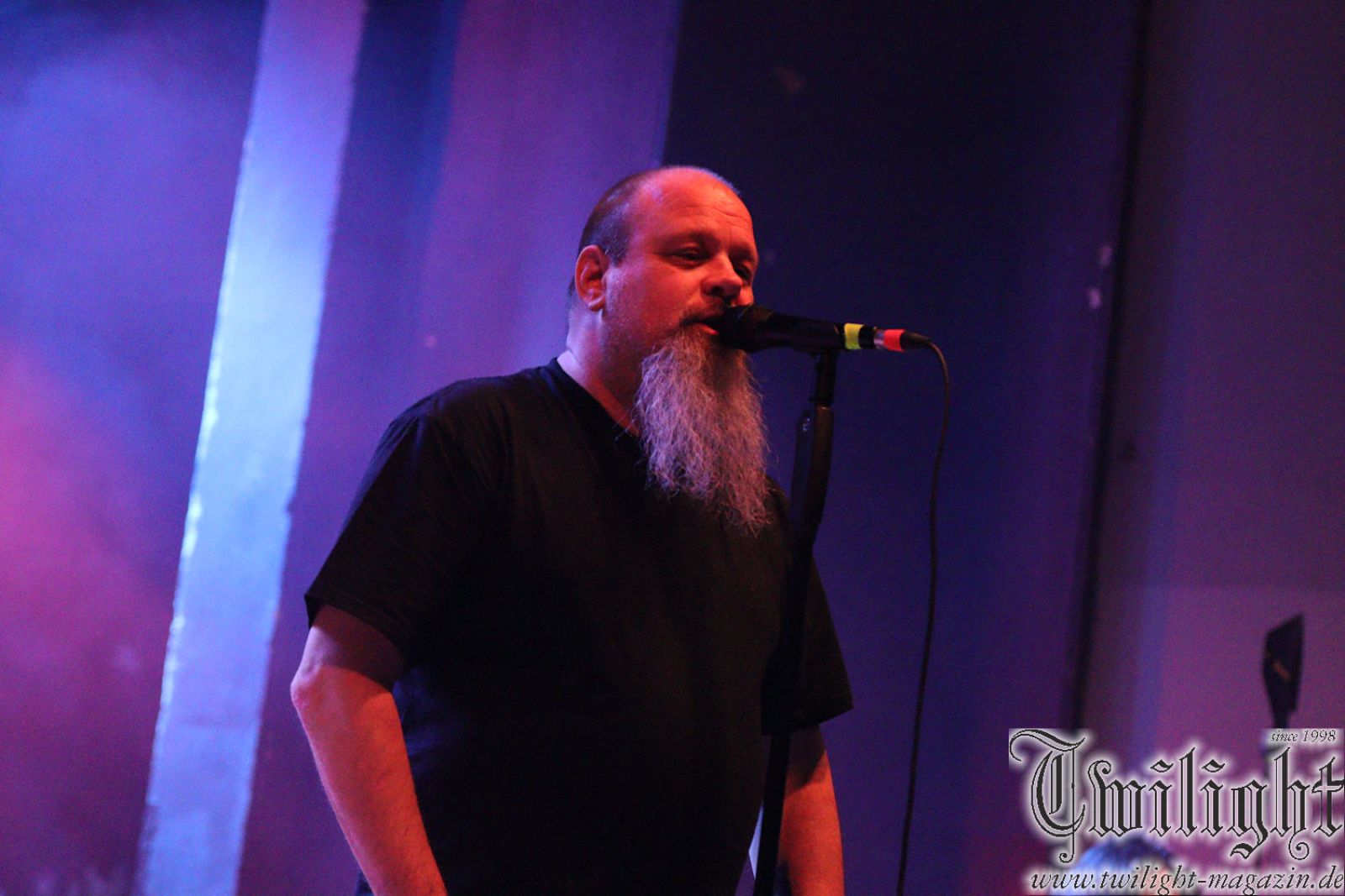 Nach kurzer Umbau-Pause stehen Saturnus aus Dänemark auf der Bühne. Schleppender Doom/Death wird geboten, die Gitarren reizen die einzelnen wunderschönen Melodien bis ins letzte Detail aus, und die satten Growls, immer mal wieder unterstützt durch Talk-Passagen, komplettieren das Gesamtbild. Ich fühle mich klanglich zurückversetzt ins Jahr 1995, als Anathema das Album "The silent Enigma" herausgebracht haben. Und auch die PA unterstützt dieses Feeling, denn es knackst und britzelt in den Boxen, dass einem Angs und Bange wird. Der Bühnentechniker stürmt nach dem ersten Song von hinten die Bühne und spricht mit dem Schlagzeuger, aber wirklich besser wird es nicht. Zwischendurch wird die PA komplett heruntergezogen, sodass das Publikum mit dem Bühnensound auskommen muss. Das ist zwar nicht schön, aber Saturnus lassen sich ihre sichtbar gute Laune nicht verderben und präsentieren stattdessen ihre Deutsch-Kenntnisse. Nach nur fünf Songs (die dafür aber alle sehr lang) ist das Set leider auch schon wieder vorbei, die Band verabschiedet sich und lädt zum Meet & Greet am Merchandise ein (und das haben sie auch bis zur letzten Sekunde durchgehalten).