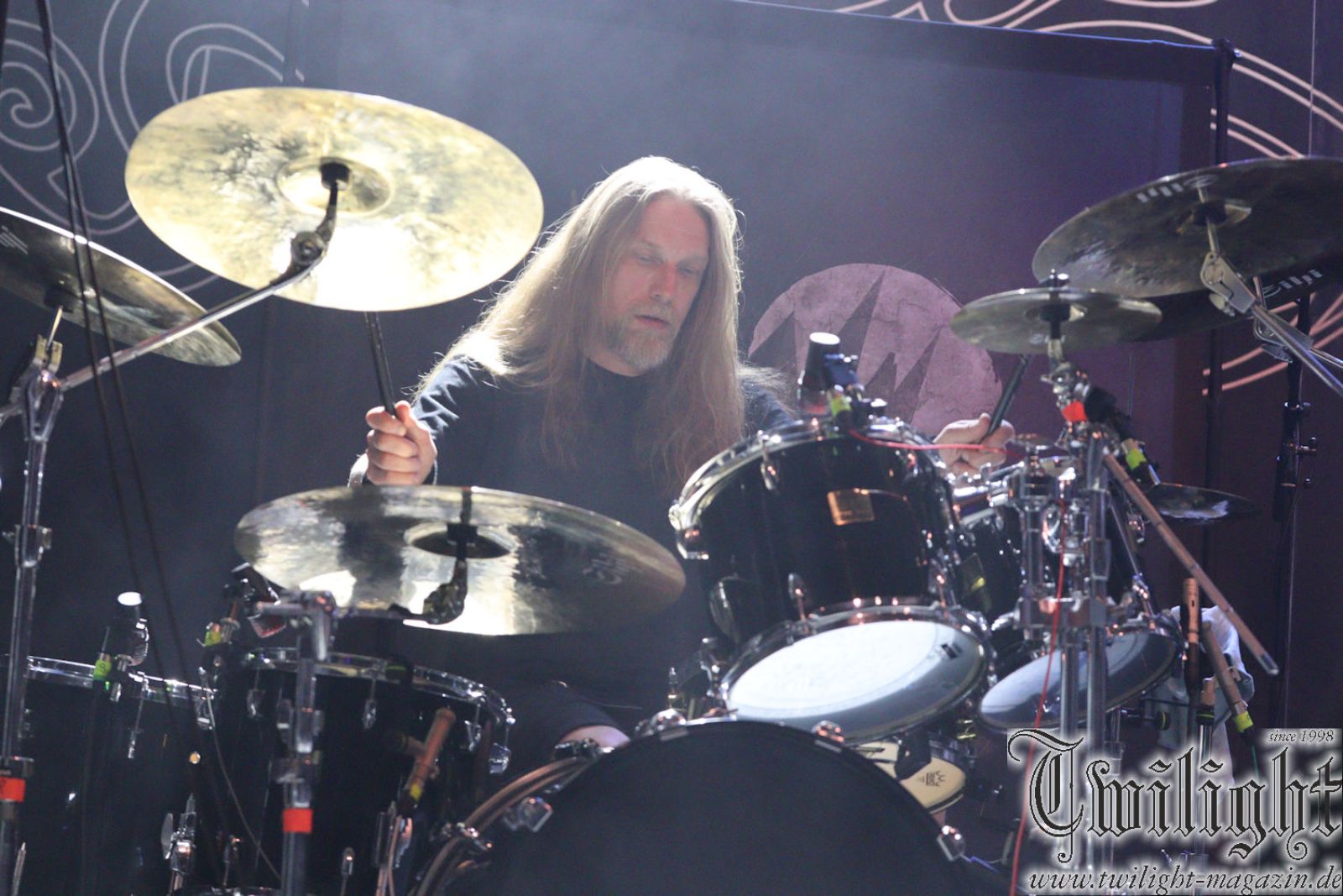 Mit ein wenig Sorge um Greg Mackintosh, der aufgrund gesundheitlicher Probleme einen enormen Gewichtsverlust aufweist, warte ich gespannt auf die Band. Ja, Mackintosh sieht nicht gut aus, aber die Performance leidet nicht darunter. Aaron Aedy tänzelt wie immer mit einem fröhlichen Lächeln hin und her, Jeff Singer bleibt hinter seiner Schallschutz-Wand fast unsichtbar (Nebel und Scheinwerfer tun ihr übriges dazu), und auch Steve Edmondson hält sich am Bass eher im Hintergrund. Die Front ist für Mackintosh, Aedy und natürlich Nick Holmes vorbehalten. Letzterer kommt diesmal ohne Sonnenbrille auf die Bühne, scheint auch gut gelaunt zu sein und ist stimmlich tatsächlich ziemlich gut dabei.