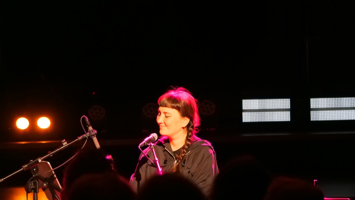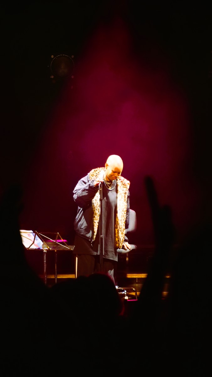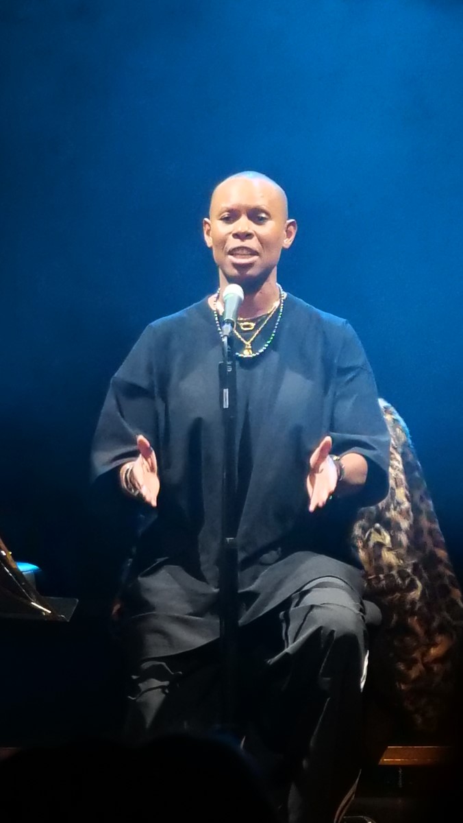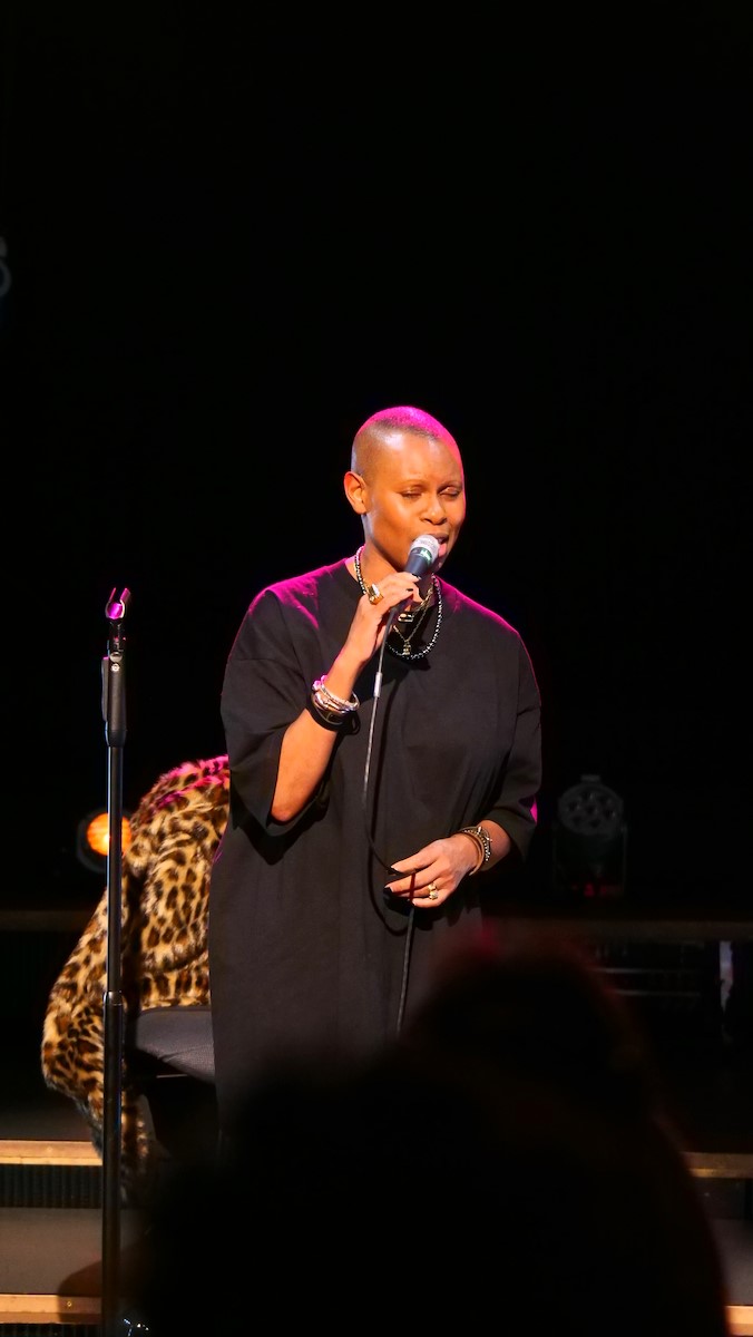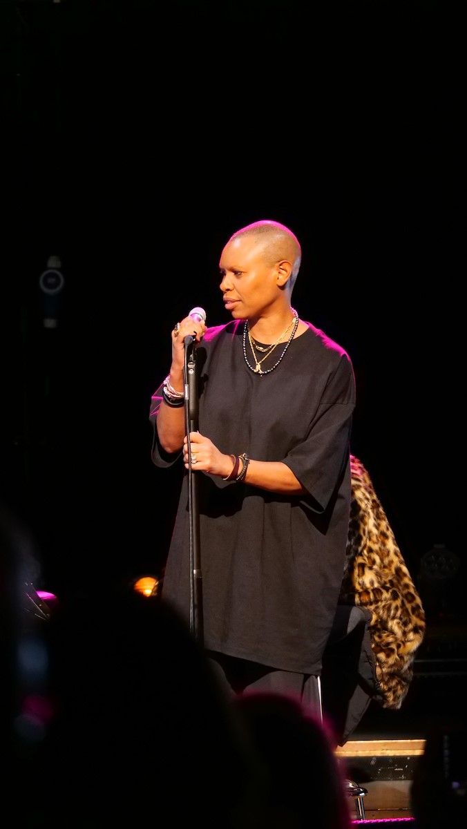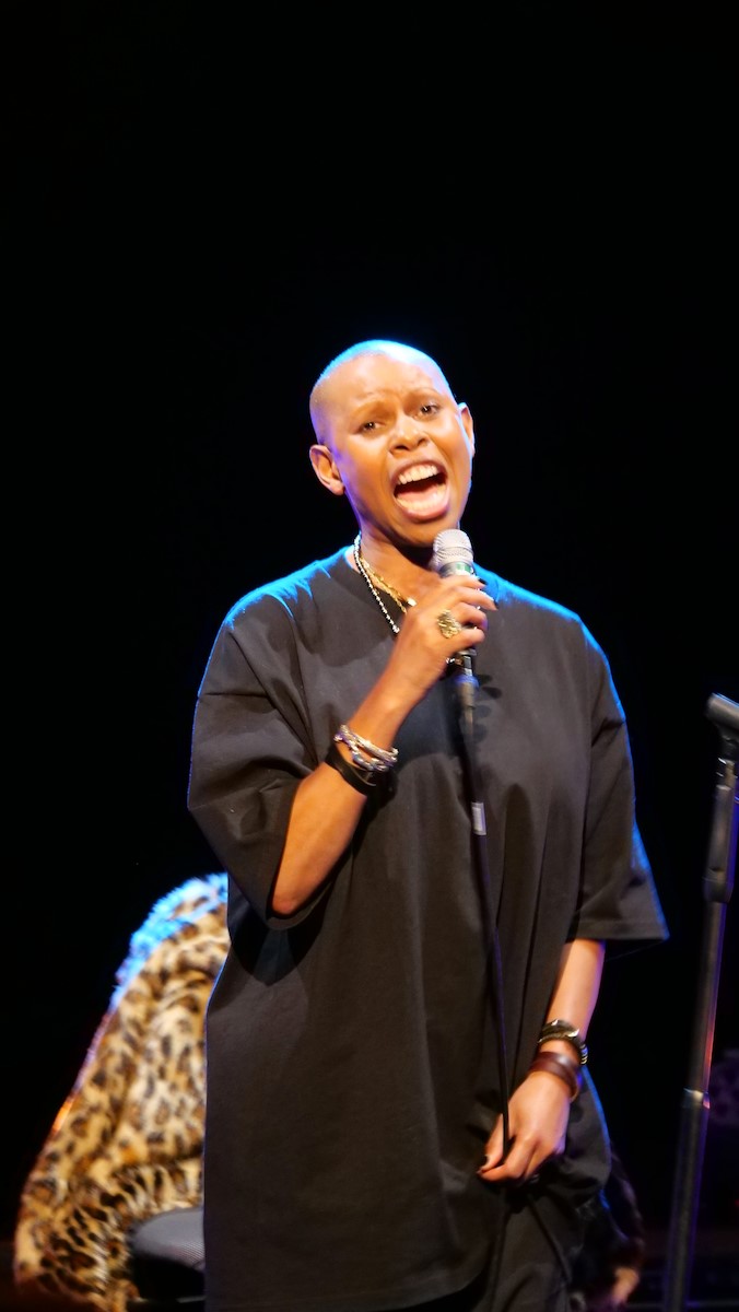 Skin und Ace waren die Haupterzähler zwischen den einzelnen Liedern. Ganz plakatisch geht es bei vielen Liedern der Band um beschissene Beziehungen zu Menschen, oftmals biographisch motiviert (Hedonism, Weak). Weak geht zurück auf eine Beziehung der Teenagerin (16 Jahre alt) Skin mit ihrem damaligen Freud (zehn Jahre älter als sie), der ihr im Auto sitzend sogar zwei mal ins Gesicht schlug. Vom neuesten Album war Lost And Found auf der Setlist. Ace sprach insbesondere davon, dass das neue Album etwas außerhalb der eigenen Komfortzone der Band entstanden ist. Er als Gitarrist hat über 30 Gitarren und auch viele Verstärker und Pedale. Und der Produzent drückte ihm eine Gitarre mit rostigen Saiten und lediglich einen Verstärker in die Hand und los ging's. Auch wurde manch Take genutzt, von dem die Bandmitglieder dachten, naja, es ist noch Probe. In dem hier sehr reduzierten Arrangement hatte der Song einen ganz anderen Charakter, klang aber stark. Die große Weltpolitik nahm Skin auf, als sie mit einigem inneren Kopfschütteln erwähnte, dass der aktuelle US Präsident weißen Südafrikanern Aysl in den USA anbietet. Skunk Anansie haben eine enge Verbindung zu Südafrika. 1997 seien sie die erste Band gewesen mit Mitgliedern unterschiedlicher Abstammung, die jemals in Südafrika ein Konzert gaben. 1998 waren sie eingeladen anlässlich Nelson Mandelas 80 jährigem Geburtstag für diesen zu spielen. Das Angebot des US Präsidenten ist kurios, weil die geringe weiße Bevölkerung eh privelegiert ist was Einkommen und Möglichkeiten angeht im Vergleich zur schwarzen. Nach Lost And Found bot die Band dem Publikum an, zu entscheiden, welchen der Songs Weak, Follow Me Down and Secretly sie als nächstes hören wollten. Es war Weak. Die anderen spielten sie auch. Secretly war dann die Zugabe.