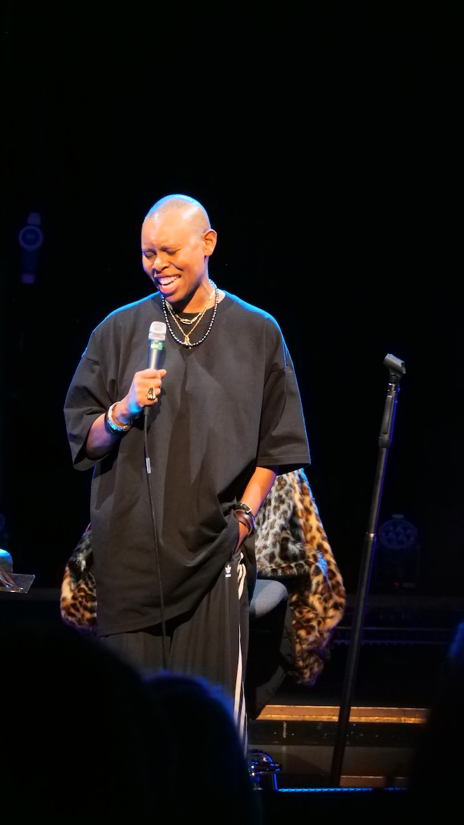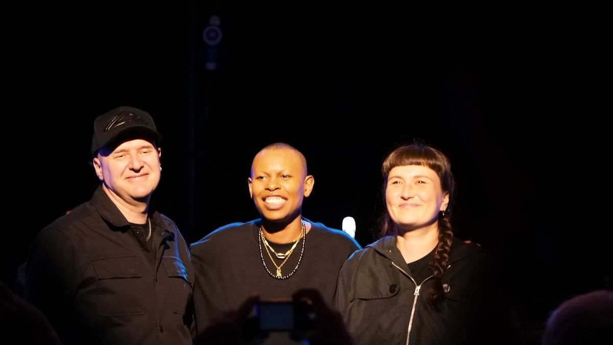 Er führte sehr unterhaltsam aus, wie eine bloße Idee immer weiter gesponnen wurde, immer mehr Entitäten hinzutraten (Rechtsabteilung, Label, Management), aber für ihn gar nicht klar genug kommuniziert war, dass diese Idee tatsächlich fliegt. Irgendwann stellte er die Frage aller Fragen. Und es wurde ihm bestätigt. - Wahrscheinlich wie Klaus Kinski [im kinskischen Ideolekt sprechend]: "Ich versteh' die Frage nich'!" Zurecht erhielt er den Applaus des Publikums. Und dann erschienen Skin, Ace und Erika, die Frau des Skunk Anansie Schlagzeugers Mark Richardson, auf der Bühne.