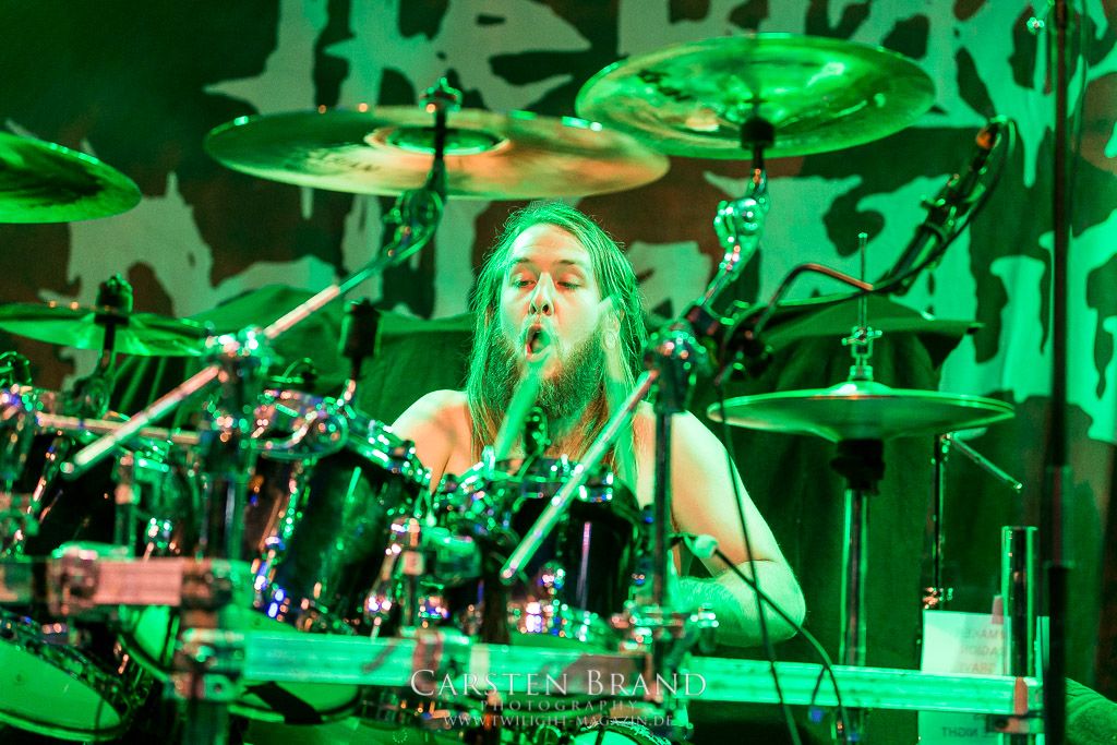 Dann wird es dunkel und Zeit für den Headlinerdes Abends. Spielten die Vorband unter sehr guten Lichtverhältnissen, bleibt die Bühne bei CANNIBAL CORPSE stilecht recht düster. Ein wenig rote Schummerbeleuchtung unterstützt von ein paar blauen Spitzlichtern müssen ausreichen. Die Herren um Mastermind Fisher knüppeln mit neuem Material nach vorne. "Code of the slashers" eröffnet den Corpse-Reigen an diesem Abend. Dieser, für Corpse´sche Verhätlnisse fast schon ruhige Track, bildet den idealen Einstieg. Das Publikum ist von Sekunde 1 an dabei und zelebriert den Auftritt. Die Todeswalze gewinnt an Fahrt und führt mit "Only one will die" die Neuvorstellung des aktuellen Silberlings "Red before Black" fort. Musikalisch braucht man hier auf wenig Neuland zu hoffen. Aber das tut auch keiner. CANNIBAL CORPSE liefern genau das ab, wofür sie seit Jahren stehen: kompromisslosen Death Metal auf den Punkt gebracht. Die neuen Stücke passen hervorragend ins Schema und zeigen die Vielfältigkeit der Band. Es wirkt zu keiner Zeit so, als hätte man sich irgendwie neu erfinden müssen. "Scourge of Iron" bildet die Brücke zu älterem material. Die Corpser kehren für kurze Zeit zum Midtempo zurück. Allerdings ist diese Verschnaufpause nur als Anlauf zu werten. Mit gewohnte Dampframmen Manier geht es in den zweiten Teil der Setlist, gespickt mit Highlights aus der Discografie. Von "Pounded into dust" über "Devoured by vermin" bis zu "Stripped, raped and strangled" fehlt keiner meiner persönlichen Highlight der Band. Die Todesmaschiene CANNIBAL CORPSE marschier tunaufhörlich durch das Musikzentrum. Klassischer Weise wird die Setlist vom allseits bekannten Hammer Smashed Face abgeschlossen und das Publikum in die Nacht entlassen. Zusammenfassend haben CANNIBAL CORPSE einmal mehr bewiesen, dass sie eine unheimliche Live Macht darstellen und zu Recht an der Spitze der Death Metal Szene stehen. Eine klare Empfehlung an alle, die noch ausstehenden Tourdaten wahrzunehmen!