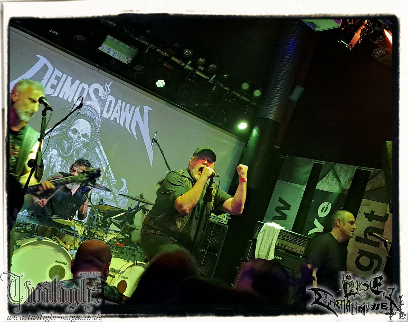 Auch DEIMOS DAWN haben etwas zu feiern. Gestern haben die Thrasher ihre neue EP ´God Of Pain´ veröffentlicht. Und so verwundert es nicht, dass neben Tracks des Debüts aus dem letzten Jahr auch die vier Eigenkompositionen der EP den Weg in die Setlist finden. Stilistisch sind die Berliner eher auf der aggressiven Seite des Thrash unterwegs, bei dem einen oder anderen Riff kommen mir Slayer in den Sinn. Auf Scheibe fehlt mir bei der EP etwas die Frische, davon kann live keine Rede sein. So ackern sich die Jungs, die beileibe keine Jungspunde mehr sind, mit Spielfreude und aggressiv durch das Set. Leider verstehen zwei Anwesende diese Aggression falsch und fliegen zu Recht nach einigen Ermahnungen raus. Da das Team der Subkultur, das sehr schnell und kompetent klärt, tut der Vorfall der Stimmung keinen Abbruch. Auch wenn ich nicht viel von Namedropping halte, kann man wohl kein Review schreiben, ohne noch mal Marc Grewe zu erwähnen. Er ist halt der bekannteste deutsche Death Metal-Shouter. Aber es wird dem Musiker Grewe nicht gerecht, ihn lediglich auf seine Todesblei-Leistungen zu reduzieren, denn er hat nicht nur bei den späten Morgoth mit “Feel Sorry For The Fanatic”, sondern u. a. auch bei Power Of Expression oder Despair bewiesen, dass gesanglich durchaus mehr in ihm steckt, als die reine Death Metal – Lehre. Und dass hört man bei DEIMOS DAWN mit ihren Crossover- und Hardcore-Vibes sowie gelegentlichen Killing Joke-Einflüssen deutlich heraus. Die alten Hasen der jüngsten Band des Abends machen nicht nur akustisch ordentlich Alarm, sie agieren auf der kleinen Bühne nicht nur routiniert, sondern extrem ambitioniert. Musikalisch sticht für mich vor allem Drummer Mathias heraus, der die Band mit seinem wuchtigen, groovigen, punktgenauen Drumming und Fills vor sich her treibt. Angenehm ist auch, dass die Band nicht die Coverversion von ´Resitance´ von der EP zum Besten gibt. So halten sie den Morgoth-Faktor möglichst gering. Nicht dass ich falsch verstanden werde, ich schätze insbesondere ´Odium´ sehr, aber DEIMOS DAWN sind eine andere Band und ich bin kein Freund vom Ausschlachten vergangener Großtaten in anderen Bands. Erfreulicherweise ist Marc auch abseits der Bühne frei von Allüren und quatscht vor der Tür mit allen, die Lust dazu haben. Die Berliner liefern einen gelungenen Gig, was man auch daran erkennt, dass der Laden trotz milder Temperaturen und etlicher Wiedersehen nach langer Zeit voll bleibt. Ganz ohne Morgoth ging es dann letztlich aber doch nicht. “Bodycount” vom “Cursed”-Album machte die Vorstellung in keinster Weise schlechter und kam nicht nur bei Twilight-Schreiber Morgoth-Fanboy Linse sehr gut an. Eine schöne Geste am Rande: DEIMOS DAWN stimmen “Happy Birthday” für die Jubilare von FINAL CRY an und das Publikum stimmt ein.