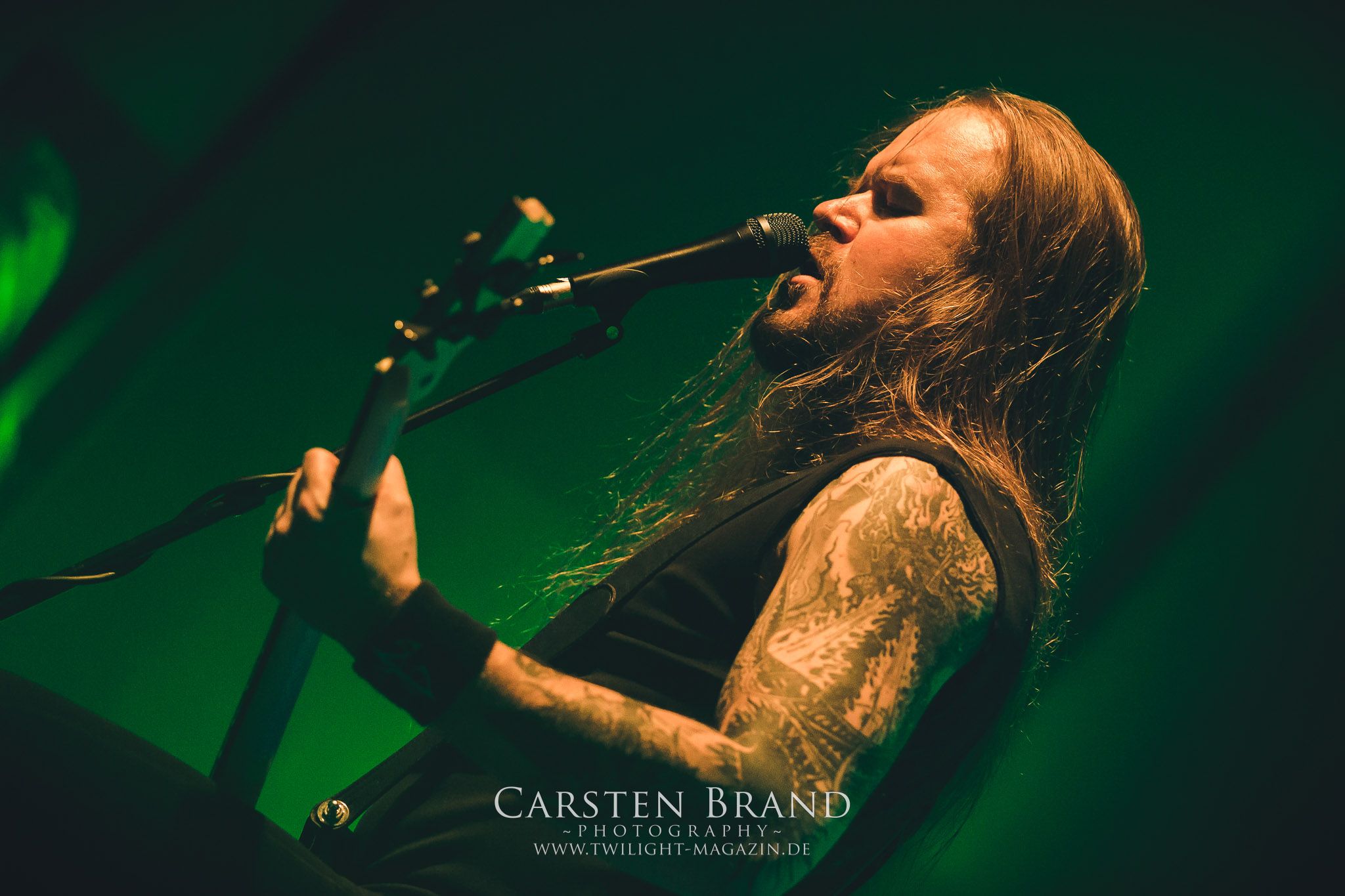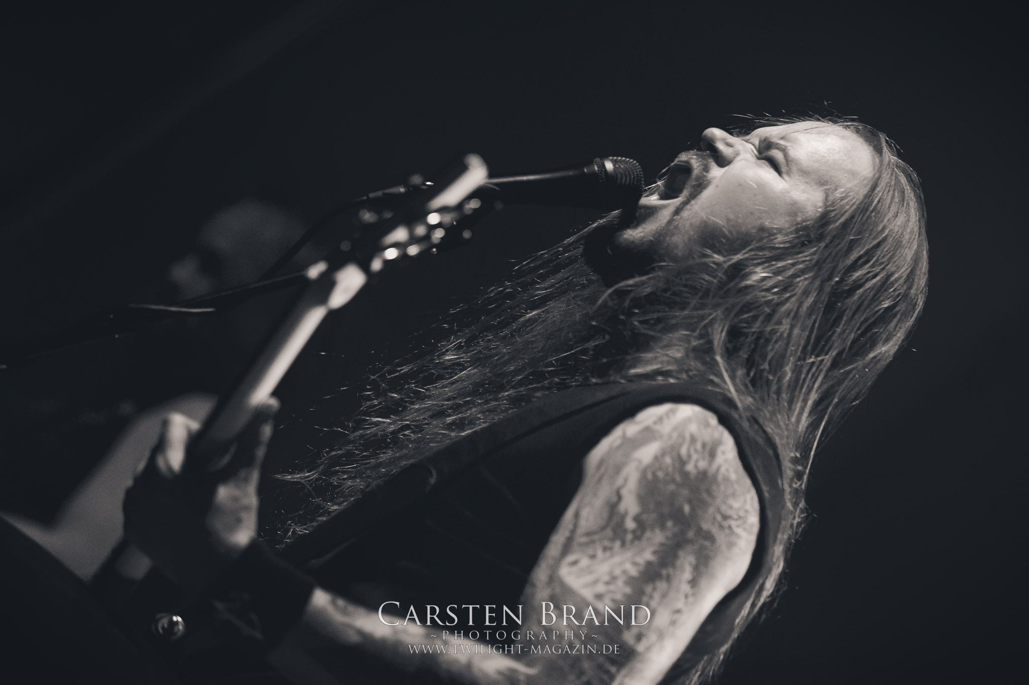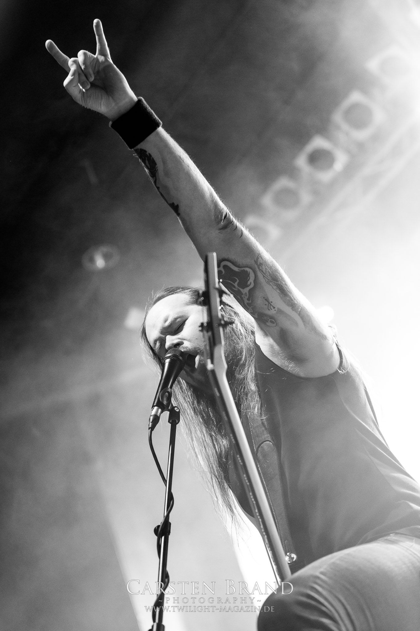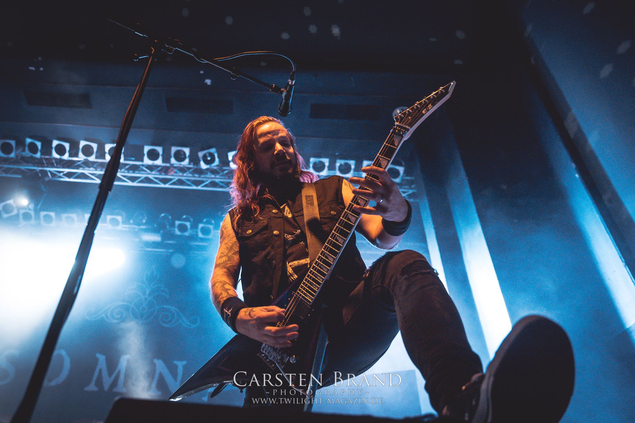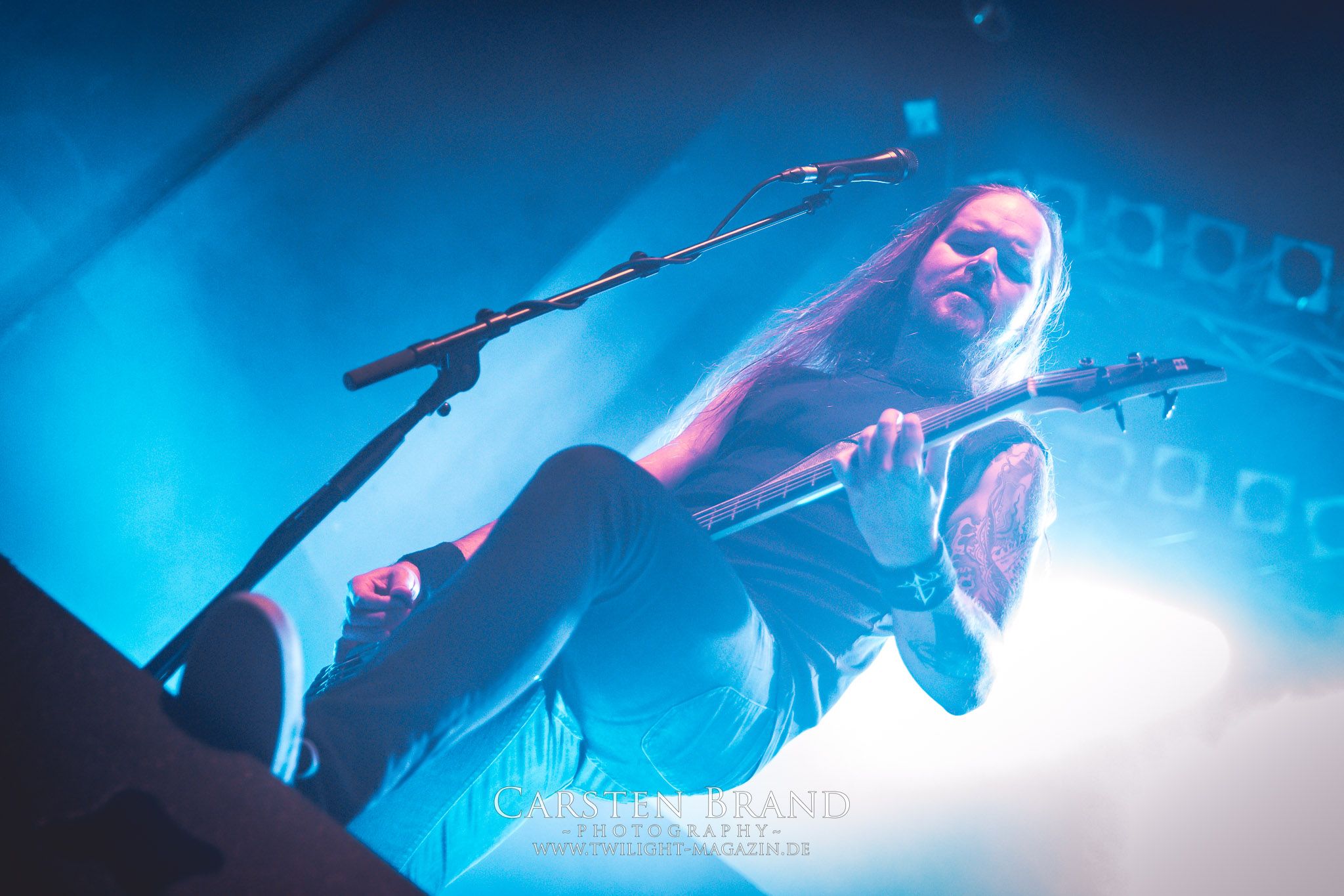 Grave" hintereinander abzufrühstücken. Gefolgt von einem Rückblick auf alte Zeiten mit "Into the Woods" vom Across The Dark-Album.und "Through the Shadows" vom One for Sorrow-Album. Es wäre ja auch langweilig, die Songs in chronologischer Reihenfolge zu spielen, sodass es nun wieder mit "Pale morning Star" in aktuelle Gefilde ging um dann die Zeit ganz weit nach hinten zu drehen, was selbst den eingefleischten Insomnium-Fan verwundert haben dürfte: Vom 2006er Album "Above the Weeping World" gab es mit "Change of Heart" und "In the Groves of Death" zwei Kostproben. Mit "And Bells they toll", "Mute is my Sorrow" und "Ephemeral" endete der offizielle und gefühlt viel zu kurze Teil des Sets. Aber zum Glück kann man sich ja immer noch auf die Zugaben freuen. Und die hatten es insich! Als das Intor zu "The Primeval Dark" erklang, war die Meute aus dem Häuschen! Was für eine Wand als dann die Gitarren einsetzten und Sänger Niilo mit den ersten Worten loslegte. Wie auf der 2014er "Shadows"-Tour folgte danach "While we Sleep". Ein schöner Rückblick auf ein fantastisches Album und eine fantastische Tour.Dass die Finnen immer für einen Spass zu haben sind, sollte sich nun mit einem Akkustik-Medley zeigen. Markus Vanhalla und Jani Liimatainen kamen mit Cowboy-Hüten und ihren Akkustik-Gitarren auf die Bühne, setzten sich auf die Monitorboxen und begannen Interpretationen von "One for Sorrow / Revelation / Heart like a Grave" zu spielen. Immer einen Schluck aus der Bierflasche dazwischen und ein Grinsen