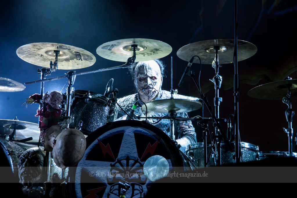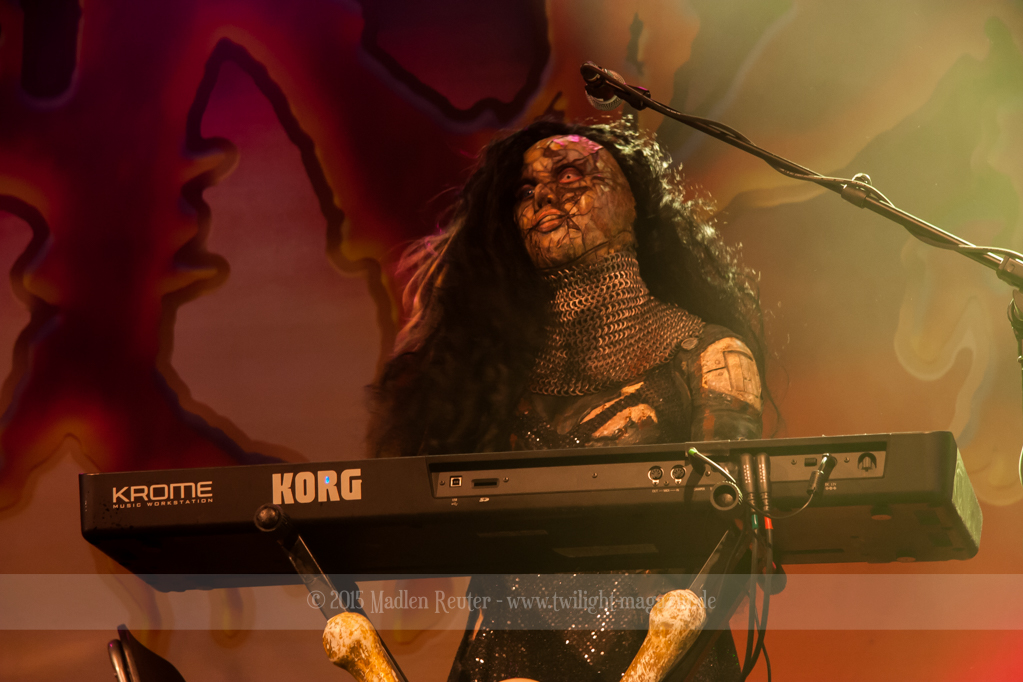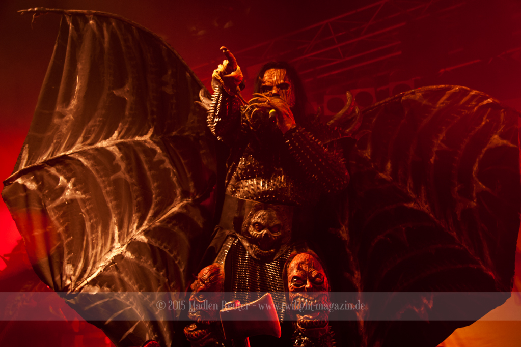 Dann wurde es auch schon Zeit für LORDI. Das Licht ging aus und „God Of Thunder“ hallte aus den Boxen. Kurz darauf betrat das freundliche Kabinenpersonal die Bühne, angeführt von einer Stewardess, die auf der Bühne eine kurze Sicherheitseinweisung gab. Mit „Nailed By The Hammer Of Frankenstein“ legte die Monstertruppe dann direkt mit einem genialen Stimmungsmacher los. Nicht nur die Band nutzte die Power dieses Songs aus, sondern auch das Publikum lässt sich in dessen Bann ziehen. Den Eurovision-Hit „Hard Rock Hallelujah“ brachten sie bereits als Drittes. Aber bei einer derart starken Setlist sei ihnen das erlaubt. Über den gesamten Abend war der Sound absolut spitzenmäßig, lediglich das Keyboard war etwas zu leise. Nebst wuchtigem Sound durften sich die Besucher auch über eine geniale Lichtshow freuen, die eine bombastische Stimmung erzeugte. Allerdings wurde die Setlist ein wenig gekürzt, und so flogen „Man Skin Boots“ und „Sir, Mr. Presideath, Sir!“ aus dem Programm. Schade um Letzteren, da dieser einfach auf die Bühne gehört hätte. Während „It Snows In Hell“ hat es dann kurzzeitig wirklich geschneit und bei „Hell Sent In The Clowns“ wurden die ersten Reihen von monströsen Clowns mit Kunstblut übergossen.