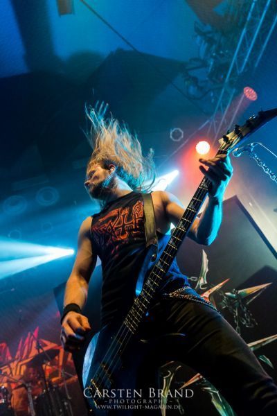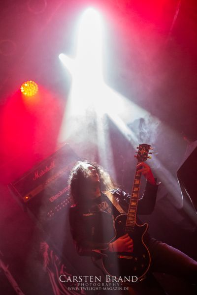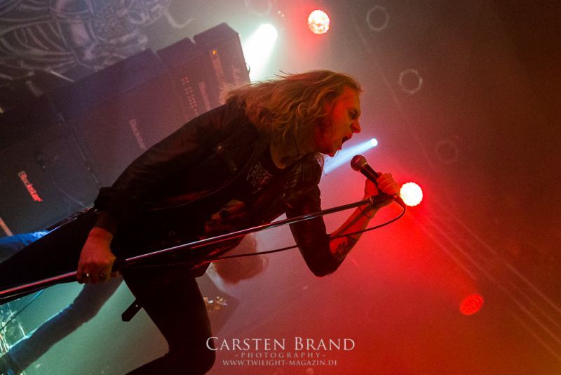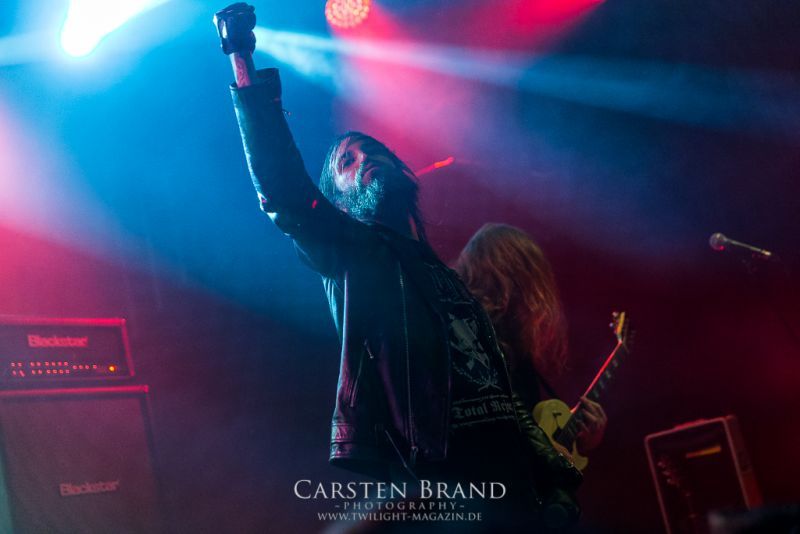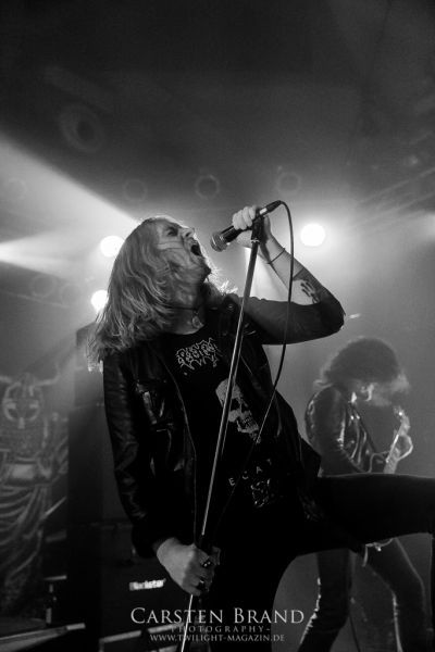 Der Konzertabend beginnt verkehrsbedingt mit einer Punktlandung zum Intro von DEATHRITE. Die Sachsen, die ich auf keinen Fall verpassen wollte, empfehlen sich auf dieser Tour nach der kürzlichen Veröffentlichung ihres jüngsten Werkes "Nightmares Reign" für höhere Weihen und verlassen sich dabei vollständig auf das Material von eben jenem Geniestreich. Eine durchaus risikofreudige Entscheidung, erschließt sich doch der ranzige, faulige Rock ´N´Roll-beeinflusste Death Metal nicht unbedingt beim ersten Hören. Mit dem einen oder anderen gradlinigem Song aus der Death-/Crust-Grind-Ära der eigenen Historie hätte man es sich sicher deutlich einfacher machen können, das Publikum der sich langsam füllenden Location auf die Seite zu ziehen. Aber Deathrite erfinden sich halt immer wieder neu und haben folglich auch kaum Probleme, mit dem neuen Material zu früher Stunde in Hannover zu bestehen. Mit neuem Bassmann, der sein Instrument ordentlich und schön knarzig pumpen lässt und einem zweiten Gitarristen führt die Band den Death `N´Roll auf den "Left Hand Path" zurück und kreiert eine abgrundtief-morbide Todesmetall-Atmosphäre, wobei die Musik selbst mittlerweile wesentlich vielschichtiger und facettenreicher ist als es die Wurzeln des Quintetts sind. Die zweite Gitarre ist zweifelsohne eine Bereicherung. Insbesondere bei den schrägen Leads und Soli harmonieren und ergänzen sich Andy und Tom sehr gut, auch wenn die Klampfen gemeinsam deutlich mehr hätten sägen müssen. Tony ist zwar keine klassische Rampensau aber trotzdem ein unheimlich charismatischer Frontmann, der von seinem kräftigen Organ und seinen dezenten Gesten lebt, während Beff an den Trommeln das Fundament für den halsbrecherischen Deathrite-Groove legt. Auch wenn mir die Jungs auf dem Underground Remains Open Air im Sommer konstellationsbedingt wesentlich besser gefallen haben, so zieht man sich in der Opener-Position beachtlich bis amtlich aus der Affäre und provoziert sogar einige Zugabenforderungen. Und neues Album hin oder her: "Where Evil Arises" wäre zum Schluss Pflicht gewesen.