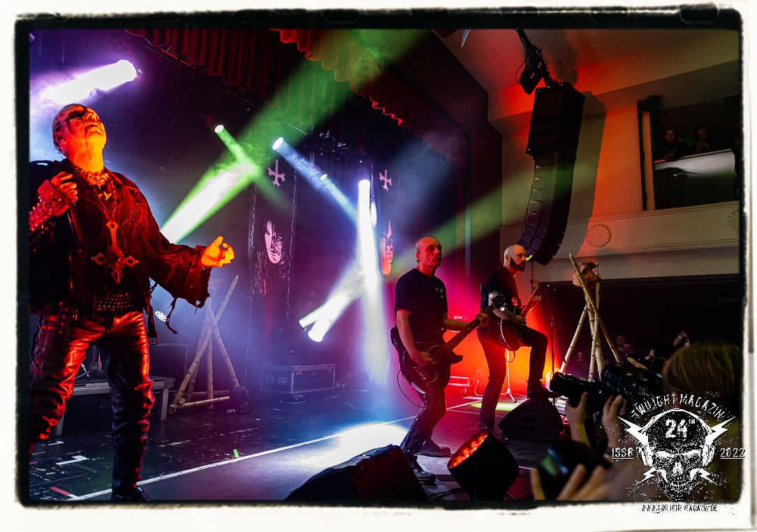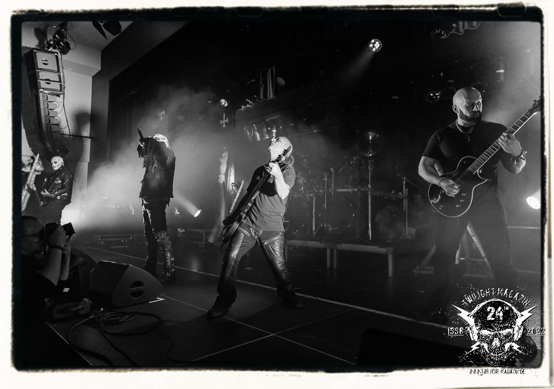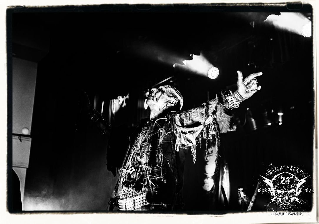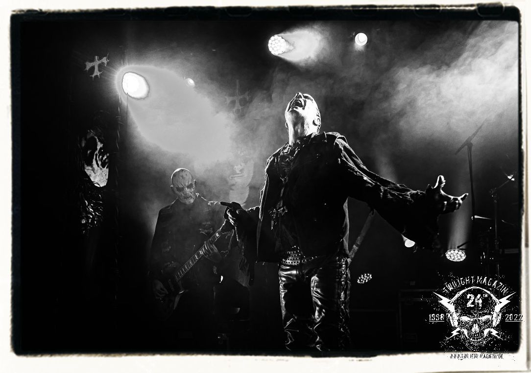 Die einstimmenden Klangkollagen gipfeln schließlich im Percussion-Intro "Silvester Anfang", welches nicht nur die "Deathcrush"-EP von 1987, sondern auch den Beginn des Konzertes einleitet. Endlich betreten Hellhammer, Necrobutcher, die beiden Gitarristen Teloch und Ghul sowie schließlich Sänger Attila Csihar die Bühne. Die Frage nach der Setlist stellt sich zunächst nicht. "Deathcrush", "Necrolust", "Funeral Fog", "Freezing Moon", bei dem die ursprüngliche "When it´s cold, when it´s dark..."-Ansage von Dead eingespielt wird, "Carnage", "Buried By Time And Dust", "Pagan Fears", "Chainsaw Gutsfuck" und schließlich das finale "Pure Fucking Armageddon" entsprechen den Songs, die MAYHEM im November 1990 mit Øystein Aarseth und Per Yngwe Ohlin alias Euronymous und Dead im Eiskeller zu Leipzig spielten. Bassist Necrobutcher lässt es sich nicht nehmen, seine ebenfalls auf dem Live-Album konservierte und seinerzeit der Irritation über die verhaltenen Publikums-Reaktionen geschuldete "Are you dead?"-Ansage noch einmal zu zelebrieren, um danach "Carnage" anzukündigen. Darüber hinaus verzichten MAYHEM glücklicherweise auf überflüssigen Firlefanz, sondern lassen die Musik sprechen. Und so zeichnen sie ein historisches Konzert und den Weg einer Band nach, die in den späten Achtzigern aus dem Death Metal - Underground kam und in der Entwicklung der Protagonisten und Musik schließlich im Black Metal Maßstäbe setzte. "Live in Leipzig" ist aus meiner Sicht auch gerade deshalb so bedeutend, weil es MAYHEM ungefiltert an der Schwelle zwischen den noch deutlich vom extremen Metal der Achtziger geprägten Frühphase in der Entwicklung zu dem Ausdruck zeigt, der schließlich mit dem 1994 veröffentlichten Meilenstein "De Mysteriis Dom Sathanas" nach dem Tod von Euronymous 1993 gipfelte und eine Ära der Band beendete. Natürlich ist das Format 2022 ein anderes und die Band um die verbliebene Rythmus-Sektion Hellhammber/Necrobutcher gewisserweise eine andere. Doch MAYHEM zelebrieren ihr Erbe tatsächlich würdevoll. Die Show ist nicht so chaotisch und abgefuckt, wie auf dem Party.San, was jedoch einer Doku zum Gig geschuldet sein könnte, die zum Revival parallel gedreht wird, und ich würde auch nicht ausschließen wollen dass auch dieser Abend in Leipzig seinen Weg auf einen Tonträger finden wird. Hellhammer ist wie meistens in der Dunkelheit bzw. im dezenten Licht hinter seinem Schlagzeug kaum zu sehen, dafür ist seine Präsenz in beeindruckender Weise zu hören. Attila, seit "De Mysteriis Dom Sathanas" über "Ordo ad Chao" (2007) bis heute wie sein Vorgänger Dead und Nachfolger Maniac untrennbar mit MAYHEM verbunden, beschränkt sich auf sein Organ und seine Fähigkeiten als Hohepriester blasphemischer Gesten und Symbolik. Die beiden Gitarristen Teloch und Ghul sind mittlerweile schon rund zehn Jahre dabei und verkörpern die Fähigkeit der Band, sich immer wieder neu zu erfinden. Sie sorgen für einen dichten Gitarrenteppich. Dabei treten sie nach außen ziemlich gegensätzlich in Erscheinung, der Norweger Teloch mit Corpsepaint wirkt extrem grimmig, die Les Paul-Adaption lässig tief hängend, der Brite Ghul ungeschminkt, durchtrainiert, die Gitarre dabei unter der Brust. Posieren können sie jedoch beide. Und Necrobutcher ist Necrobutcher, zuständig für Bass, Wein und "Kommunikation" mit dem Publikum.