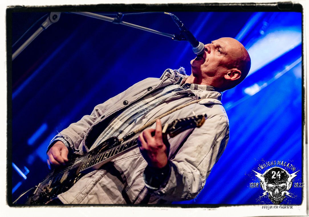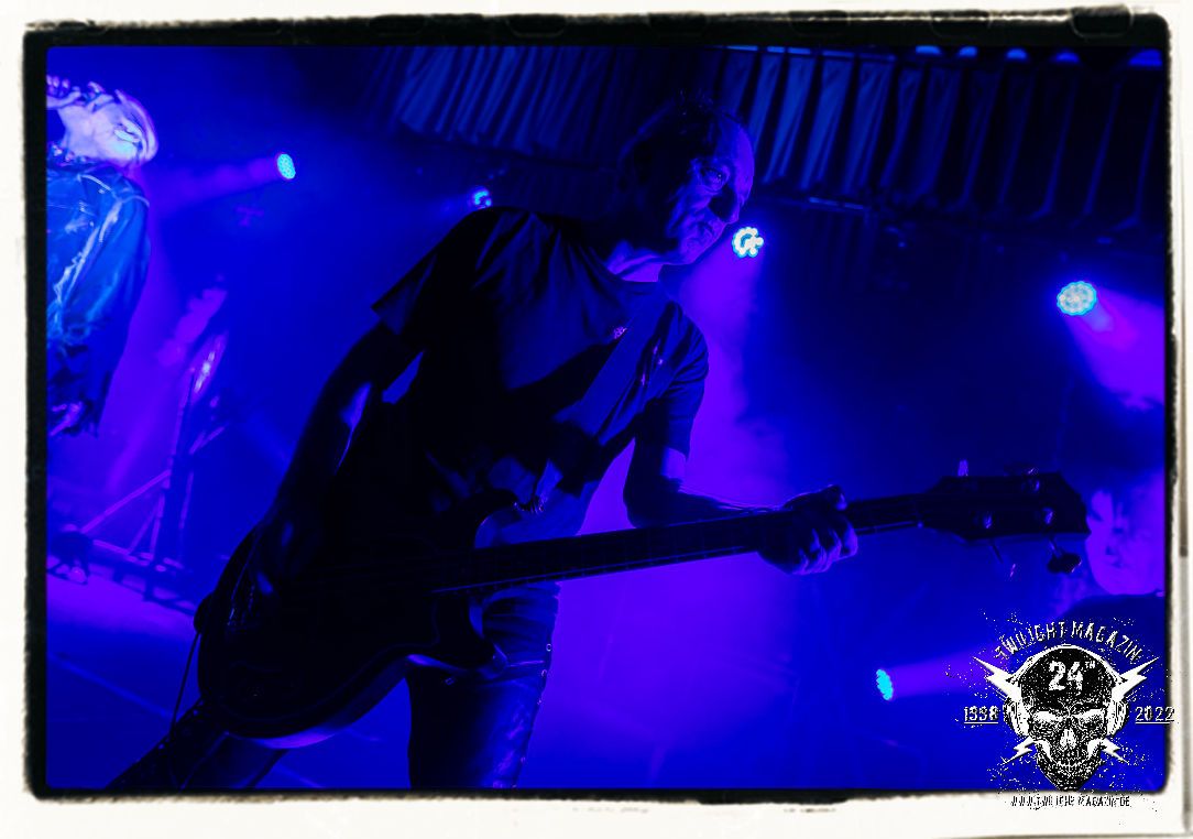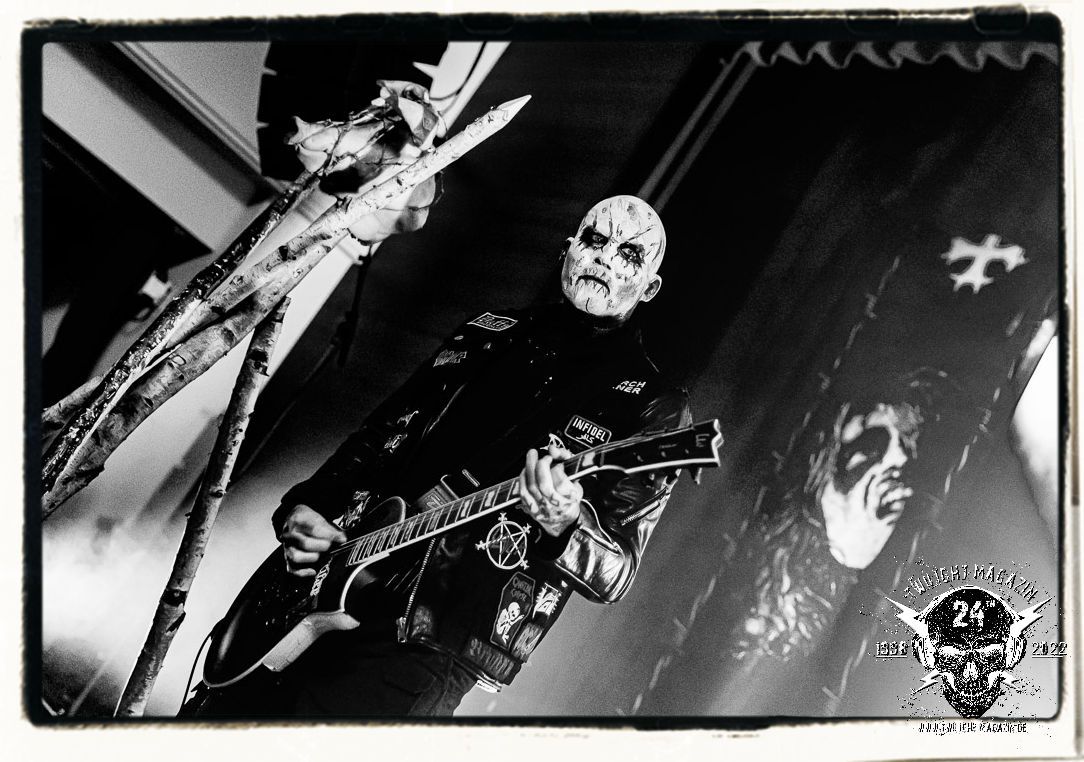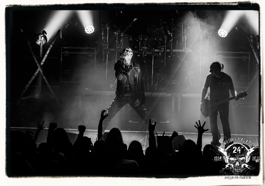 Die einstimmenden Klangkollagen gipfeln schließlich im Percussion-Intro "Silvester Anfang", welches nicht nur die "Deathcrush"-EP von 1987, sondern auch den Beginn des Konzertes einleitet. Endlich betreten Hellhammer, Necrobutcher, die beiden Gitarristen Teloch und Ghul sowie schließlich Sänger Attila Csihar die Bühne. Die Frage nach der Setlist stellt sich zunächst nicht. "Deathcrush", "Necrolust", "Funeral Fog", "Freezing Moon", bei dem die ursprüngliche "When it´s cold, when it´s dark..."-Ansage von Dead eingespielt wird, "Carnage", "Buried By Time And Dust", "Pagan Fears", "Chainsaw Gutsfuck" und schließlich das finale "Pure Fucking Armageddon" entsprechen den Songs, die MAYHEM im November 1990 mit Øystein Aarseth und Per Yngwe Ohlin alias Euronymous und Dead im Eiskeller zu Leipzig spielten. Bassist Necrobutcher lässt es sich nicht nehmen, seine ebenfalls auf dem Live-Album konservierte und seinerzeit der Irritation über die verhaltenen Publikums-Reaktionen geschuldete "Are you dead?"-Ansage noch einmal zu zelebrieren, um danach "Carnage" anzukündigen. Darüber hinaus verzichten MAYHEM glücklicherweise auf überflüssigen Firlefanz, sondern lassen die Musik sprechen. Und so zeichnen sie ein historisches Konzert und den Weg einer Band nach, die in den späten Achtzigern aus dem Death Metal - Underground kam und in der Entwicklung der Protagonisten und Musik schließlich im Black Metal Maßstäbe setzte. "Live in Leipzig" ist aus meiner Sicht auch gerade deshalb so bedeutend, weil es MAYHEM ungefiltert an der Schwelle zwischen den noch deutlich vom extremen Metal der Achtziger geprägten Frühphase in der Entwicklung zu dem Ausdruck zeigt, der schließlich mit dem 1994 veröffentlichten Meilenstein "De Mysteriis Dom Sathanas" nach dem Tod von Euronymous 1993 gipfelte und eine Ära der Band beendete. Natürlich ist das Format 2022 ein anderes und die Band um die verbliebene Rythmus-Sektion Hellhammber/Necrobutcher gewisserweise eine andere. Doch MAYHEM zelebrieren ihr Erbe tatsächlich würdevoll. Die Show ist nicht so chaotisch und abgefuckt, wie auf dem Party.San, was jedoch einer Doku zum Gig geschuldet sein könnte, die zum Revival parallel gedreht wird, und ich würde auch nicht ausschließen wollen dass auch dieser Abend in Leipzig seinen Weg auf einen Tonträger finden wird. Hellhammer ist wie meistens in der Dunkelheit bzw. im dezenten Licht hinter seinem Schlagzeug kaum zu sehen, dafür ist seine Präsenz in beeindruckender Weise zu hören. Attila, seit "De Mysteriis Dom Sathanas" über "Ordo ad Chao" (2007) bis heute wie sein Vorgänger Dead und Nachfolger Maniac untrennbar mit MAYHEM verbunden, beschränkt sich auf sein Organ und seine Fähigkeiten als Hohepriester blasphemischer Gesten und Symbolik. Die beiden Gitarristen Teloch und Ghul sind mittlerweile schon rund zehn Jahre dabei und verkörpern die Fähigkeit der Band, sich immer wieder neu zu erfinden. Sie sorgen für einen dichten Gitarrenteppich. Dabei treten sie nach außen ziemlich gegensätzlich in Erscheinung, der Norweger Teloch mit Corpsepaint wirkt extrem grimmig, die Les Paul-Adaption lässig tief hängend, der Brite Ghul ungeschminkt, durchtrainiert, die Gitarre dabei unter der Brust. Posieren können sie jedoch beide. Und Necrobutcher ist Necrobutcher, zuständig für Bass, Wein und "Kommunikation" mit dem Publikum.