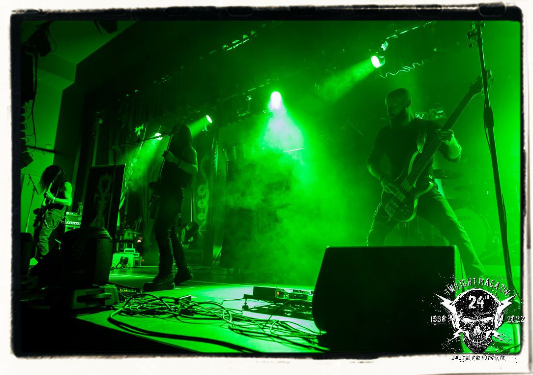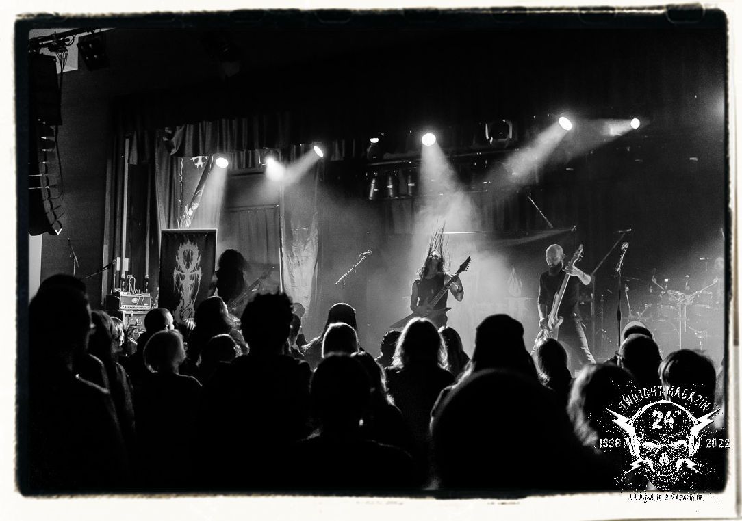 Danach ist Schluss mut lustig und es wird dunkel. Umbau und auch Soundcheck verlaufen zügiger als erwartet. Doch anschließend heißt es für alle in der mittlerweile gut gefüllten Location warten. Die Spannung steigt bei fahlem, düsteren Licht, das die Konterfeis der Protagonisten von 1990 - Dead, Hellhammer, Necrobutcher und Euronymus - in Szene setzt. Die vier übergroßen Banner hängen mit eben jenen schemenhaften Portraits, die einst das Originalplakat zierten, von der Decke und flankieren die Bühne auf beiden Seiten. Eine ganz eigene Geschichte könnte man über den Schweinekopf erzählen, der 1990 als Bühnendeko und Requisit zum Einsatz kam und sozusagen mit einem zweiten Leben beschenkt wurde. 2022 sind es vier Köpfe, aufgespießt auf Birkenholzpfähle, die am Bühnenrand präsentiert werden und das Schlagzeugpodest einrahmen.