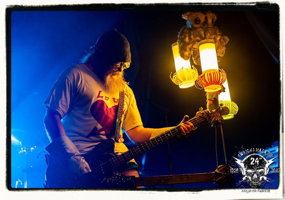 Die Urgesteine von MANOS waren schon am 26.11.1990 Vorband im Eiskeller. Damals normal, würde heute wohl kaum ein Veranstalter auf die Idee kommen, MAYHEM mit MANOS auf einen Einzelgig zu buchen. Allerdings verbindet MANOS mit den Schwarzmetallern MAYHEM ungeachtet vom kommerziellen Erfolg heute nach wie vor Die Anti-Haltung. Während sich diese bei MAYHEM in Form einer musikalischen Breitwand-Inszenierung zeigt, stehen MANOS für eine metallische Grind- und Hardcore-Persiflage, die Klischees einer testosterondominierten Szene ad absurdum führt. Das Ritual von Basser Eule, Gitarrist/Sänger Andrew und Drummer Ratze ist bunt, farbenfroh und lebensbejahend. Konzerte von MANOS dürfen und sollen Freude machen. Das Trio aus Querfurt in Sachsen-Anhalt ist nicht nur, vor allem aber im Osten Deutschlands absoluter Kult, weil sie es schaffen, brutalen Death Metal mit Hardcore, Punk und Grindcore über ihren ureigenen Humor zu verbinden, der trotz des subtilen Slapstiks authentisch, weder gekünstelt, noch albern wirkt. Und MANOS haben es bei ihrem Heimspiel daher auch nicht nötig, sich im historischen Schatten der Norweger zu verbiegen, sondern ziehen ihren Stiefel einfach durch. Einzig auf einen weihnachtlichen Tannenbaum am Bass verzichtet Eule am heutigen Abend. Ansonsten gibt´s das volle Programm inkl. "Ulehule", der Querfurter Bockwurst, "Komm in den Garten", "Biene Maja" oder "Teacher´s Pants" etc. pp. Gerutscht werden darf natürlich auch, denn das Publikum ist ein integraler Bestandteil einer jeden MANOS-Show. Nach rund einer Stunde ist der seriöse Teil des Abends dann auch vorbei. "Wer hat an der Uhr gedreht?", die Querfurter müssen sogar nachsitzen, da sie noch für eine Spontanzugabe auf die Bühne zurückgebrüllt werden.