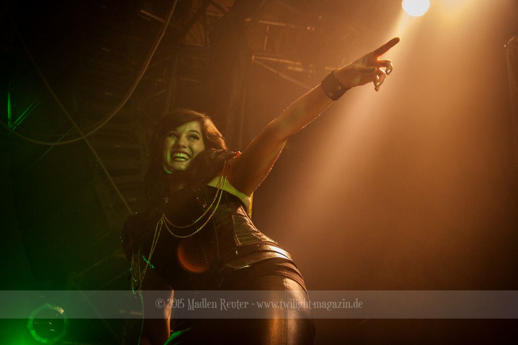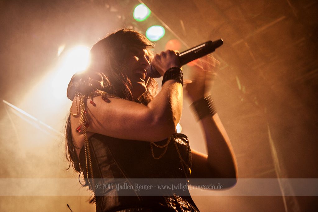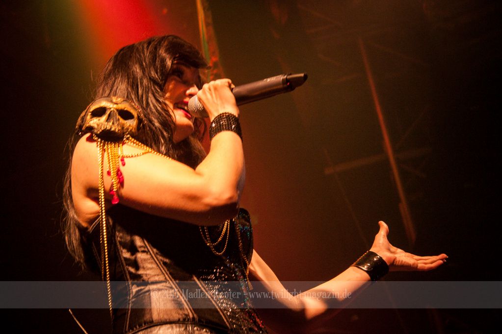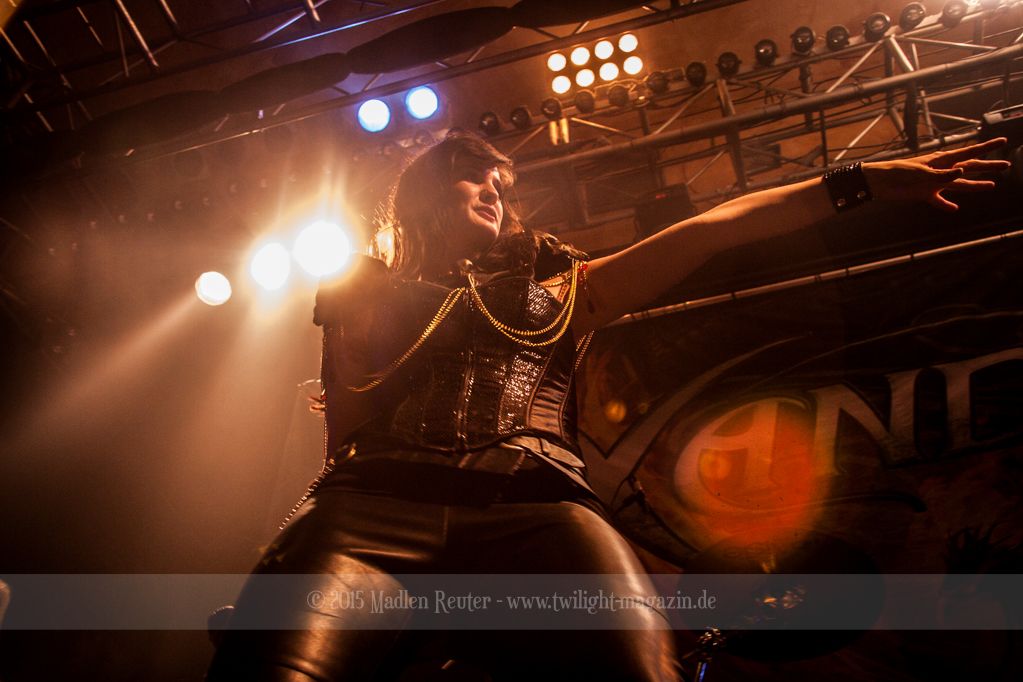 So konnte bereits XANDRIA von einem höchst motivierten Publikum profitieren. Sängerin Dianne van Giersbergen weiß ihre charmante Art gekonnt einzusetzen, und wickelt damit die Menge um den Finger. Aktives Bangen und Hüpfen standen auf der Tagesordnung, sowohl bei der Band selbst, als auch vor der Bühne. Ich war positiv überrascht, denn vorab wusste ich nicht so recht, was mich erwarten würde. Die Fronterin hat ihre Stimme vollends unter Kontrolle und ernsthafte Ohrenschädigungen bleiben somit aus – Puh! Auch die Saitenfraktion interagierte freudig erregt mit dem Publikum, und untereinander.
