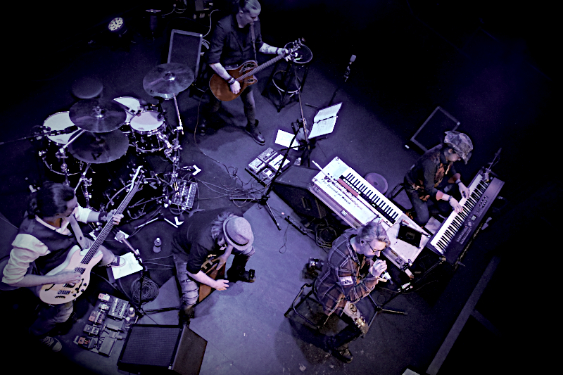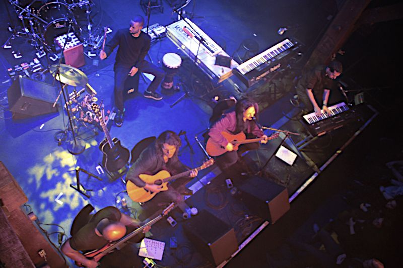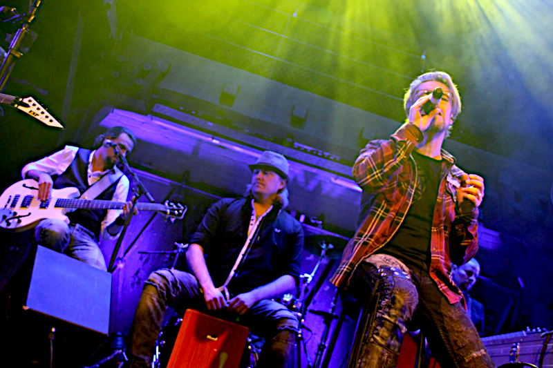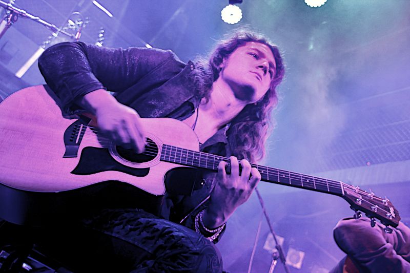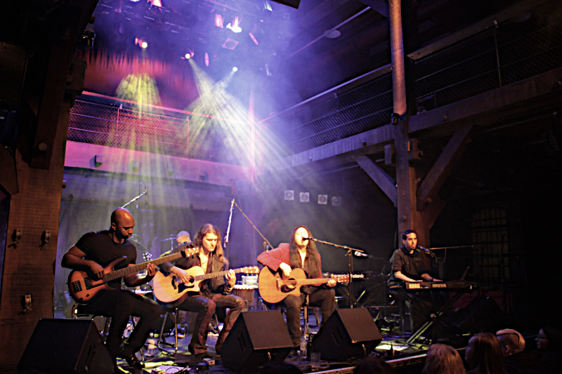 Direkt am Bühnenrand ließen sich um 20 Uhr die amerikanischen Prog-Metaller WITHERFALL nieder und griffen zu den Instrumenten. Die Amis haben passend zum Tour-Motto mit „Vintage“ eine Akustik-EP im Gepäck, so dass der Posten als Anheizer für SONATA ARCTICA hervorragend passte. Mit Ahmad Dubose-Dawson an den Trommeln, Rasseln usw. und Alex Nasla an den Keyboards und dem Background Gesang hatten die Kaliforniern gleich zwei Leute mit an Bord, die ich bislang noch nicht kannte. Allerdings bin ich auch wirklich kein WITHERFALL Experte. Gleich zu Beginn der Show wurde klar, dass das Akustik-Setting auch für professionelle Musiker gewöhnungsbedürftig ist, denn die Atmosphäre ist deutlich intimer, die Kommunikation zwischen Musikern und Publikums unmittelbarer. So schlichen sich selbst bei solch versierten Musikern wie WITHERFALL anfangs einige Unsicherheiten ein. Darüber sahen aber sowohl Fans als auch Musiker mit einem Lächeln hinweg und irgendwann hatte sich die Band dann auch eingegroovt und ließ sich weder vom herben Jever Pils noch von kleinen Abspracheproblemen nicht aus der Ruhe bringen. Im Gegenteil, Anthony Crawford frickelt in atemberaubendem Tempo auf seinem Tieftöner rum und Gitarrist Jake Dreyer flitzte regelrecht über das Griffbett seiner Akustikklampfe. Frontmann Joseph machte nicht nur durch sein samtrotes Jackett auf sich aufmerksam, sondern auch durch stimmliche Ausflüge in höchste Regionen. Spätestens mit „Ode To Despair“ hatte die Band das Publikum auf seiner Seite und Songs wie „I want back down“ von TOM PETTY oder „The Great Awakening“ vom 2017er Debüt der Band wirkten auch im akustischen Gewand perfekt. Vielleicht hätten sich einige der Anwesenden dennoch gewünscht, dass die Jungs „Fade to Black“ zu Ende bringen. Nächstes Mal vielleicht. Nach einer knappen Stunde konnten WITHERFALL jedenfalls zufrieden von der Bühne gehen und das Publikum verabschiedete die sympathischen Amis mit donnerndem Applaus.