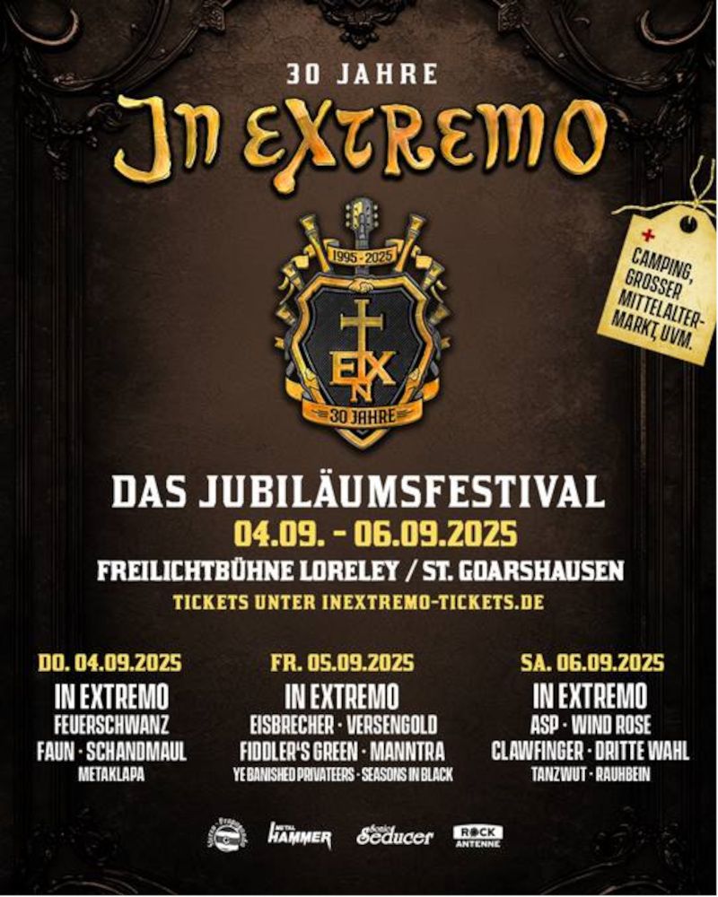 2025 jährt sich die Gründung von IN EXTREMO zum 30. Mal: Um diesen Anlass mit ihren Fans gebührend feiern zu können, veranstalten die sechs Musiker vom 04. bis zum 06.09.25 ein großes, dreitägiges Jubiläumsfestival auf der Freiluftbühne Loreley. Zahlreiche Freunde und musikalische Wegbegleiter werden mit ihren Auftritten die große Geburtstagsparty bereichern. IN EXTREMO werden an allen drei Tagen als Headliner die jeweiligen Abende beschließen.