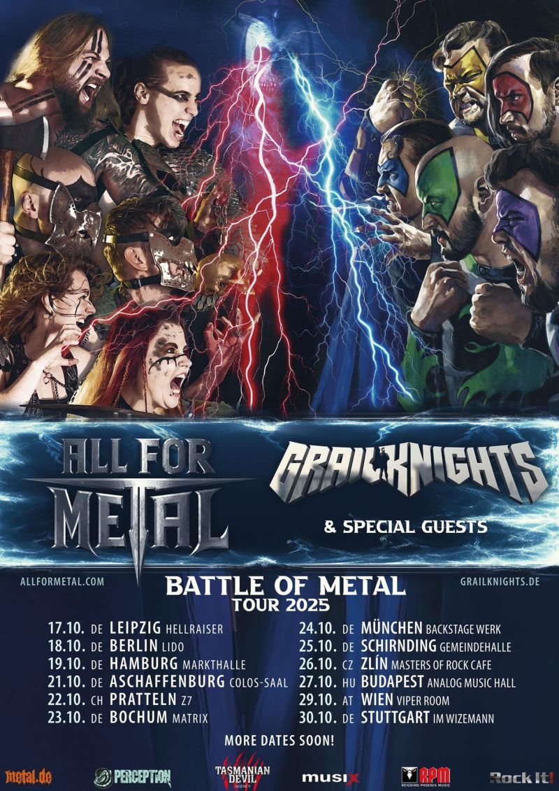 Die Kriegerinnen und Krieger von ALL FOR METAL gehören zu den aktuell angesagtesten Bands der Szene: Innerhalb kürzester Zeit brachten sie zwei Studioalbum auf den Markt, wobei ihr Zweitwerk „Gods Of Metal (Year Of The Dragon)" gar auf Platz 12 der offiziellen deutschen Charts landete, und spielten zahlreiche Konzerte. Abend um Abend gewannen ALL FOR METAL mit ihren starken Auftritten neue Fans, während sie mit Genregrößen wie WINDROSE, LORDI, ORDEN OGAN und kürzlich DIRKSCHNEIDER auf Tournee waren. Doch nun ist es an der Zeit, einen Gang hochzuschalten, denn ALL FOR METAL werden im Herbst 2025 erstmalig die europäischen Bühnen headlinen! Mit dem Superheldenkollektiv GRAILKNIGHTS wird eine nicht minder schlagkräftige Truppe den Tross als Co-Headliner ergänzen. Und wer in der Schule aufgepasst hat, weiß: Wo Kräfte aufeinanderprallen, da knallt es gewaltig - in diesem Fall auf musikalischer Ebene! Heavy/Power-Metal-Fans, aber auch Metalheads, die sich ein Aufeinandertreffen zweier höchst unterhaltsamer Acts nicht entgehen lassen wollen, sollten sich diese Termine dick im Kalender anstreichen. Schärft schon einmal eure Schwerter und sichert euch rasch die heißbegehrten Tickets!
