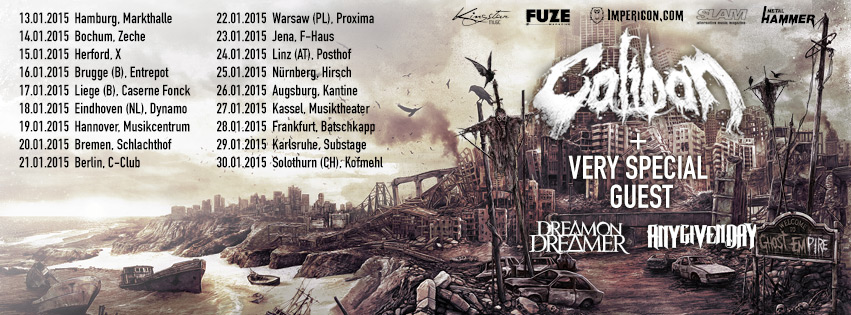 Fast 20.000 Fans begeisterten CALIBAN kurz nach der Veröffentlichung ihres neuen Albums auf der diesjährigen Progression Tour im Co-Package mit The Ghost Inside und The Devil Wears Prada , die sie durch 20 Stationen in Deutschland, Österreich, Schweiz, Frankreich, Italien, Holland, Belgien und Großbritannien führte. Nun folgt aufgrund der ungebrochenen Nachfrage der Nachschlag mit einer ausgedehnten Tournee durch die Clubs der Republik. Unterstützt werden sie durch die deutschen Senkrechtstarter Any Given Day und den aus Melbourne stammenden Dream On, Dreamer. Der ganz spezielle Co-Headliner wird den Fans Mitte November mitgeteilt.