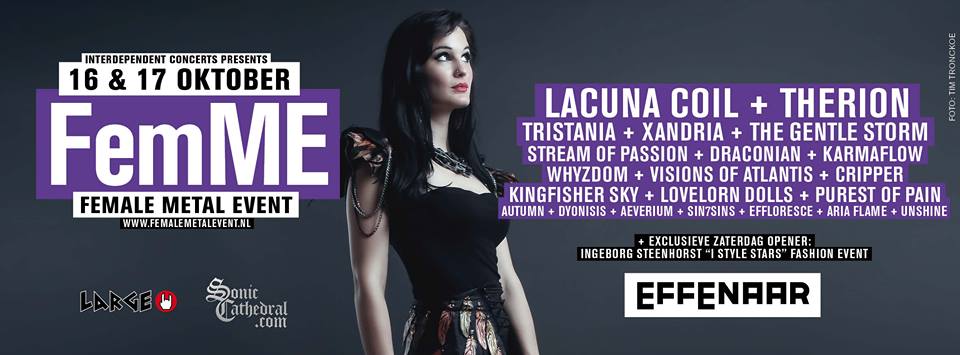Am 16. und 17. Oktober findet in Eindhoven (Effenaar, Dommelstraat 2, 5611 Eindhofen) zum zweiten Mal das FEMALE METAL EVENT statt. Das Line-up ist ein Who-is-who der Königsklasse der female-fronted Rock- und Metalbands, unter anderem: Lacuna Coil (IT), Karmaflow (NL), Draconion (SWE), Visions of Atlantis (D), Lovelorn Dolls (BE), Unshine (Fin)! Wenn das keine Reise in unser sympathisches Nachbarland wert ist. Für weitere Infos: http://www.femalemetalevent.nl.