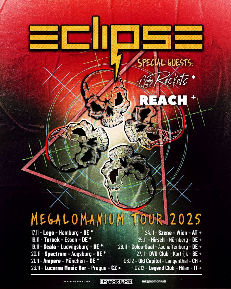 Die schwedischen Rock-Giganten ECLIPSE kehren endlich auf die Straße zurück und kündigen ihre brandneue Megalomanium Tour 2025 an. Eine Reise, die sie nach Deutschland, Österreich, Tschechien, Belgien, in die Schweiz und nach Italien führt – mehr als nur eine Konzertreihe, sondern ein Fest all dessen, was Eclipse zu einer der aufregendsten Rockbands unserer Zeit macht.