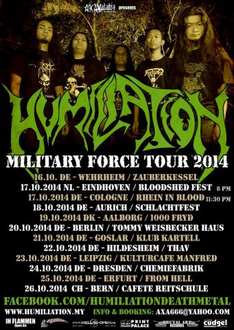 HUMILIATION machen sich aus dem fernen Malaysia auf, um ein dreckiges Dutzend Gigs in Europa zu spielen. Bereits vor zwei Jahren haben die Jungs mit ihrem Old School Death Metal in kleinen Clubs begeistert. Die Supports werden wieder starke lokale Bands wie CASUS oder VIOLENT FRUSTRATION übernehmen.