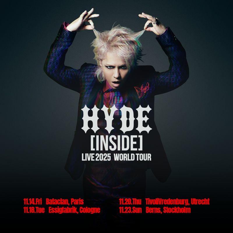HYDE hat vier weitere Termine für seine HYDE [INSIDE] LIVE 2025 WORLD TOUR angekündigt. Die neuen Tourneestationen sind Frankreich, Deutschland, die Niederlande und Schweden. Es ist HYDEs erster Auftritt in dieser Region seit der UK-Tournee seiner Band VAMPS im Jahr 2015. Dank zahlreicher begeisterter Anfragen aus aller Welt wird die Welttournee mit 24 Konzerten in 16 Städten die größte in HYDEs Karriere sein.