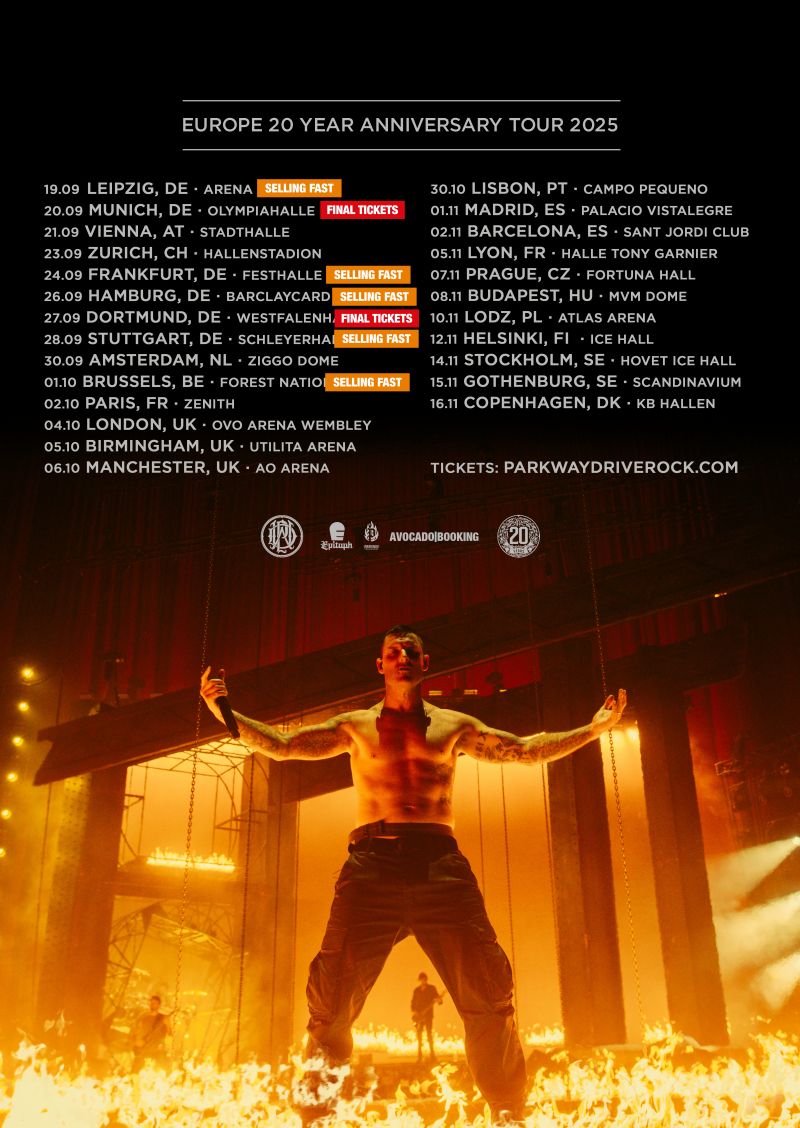 Die Veröffentlichung von „Sacred" erfolgt zu einem Zeitpunkt, an dem sich PARKWAY DRIVE auf ein Jahr voller Meilensteine vorbereiten. Das Jubiläumsjahr der Band wird mit der mit Spannung erwarteten "20 Year Anniversary Arena Tour" abgeschlossen, welche auch in zahlreichen deutschen Städten halt macht. Die Australier THY ART IS MURDER, ein Deathcore-Kraftpaket, und THE AMITY AFFLICTION, die für ihren emotionsgeladenen Post-Hardcore gefeiert werden, werden sie auf dieser bedeutenden und Maßstäbe setzenden Tour begleiten.