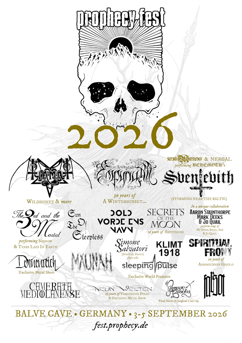 Die Feiertage stehen vor der Tür, und das Prophecy Fest präsentiert stolz vier neue Acts für 2026: In einer einzigartigen Kollaboration vereinen sich der legendäre Sänger Aaron Stainthorpe, Keyboarder Mark Deeks und Cellistin Jo Quail, um gemeinsam Songs von MY DYING BRIDE, ARÐ und eigene Stücke von Jo Quail zu performen. Als Label- und Festivalgründer Martin Koller die Demo der jungen dänischen Doom-Band MAUNAH erhielt, wurden sie nur wenige Stunden später gebucht – ein wirklich außergewöhnliches Ereignis. Für SPIRITUAL FRONT-Frontmann Simone Salvatori ist ein Soloauftritt ungewöhnlich, aber er wird nächstes Jahr in Balve stattfinden! Und NEUN WELTEN werden dem Prophecy Fest gleich zwei besondere Momente bescheren: Sie feiern 20 Jahre „Vergessene Pfade“ und spielen außerdem ein exklusives Metal-Set!