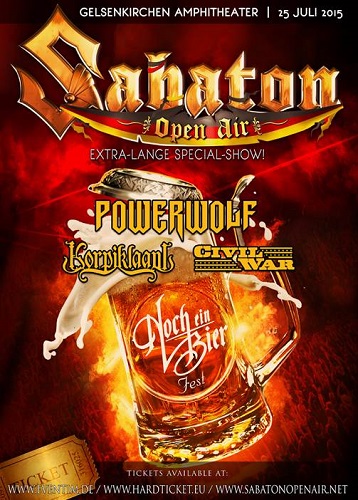 Seit geraumer Zeit haben SABATON bereits Pläne für ein spezielles und total einzigartiges Event in Deutschland, welche jetzt in die Tat umgesetzt wird. Im Juli werden sie mit dem 'Sabaton Open Air/Noch ein Bier Fest' ein Headliner-Konzert auf die Beine stellen, das mit Sicherheit eine einzigartige Show für die Besucher werden wird. Für dieses Konzert wurde das atemberaubende Amphitheater in Gelsenkirchen (bekannt durch das 'Rock Hard Festival') ausgewählt. Als Support werden SABATON auf Bitten ihrer Fans sowohl ihre ehemaligen Tour-Kollegen POWERWOLF und KORPIKLAANI als auch ihre alten Bandmitglieder CIVIL WAR im Gepäck haben.