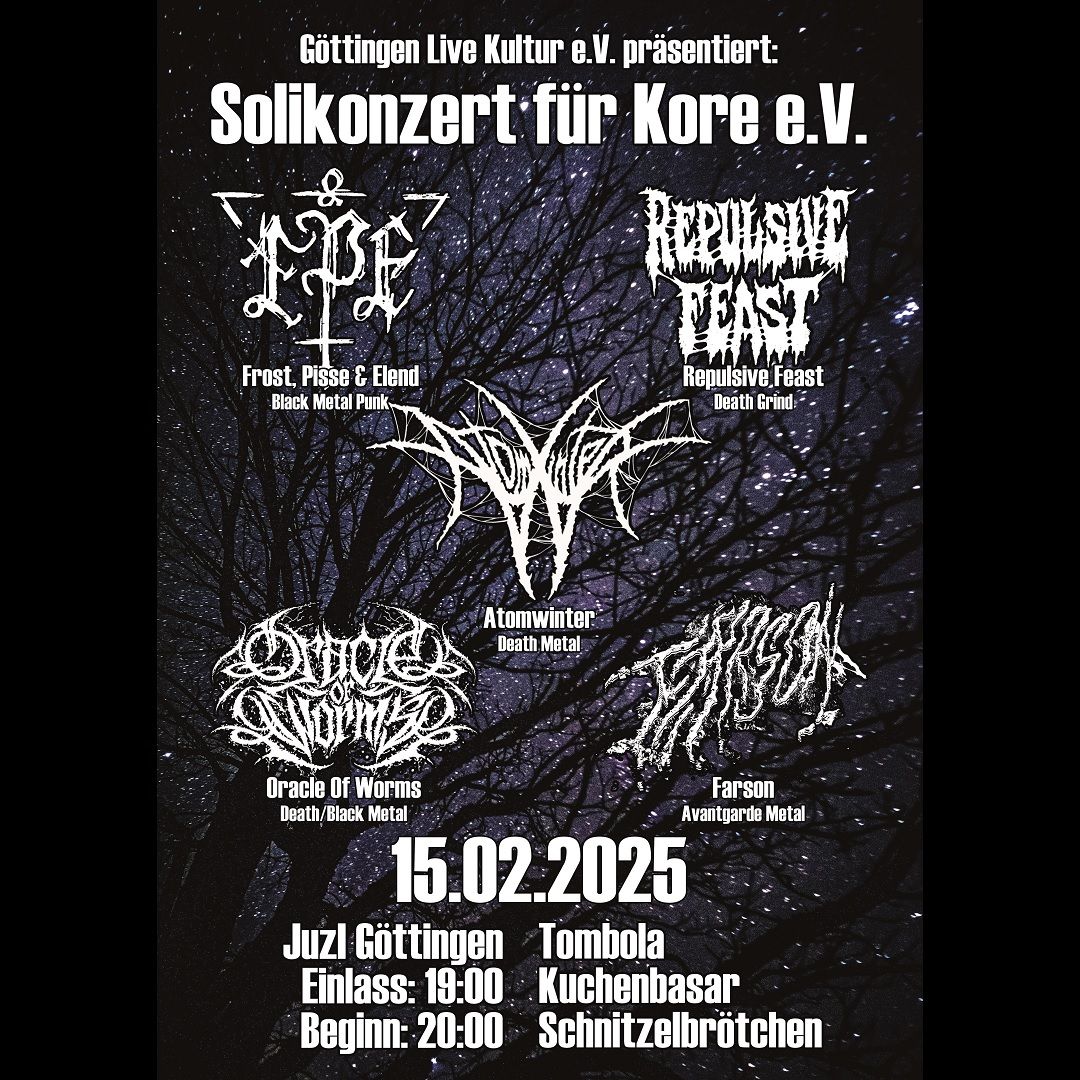 Soli-Konzert für den Kore e. V. im JuzI Göttingen mit ATOMWINTER, REPULSIVE FEAST, FROST PISSE UND ELEND, ORACLE OF WORMS & FARSON
