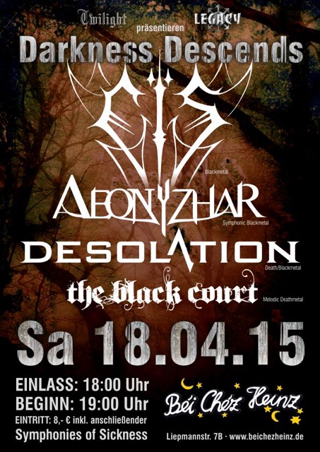 Angeführt wird das Line-Up von EïS aus Bielefeld, die mit ihrem letzten Album "Wetterkreuz" landauf landab Topnoten eingeheimst und die Messlatte für deutschsprachigen Black Metal gehörig erhöht haben. Daneben werden gleich drei Bands die lokale Szene vertreten. AEONYZHAR bieten seit fast 10 Jahren nun schon symphonischen Black und Death Metal und haben sich spätestens mit dem 2012er Demo "Liberation" einen Platz unter den Top-Bands der regionalen Metal-Szene erspielt. Sogar noch länger dabei sind DESOLATION, die sich bereits 1994 gründeten und 2013 mit "Desoriented" ihre vierte Scheibe vorlegten, auf der sie gekonnt melodischen Death und Black Metal darbieten. Als Opener spielen THE BLACK COURT, die ihren Melodic Death passend zum Thema des Abends gerne mal mit dem ein oder anderen Blastbeat schmücken und bei "Darkness Descends" feierlich ihre zweite EP veröffentlichen wollen.