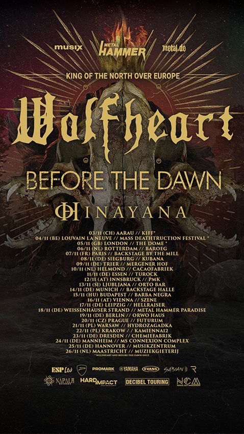 Im Herbst 2023 werden Europa und Großbritannien eine Death Metal Tour der Extravaganz erleben, die ein einzigartiges Ereignis darstellen wird. Die Finnische Winter Metal Formation WOLFHEART wird sich auf ihre erste Headlinertour begeben. Als ob das für sich nicht genug wäre, wird die Konzertreise die wiedervereinigten, ebenfalls aus Finnland stammenden Death Metaller BEFORE THE DAWN mit an Bord haben. Dies wird die seltene Gelegenheit darstellen Mastermind Tuomas Saukkonnen zwei Sets pro Abend spielen zu sehen, bei denen er Vergangenheit und Gegenwart miteinander verbindet und sein Schaffen in die Zukunft trägt. Das Tour Paket wird auch die aus Texas stammenden Melodic Death Band HINAYANA in seinen Reihen haben.