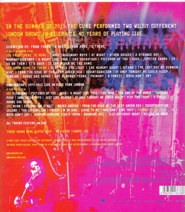 Und deshalb erfreuen uns die Mannen um ROBERT SMITH jetzt mit einer wahren Veröffentlichungsorgie. Da wären zum einen die beiden Sets „Curaetion 25: From There To Here/ From Here To There“. Dabei handelt es sich um Ton und Videoaufnahmen, die 2018 auf der 25. Ausgabe des von Robert Smith persönlich kuratierten Meltdownfestivals entstanden sind. Das Besondere an den beiden Sets ist, dass sie aus jeweils einem Song der bisher dreizehn Studioalben sowie einem neuen Track bestehen, und zwar in chronologischer Reihenfolge zunächst von 1978 bis 2018 und dann wieder zurück.